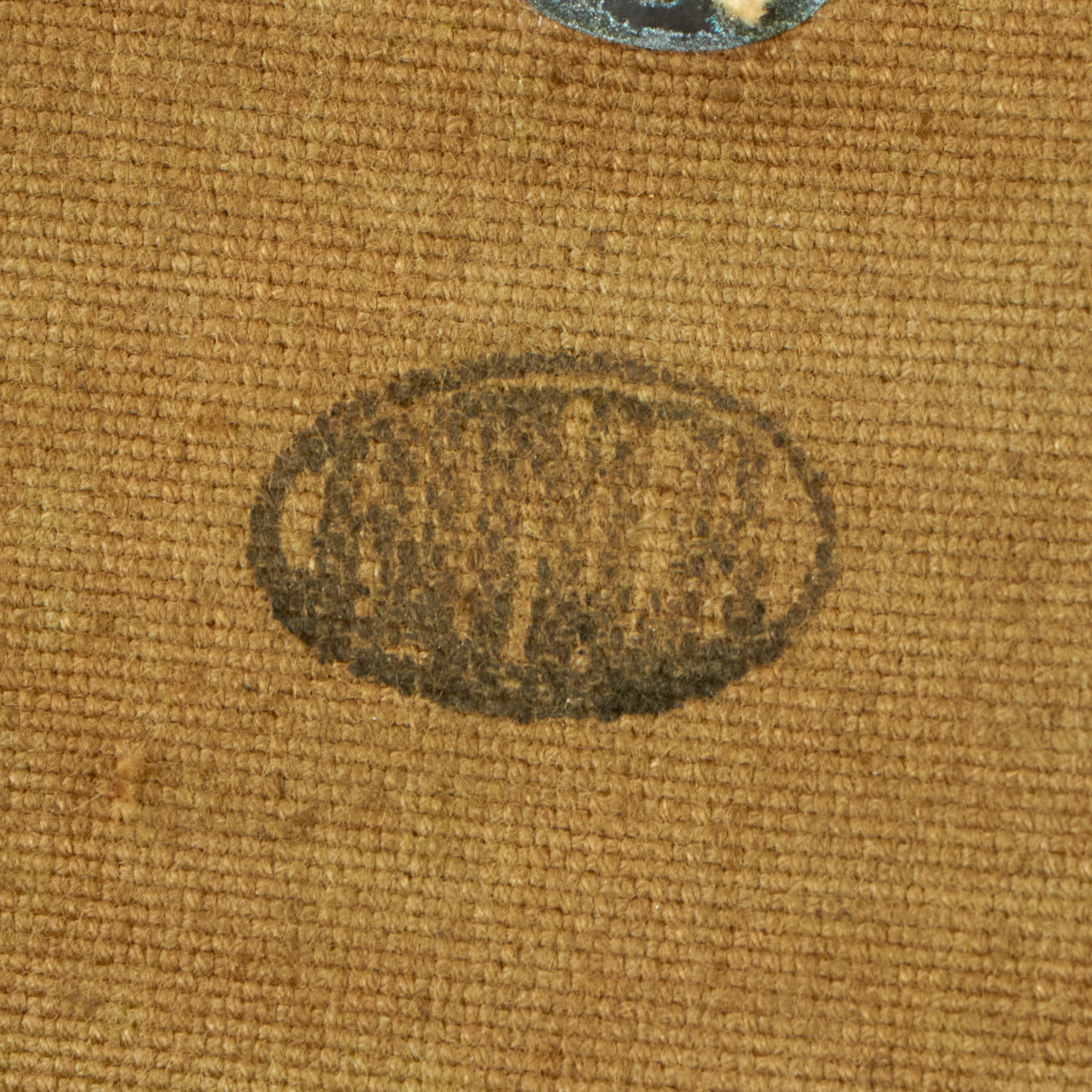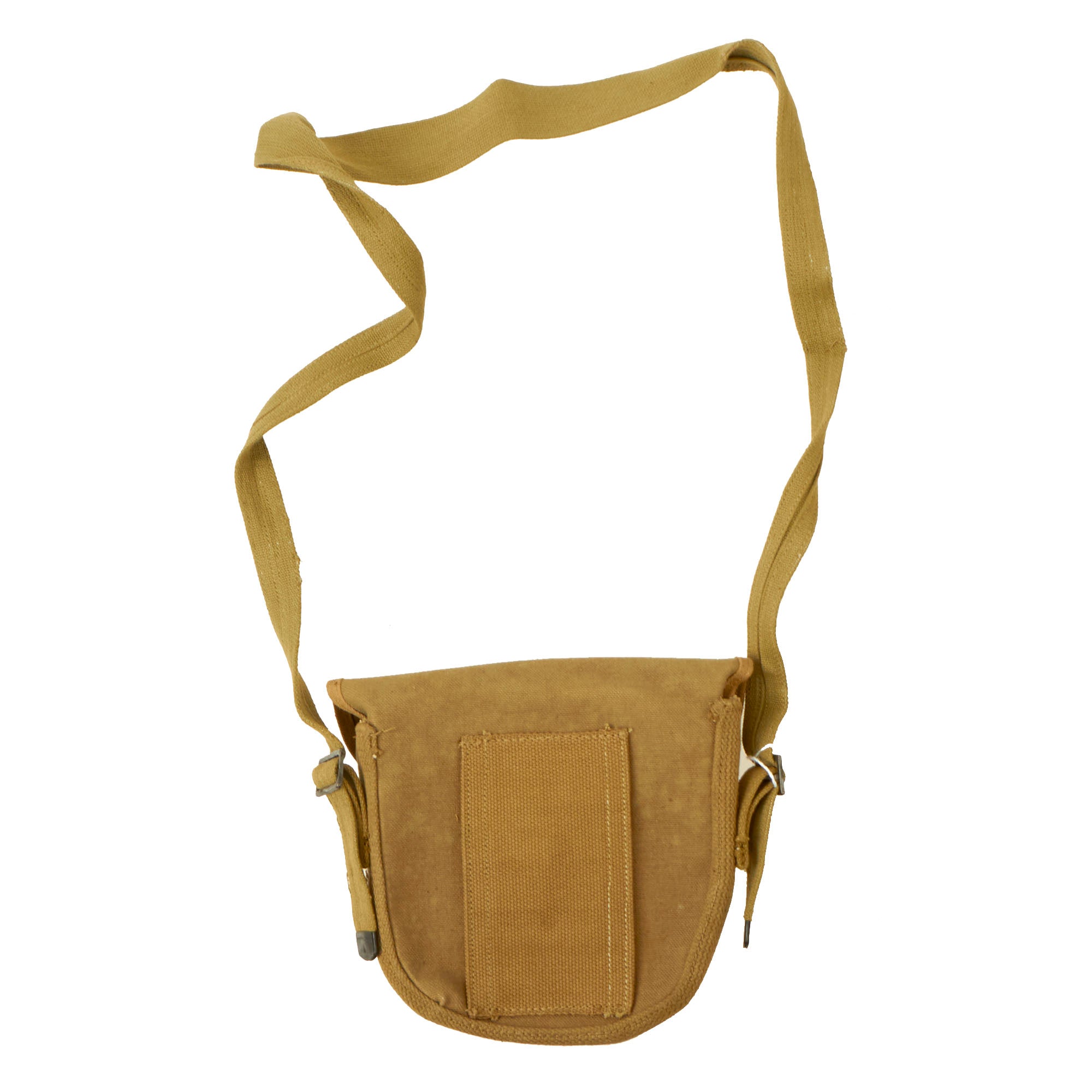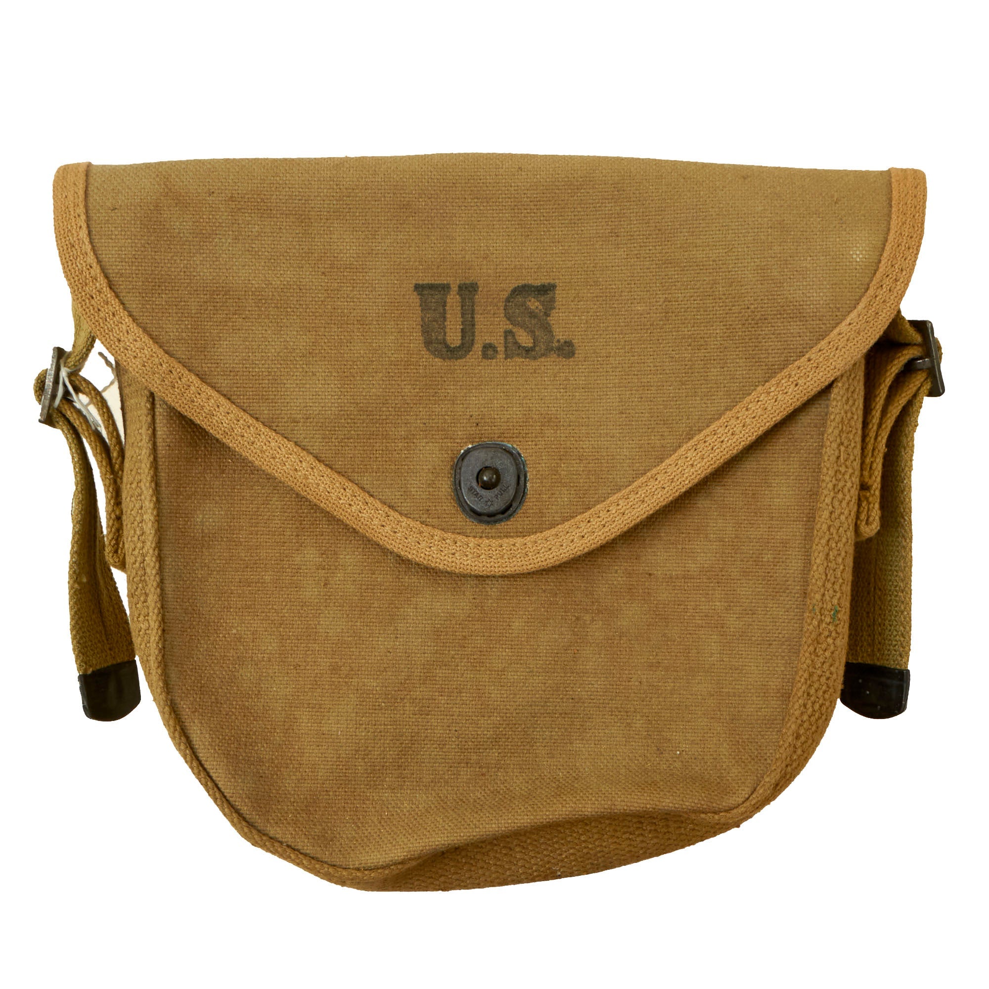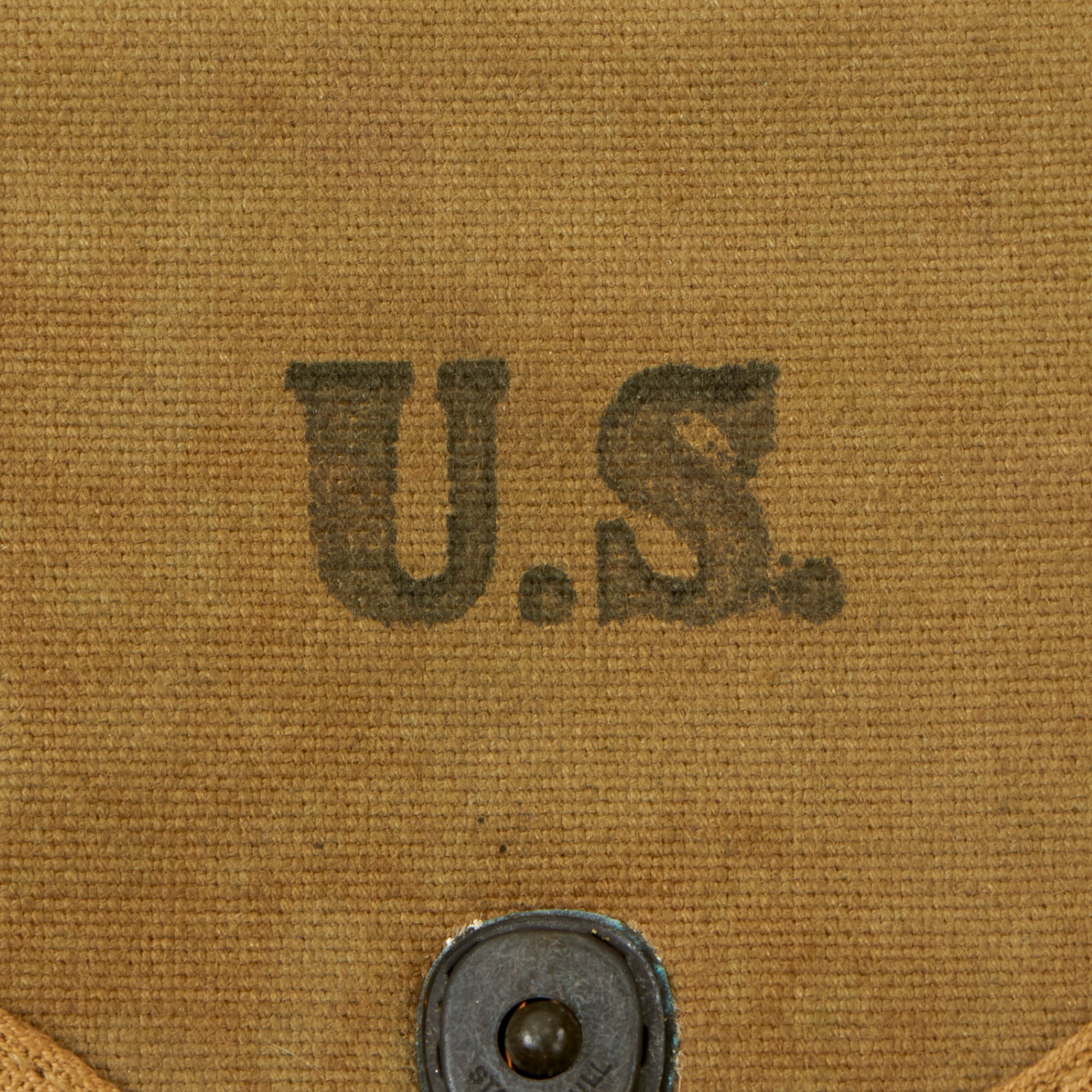 Original Items: Only One Available. This is a great example of an original U.S. military WW2 Army issue pouch for the Thompson Submachine Gun. Composed of khaki web with black steel hardware. Designed to hold a 50 rd Thompson SMG drum magazine, and comes complete with an over-the-shoulder carry strap and has the correct lift-the-dot snap. A hard to find accessory that will offer a safe place for those increasingly expensive and rare Thompson drum magazines!This example is marked under the flap with an ovular maker’s logo that we do not recognize. A good opportunity for further research.Comes ready for further research and display.