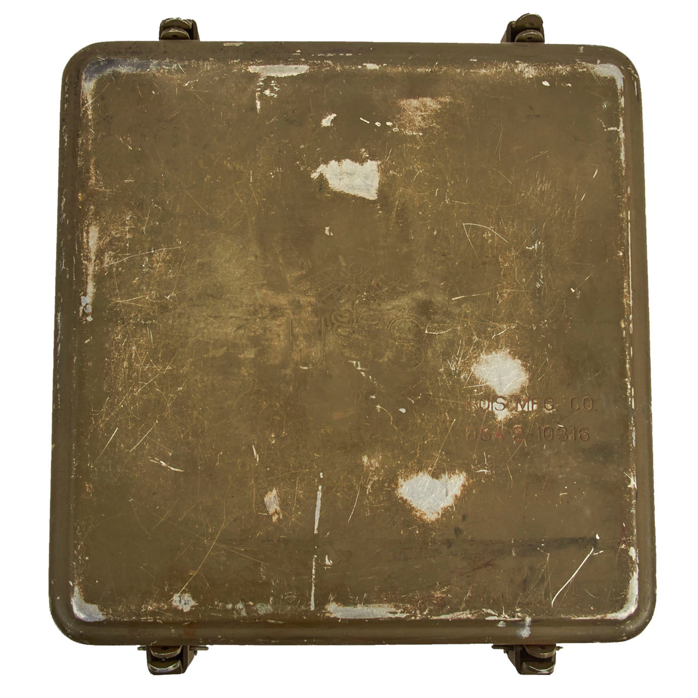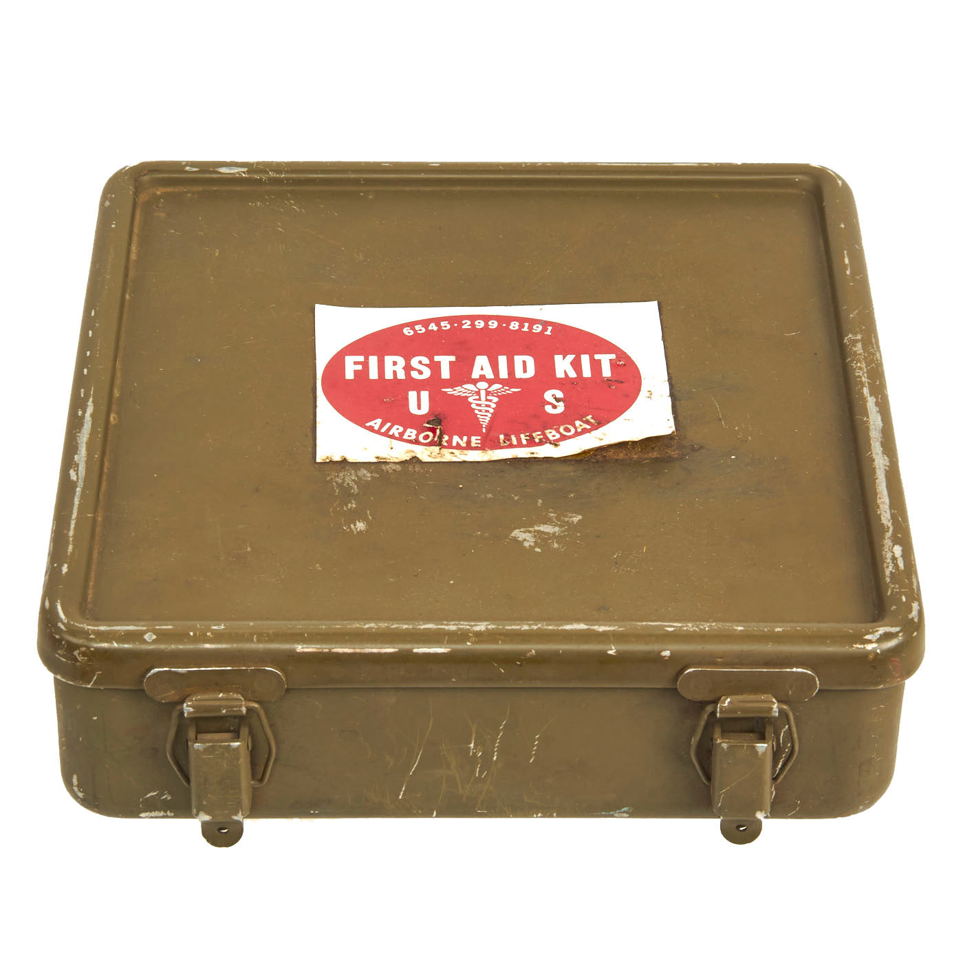 The inside lid of the box still retains the original “Instructions For Use, First Aid Kit, Airborne Lifeboat” sticker and is fully legible. The outside lid still retains the Airborne Lifeboat First Aid sticker but is partially detached from the surface. Almost all of the original OD green paint remains intact and all clips, buckles and handles are present and fully functional.