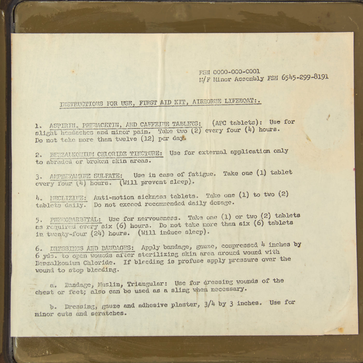 This kit was located inside of the A-1 Lifeboat. The A-1 lifeboat was a powered lifeboat that was made to be dropped by fixed-wing aircraft into water to aid in air-sea rescue operations. The sturdy airborne lifeboat was to be carried by a heavy bomber specially modified to handle the external load of the lifeboat. The A-1 lifeboat was intended to be dropped by parachute during Dumbo missions to land within reach of the survivors of an accident on the ocean, specifically airmen survivors of an emergency water landing.
