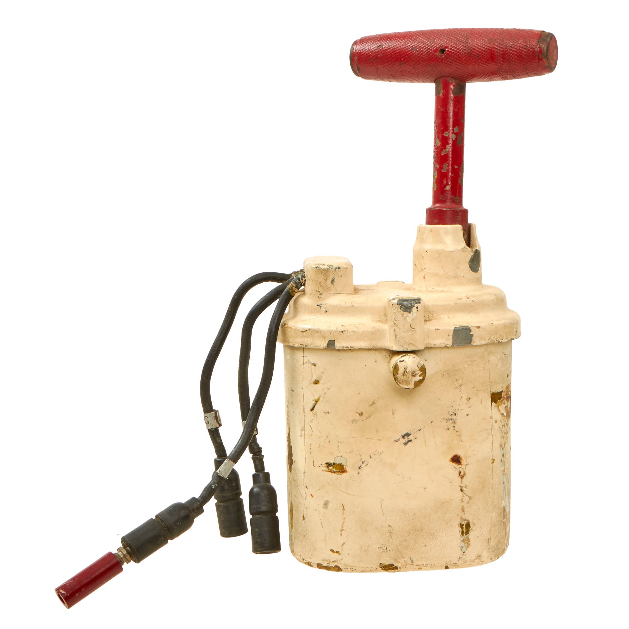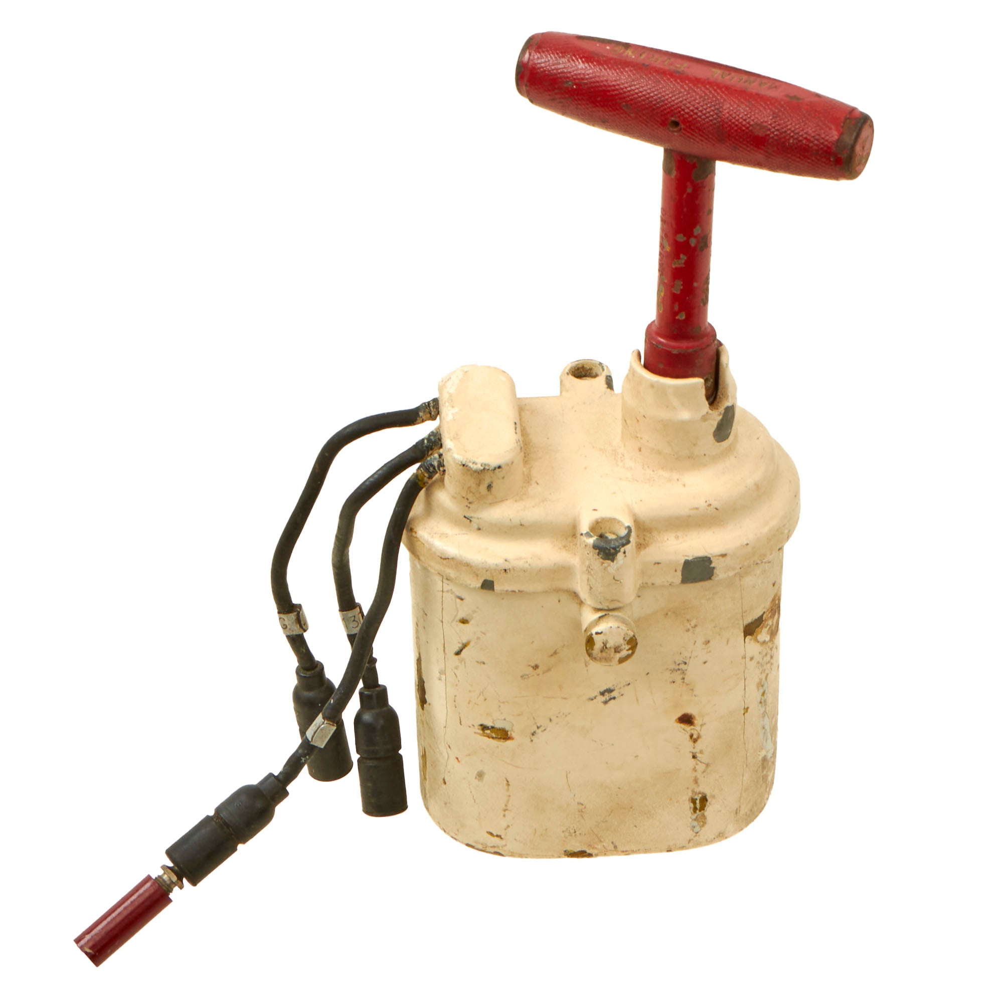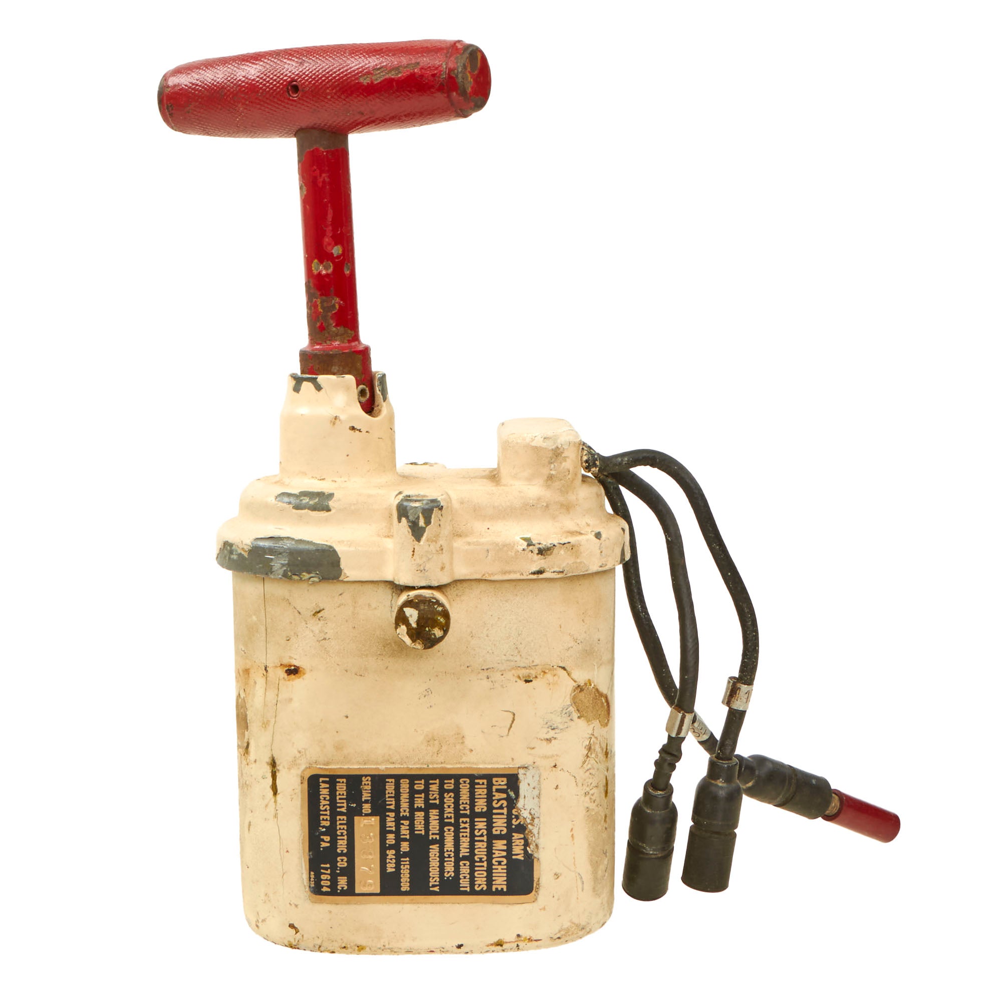 Original Item: Only One Available. This is an original Vietnam War U.S. Army “10 Cap” Blasting Machine, complete with the original handle. The design is very similar to the WWII examples. During World War II, many of these were used by demolition crews on D-day to destroy the many obstacles on French beaches that had been set up during years of German occupation. The paint of this particular example indicates it was actually intended to be used inside of the various tanks the US had fielded during the Vietnam War. While this can be used as a 10 Cap blasting machine, this was used for the main gun of the tank. In the event that the firing system failed, causing a mechanical misfire, this blasting machine could be attached to a certain connecting point and with a twist of the handle the round would be fired.