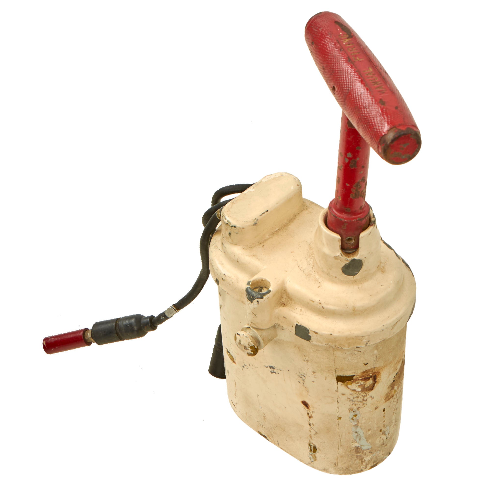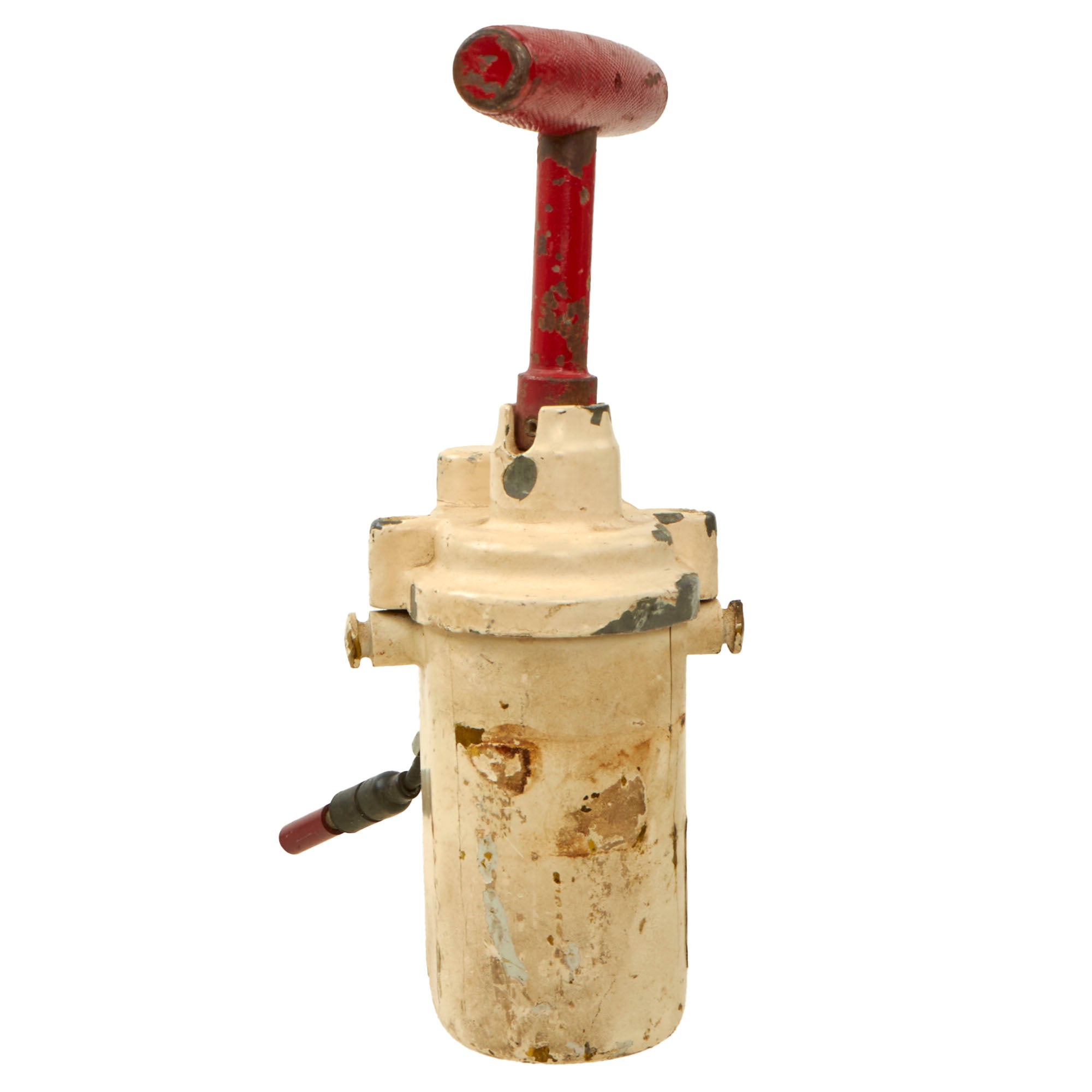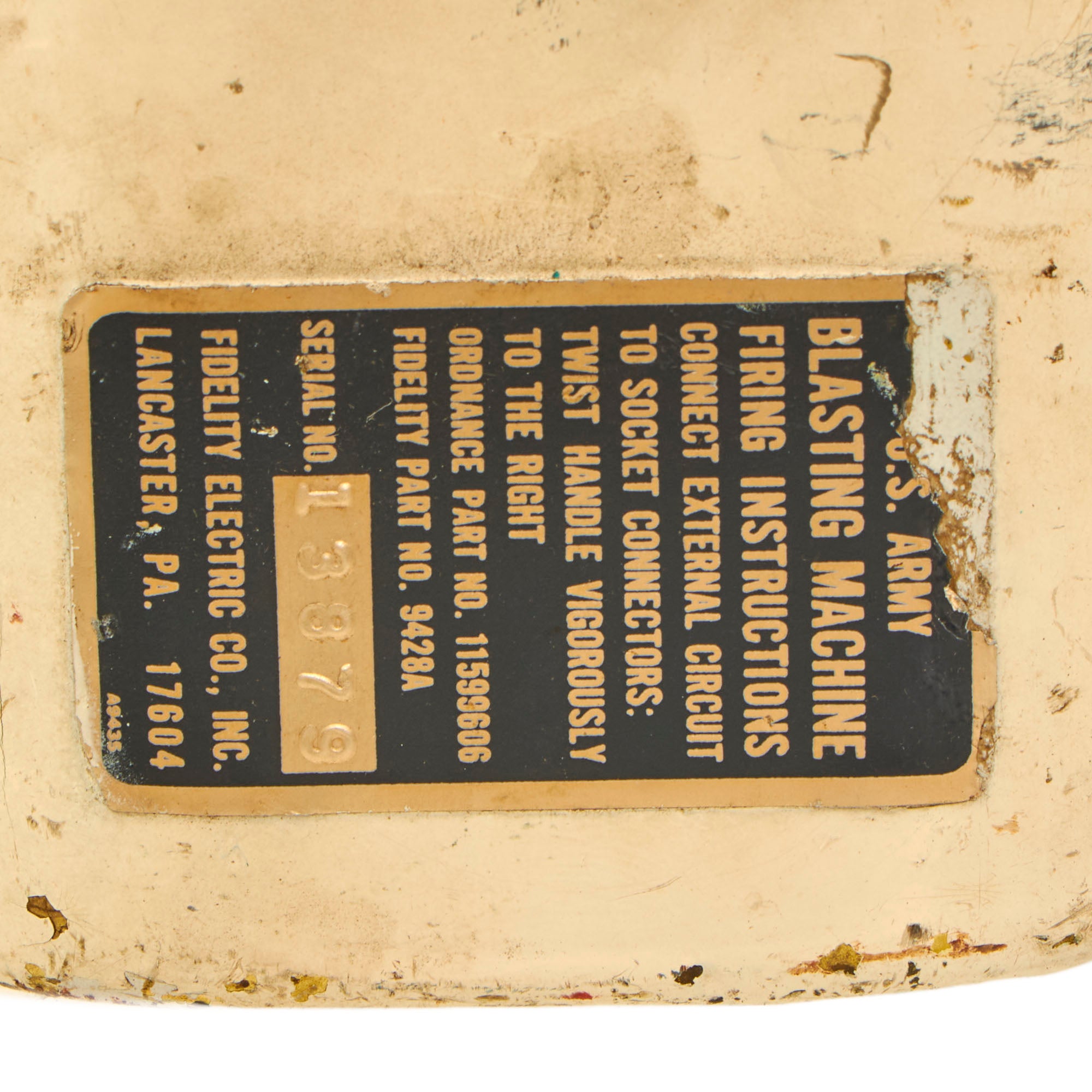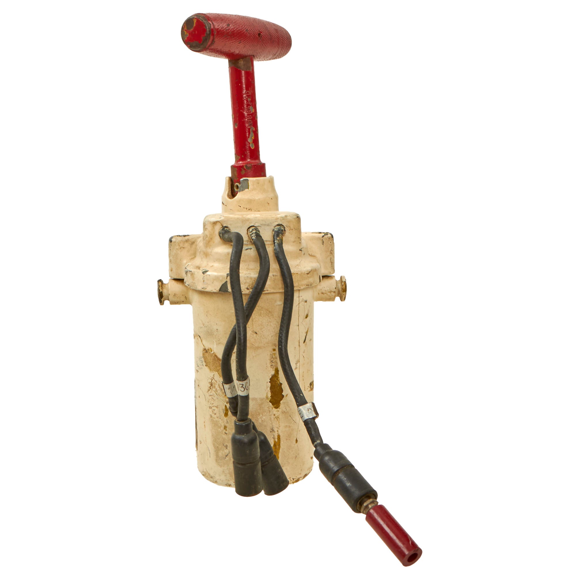 Original Item: Only One Available. This is an original Vietnam War U.S. Army “10 Cap” Blasting Machine, complete with the original handle. The design is very similar to the WWII examples. During World War II, many of these were used by demolition crews on D-day to destroy the many obstacles on French beaches that had been set up during years of German occupation. The paint of this particular example indicates it was actually intended to be used inside of the various tanks the US had fielded during the Vietnam War. While this can be used as a 10 Cap blasting machine, this was used for the main gun of the tank. In the event that the firing system failed, causing a mechanical misfire, this blasting machine could be attached to a certain connecting point and with a twist of the handle the round would be fired.