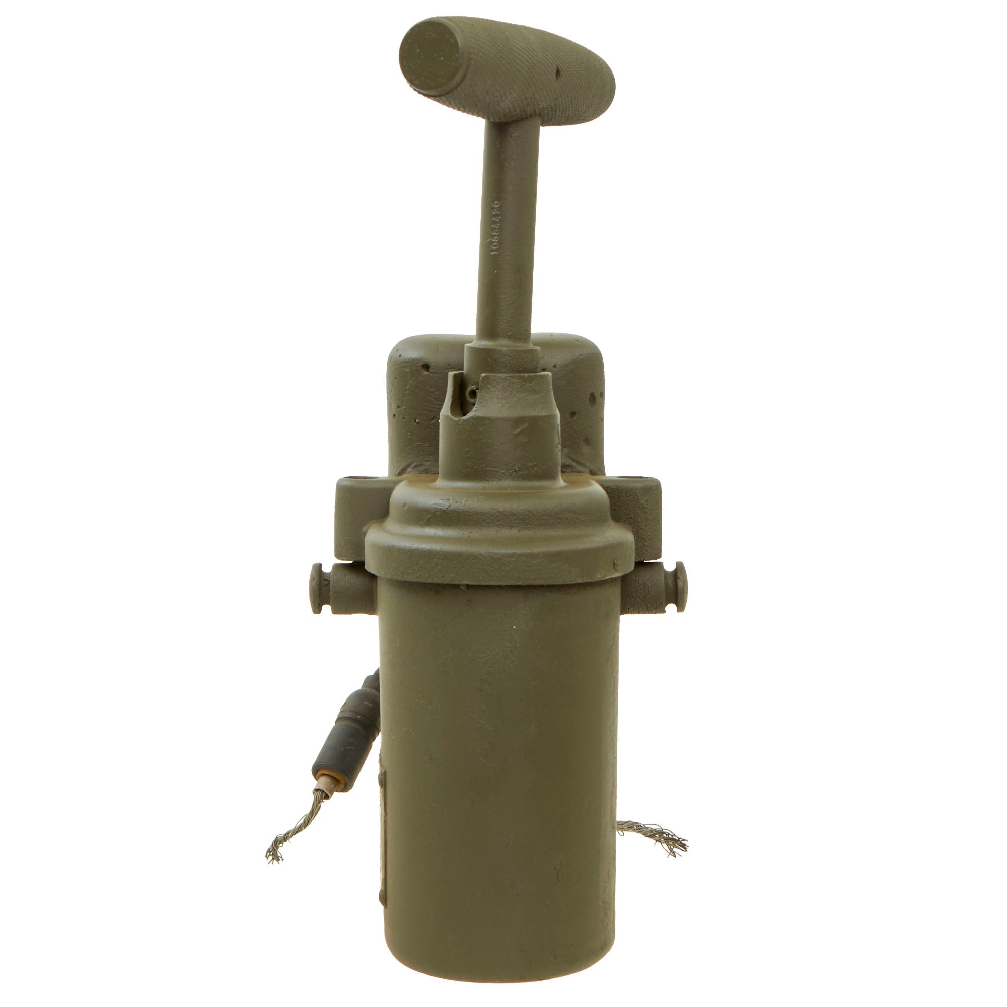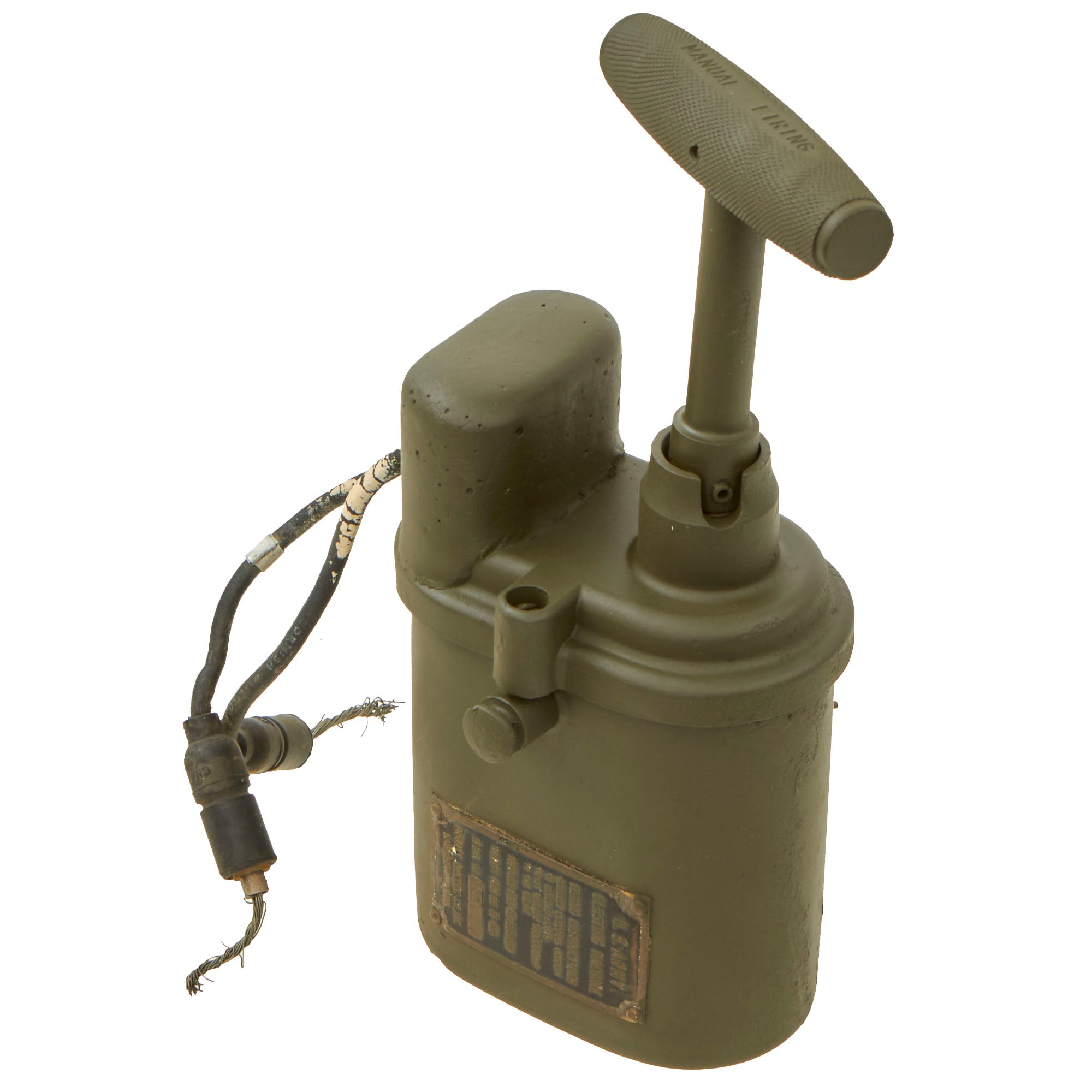 Original Item: Only One Available. This is an original WWII U.S. Army “10 Cap” Blasting Machine, complete with the original handle. Many of these were used by demolition crews on D-day to destroy the many obstacles on French beaches that had been set up during years of German occupation. This particular example however was actually intended to be used inside of the various tanks the US had fielded during WWII. While this can be used as a 10 Cap blasting machine, this was used for the main gun of the tank. In the event that the firing system failed, causing a mechanical misfire, this blasting machine could be attached to a certain connecting point and with a twist of the handle the round would be fired.
