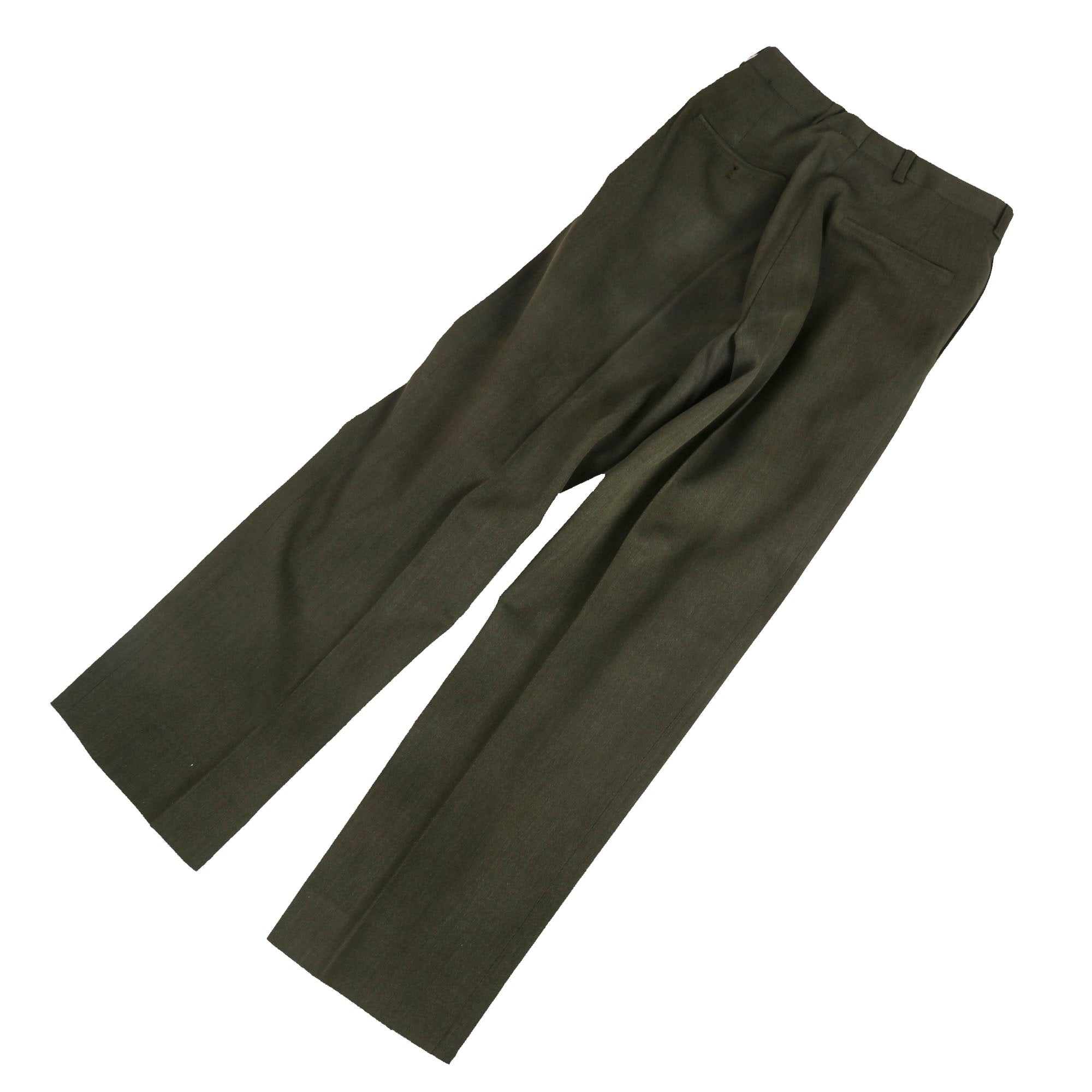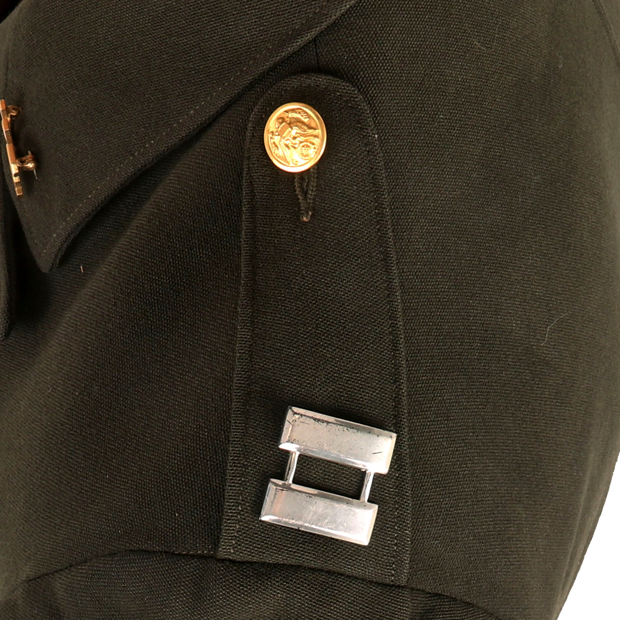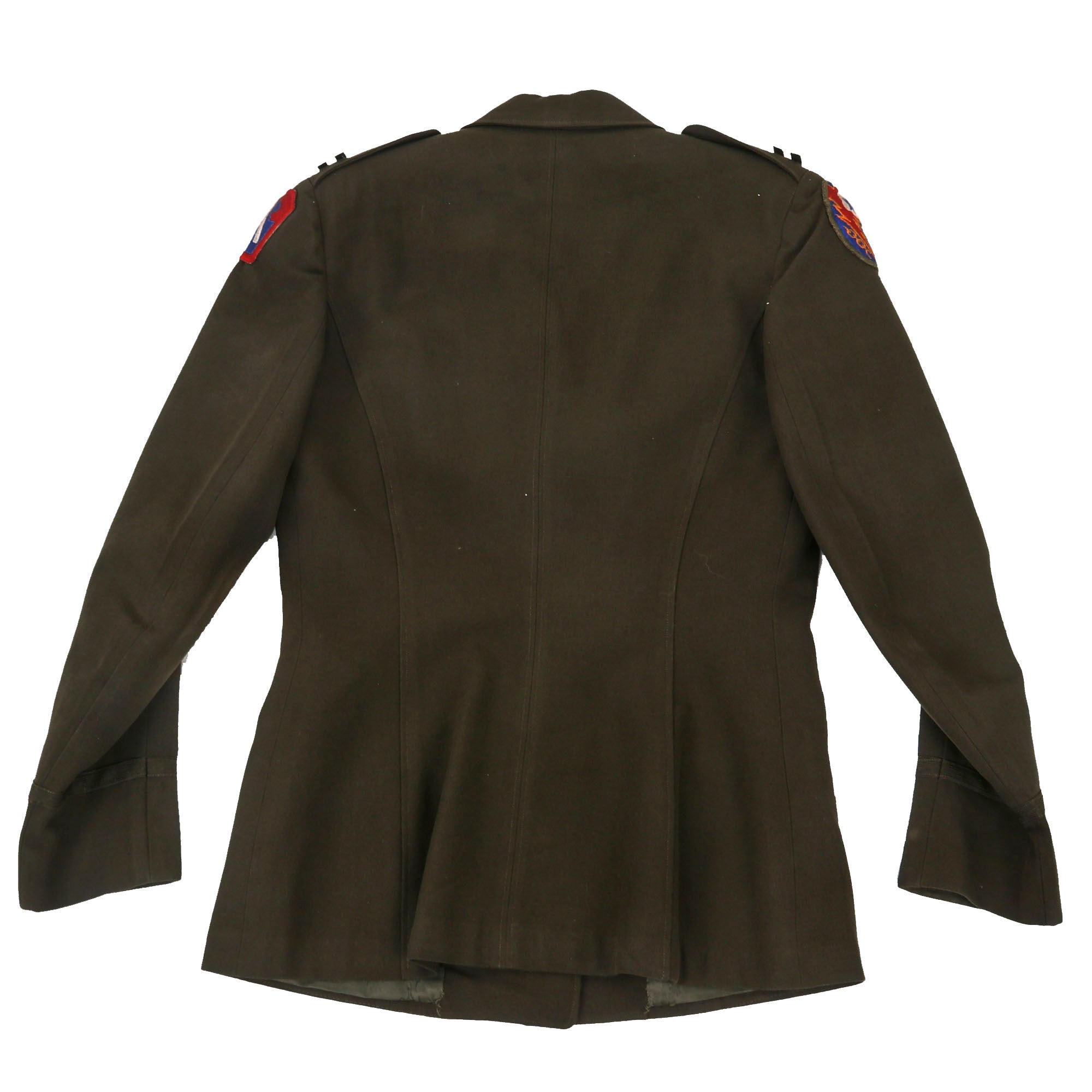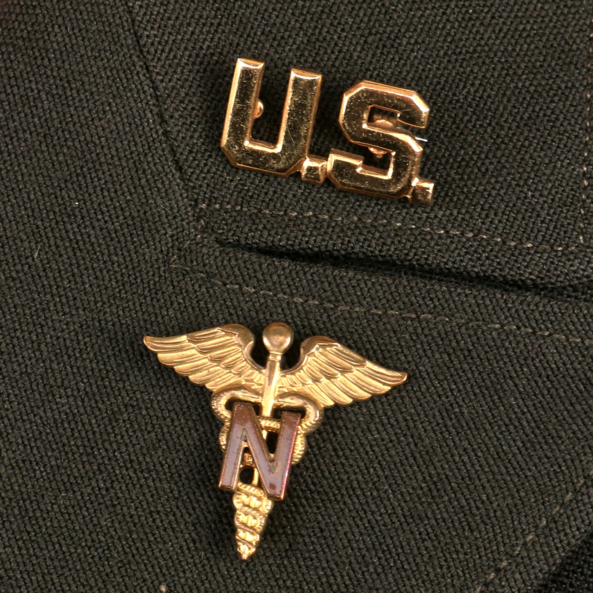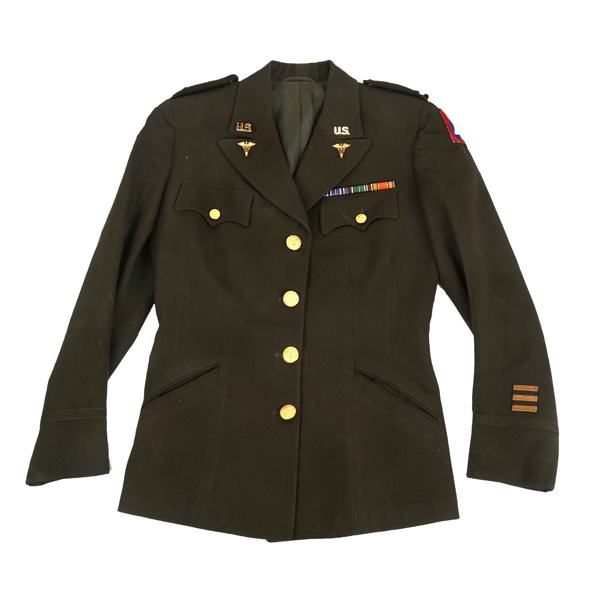 Original Item: Only One Available. This is a wonderful example of a 5th US Army Nurse Officer’s Class A uniform coat. This is one of the best examples we have seen! The male officer's winter service uniform in 1941 consisted of a four-button, four-pocket coat of finer wool fabric in olive drab shade no. 51 (OD 51), a very dark olive green with brownish hue. The coat was worn with a russet brown leather Sam Browne belt until 1942 when the leather belt was replaced by a cloth belt of matching fabric, which is unfortunately not present. Officers could wear trousers matching the color and fabric of the coat, or optionally they were allowed trousers of a contrasting pinkish pale taupe, officially called "drab shade no. 54", of the same material as the coat. The combination was commonly called "pinks and greens". Officers were also authorized to use the more durable OD 33 enlisted uniforms, except for the enlisted men's four pocket service coat, as long as they were not mixed with OD 51 or taupe clothing.