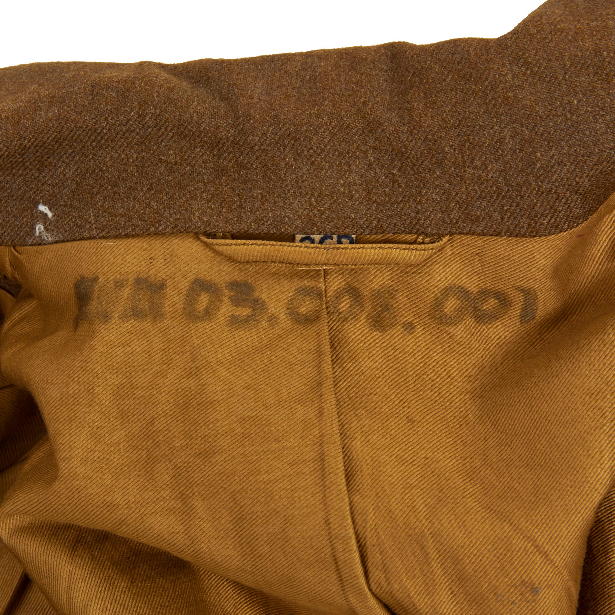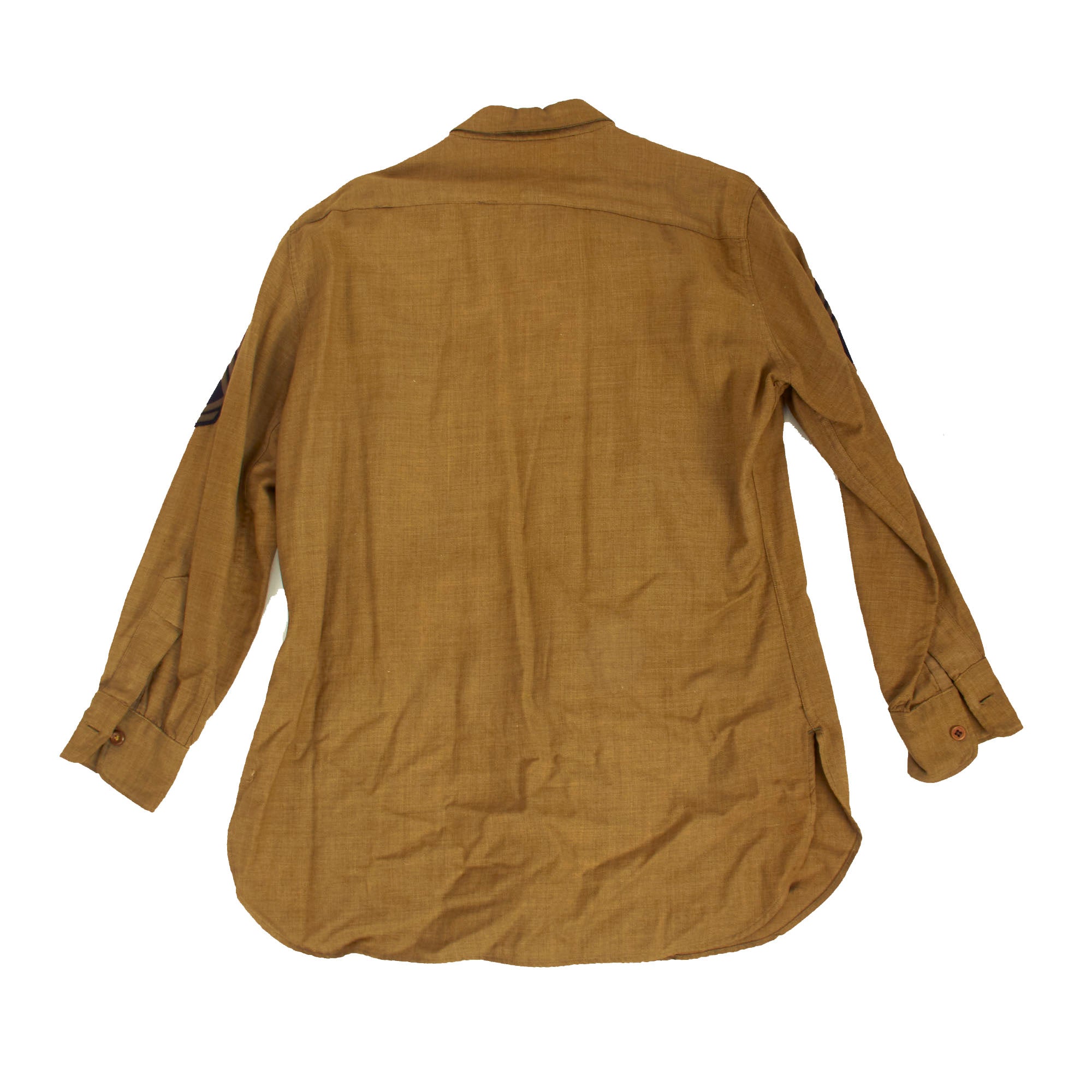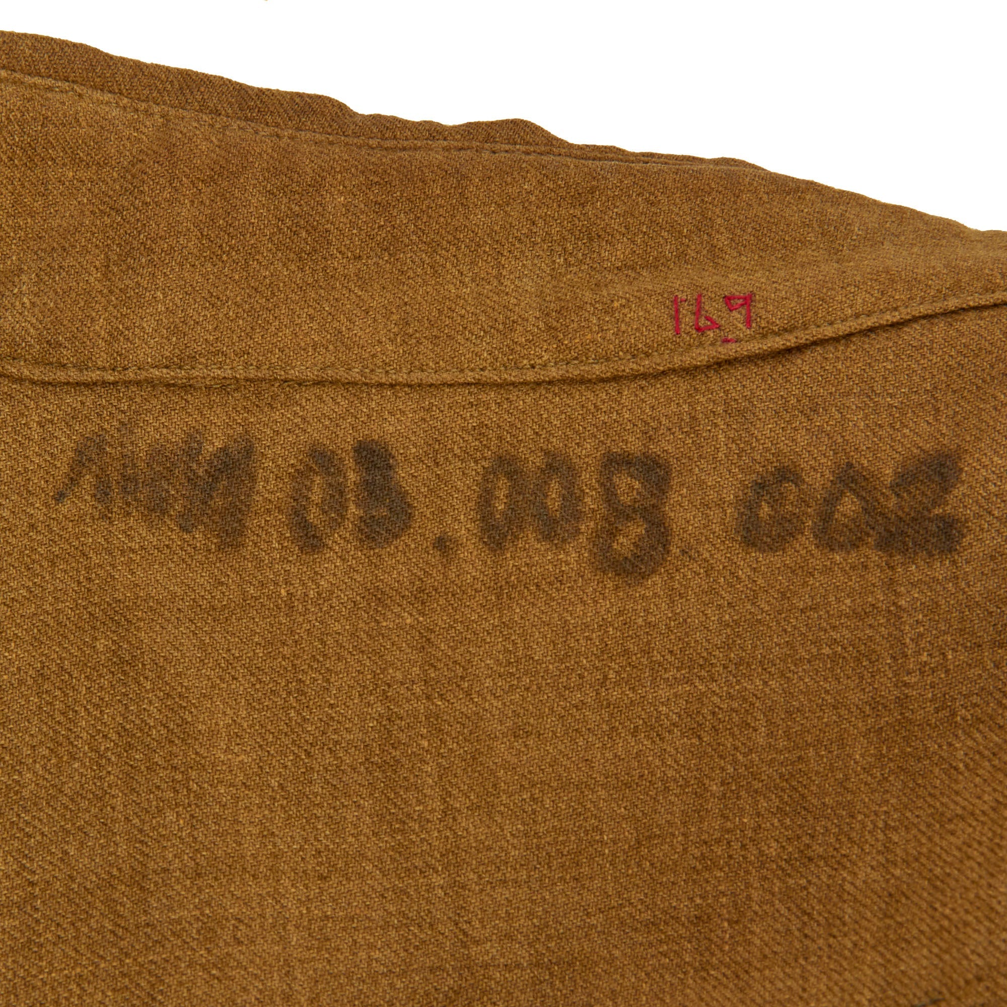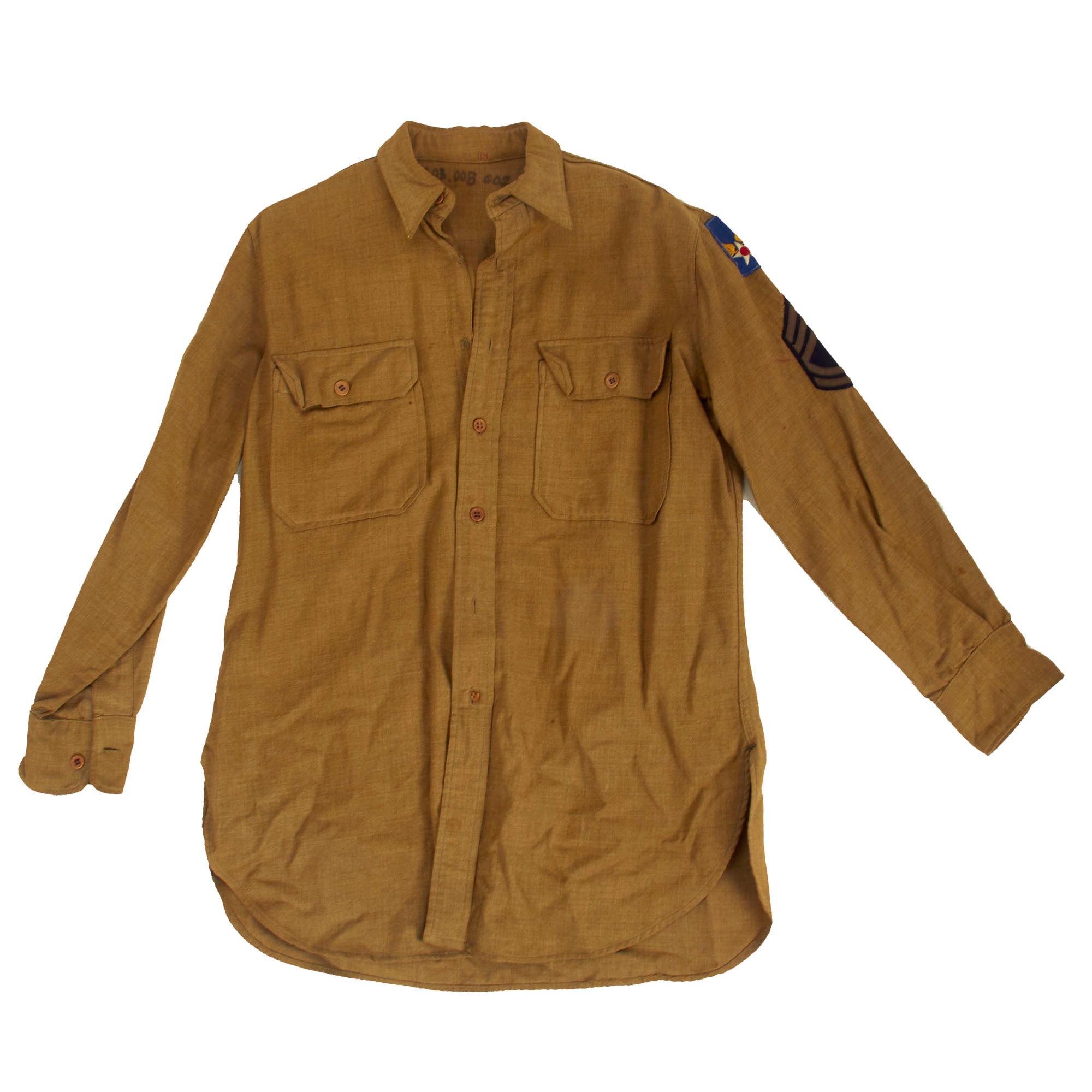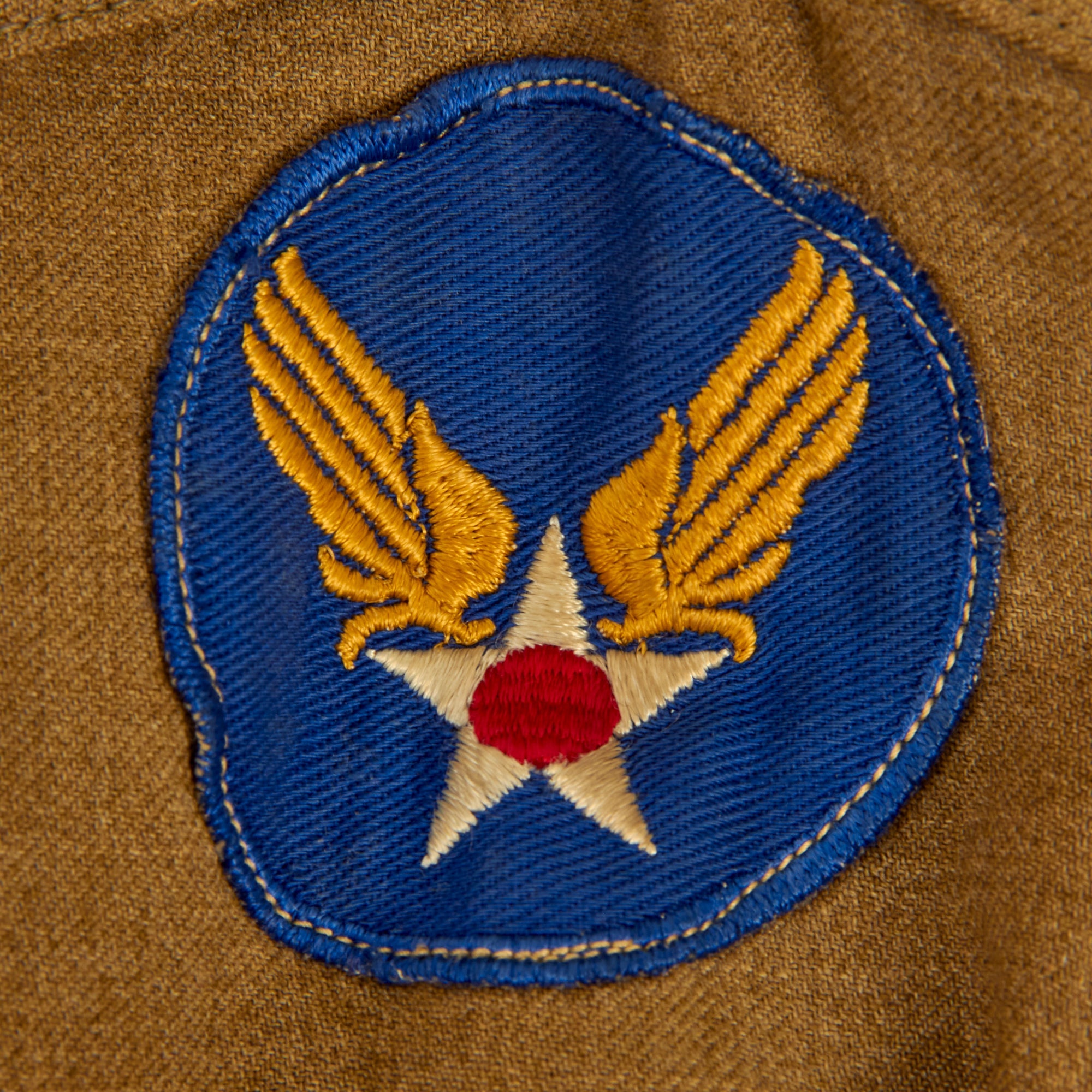 The jacket features a beautiful embroidered 8th Air Force shoulder sleeve insignia above a Sergeant First Class chevron which is also present on the right sleeve. The lower left sleeve has 5 overseas stripes indicating 2.5 years of overseas service. Below the overseas stripe is a single “hash” mark or service stripe. The lower left sleeve bears a “specialty” or “rating” insignia which is a blue triangle with a gold colored bomb. This patch is to signify that this SFC was an Armament Specialist Patch. The color features a single US collar disc with the left disc unfortunately missing. The left breast has a beautiful set of Crewman Wings just above an array of Wolf Brown ribbons for the EAME (5 Stars), American Defense and Army Good Conduct. The wool/flannel shirt is matched to the uniform with the same 8th AF insignia and chevrons as well as what appears to be a service number written on the backside interior, which is faded and difficult to read.