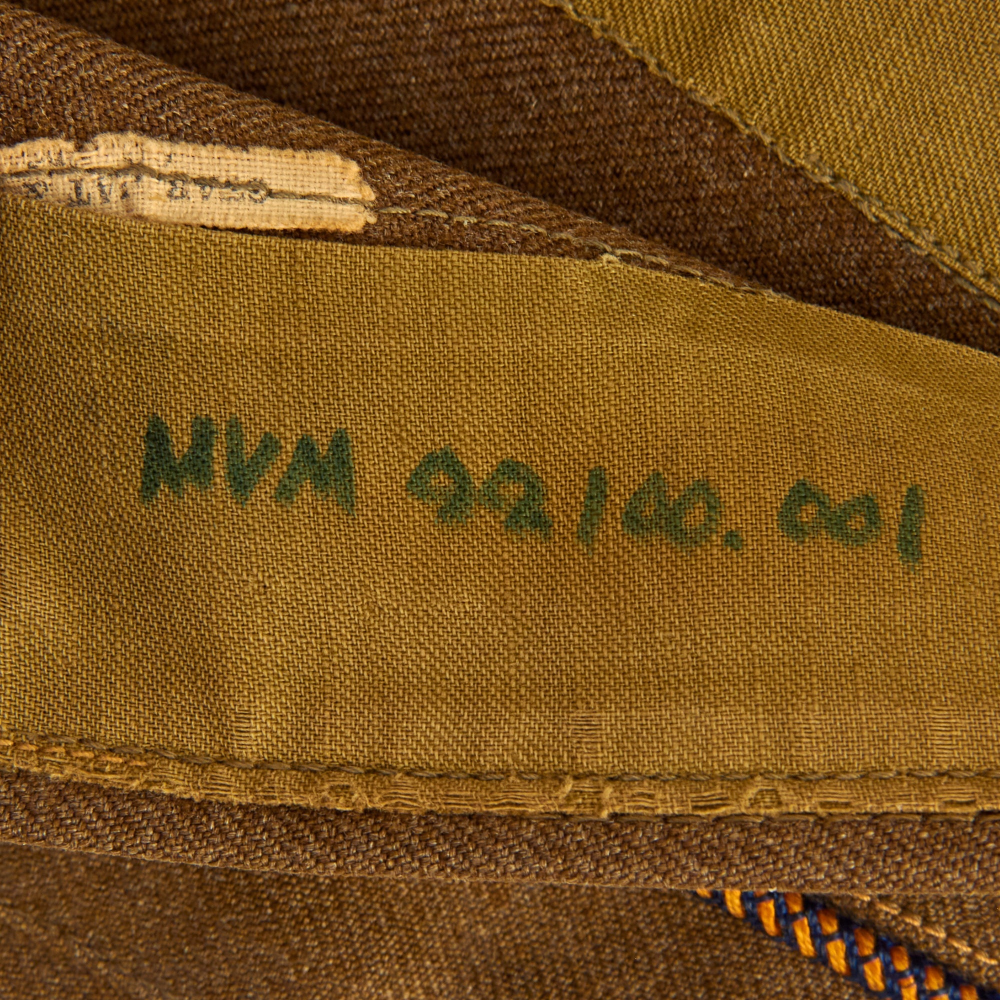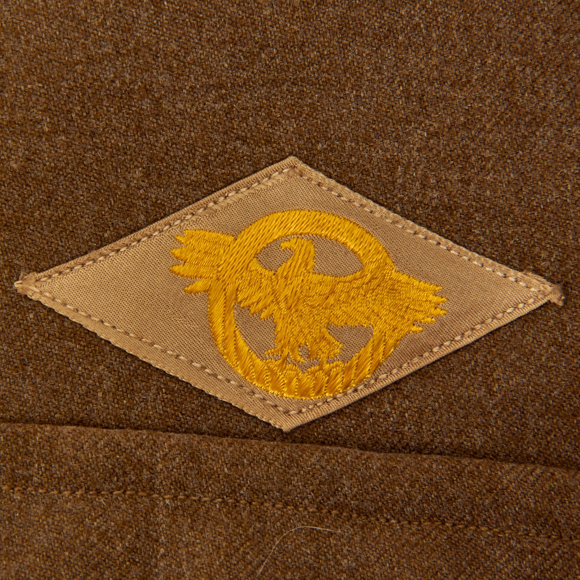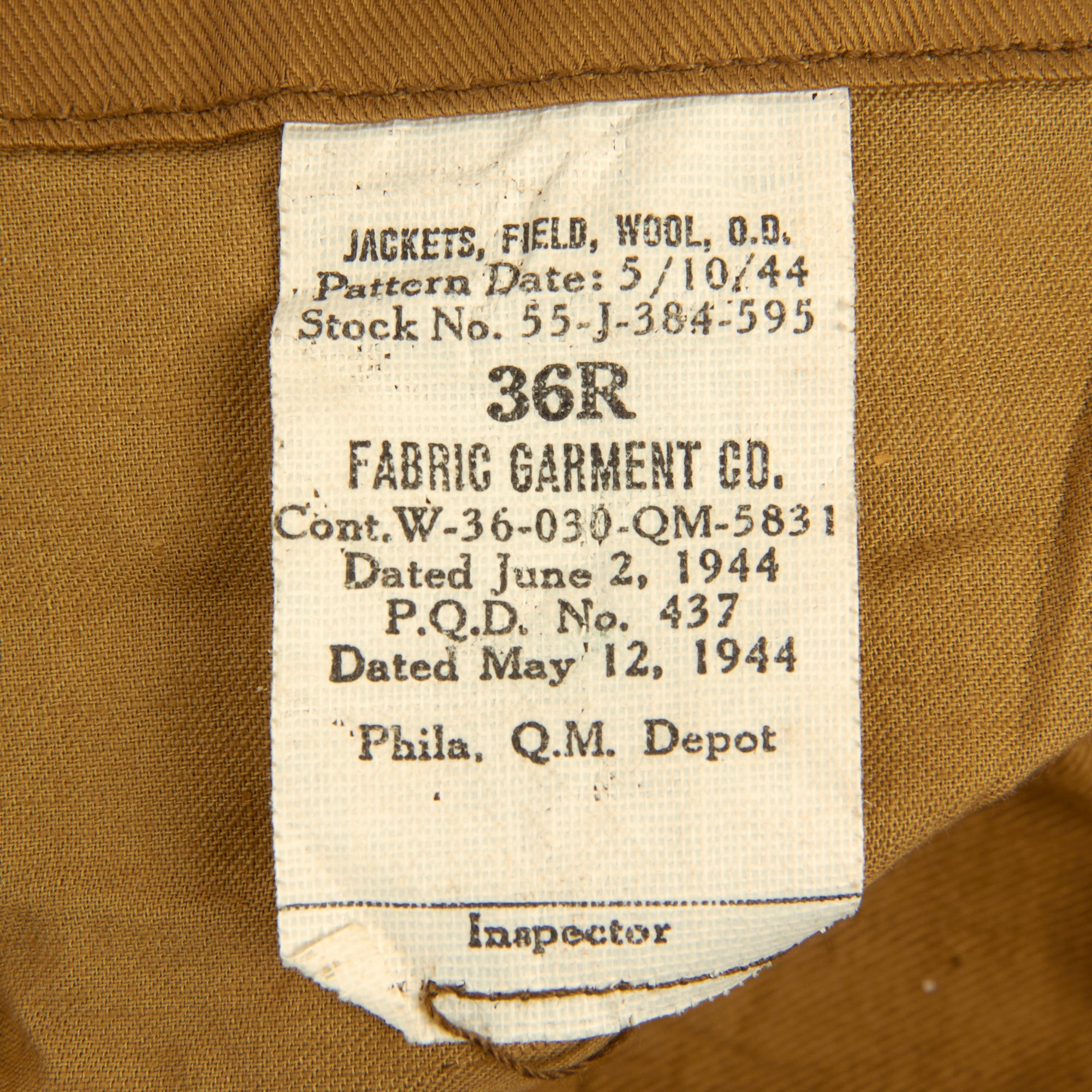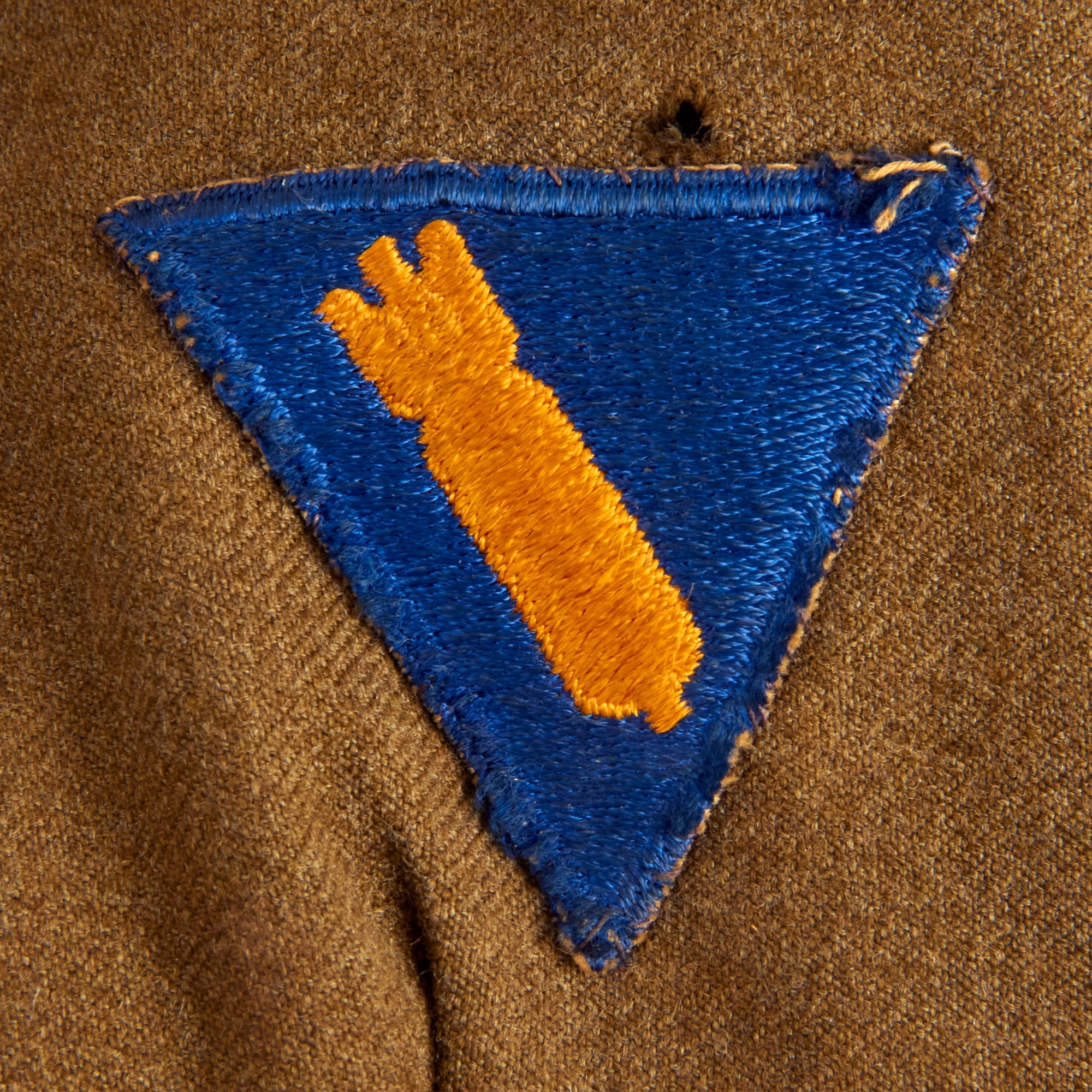 The jacket features a beautiful embroidered 8th Air Force shoulder sleeve insignia above a Sergeant First Class chevron which is also present on the right sleeve. The lower left sleeve has 5 overseas stripes indicating 2.5 years of overseas service. Below the overseas stripe is a single “hash” mark or service stripe. The lower left sleeve bears a “specialty” or “rating” insignia which is a blue triangle with a gold colored bomb. This patch is to signify that this SFC was an Armament Specialist Patch. The color features a single US collar disc with the left disc unfortunately missing. The left breast has a beautiful set of Crewman Wings just above an array of Wolf Brown ribbons for the EAME (5 Stars), American Defense and Army Good Conduct. The wool/flannel shirt is matched to the uniform with the same 8th AF insignia and chevrons as well as what appears to be a service number written on the backside interior, which is faded and difficult to read.