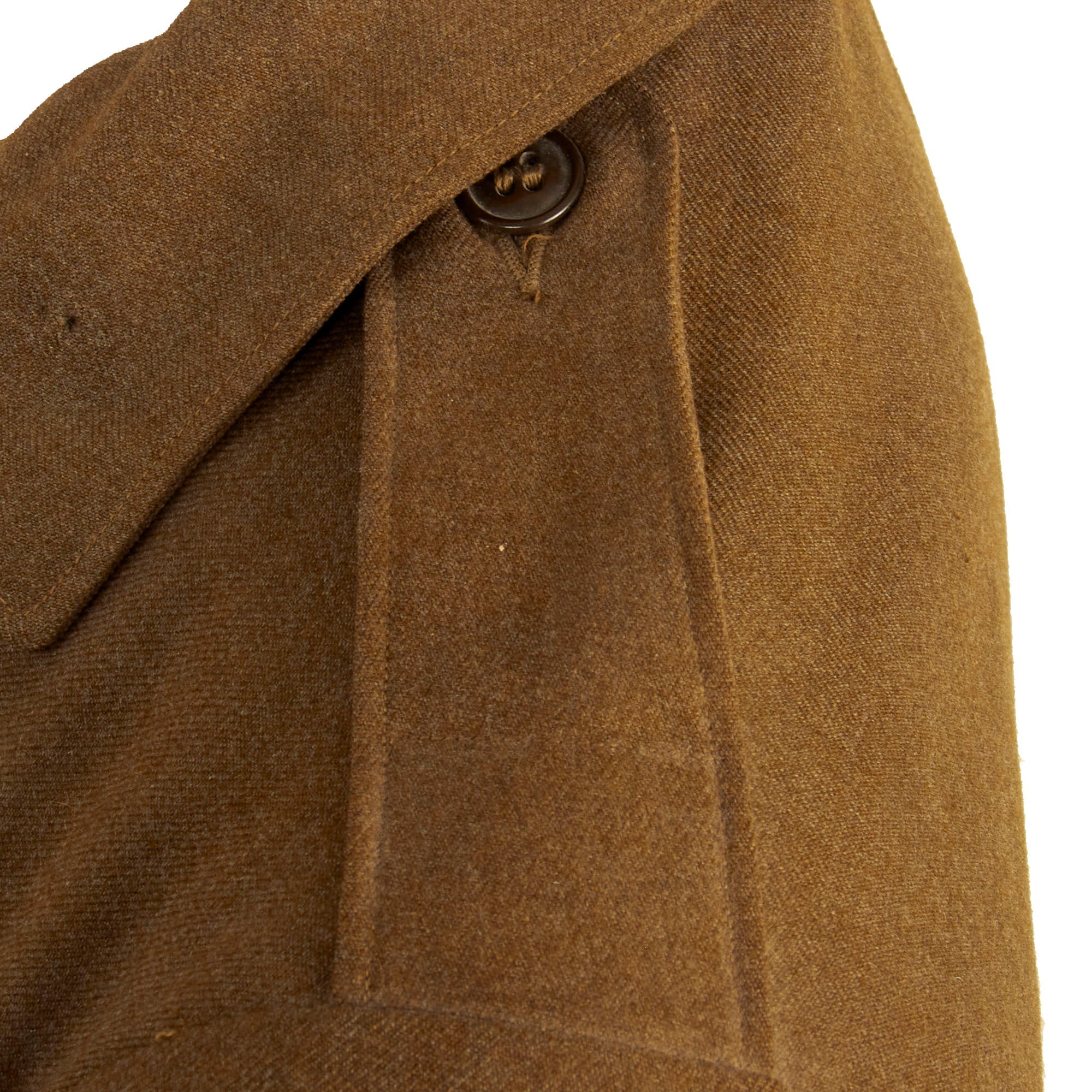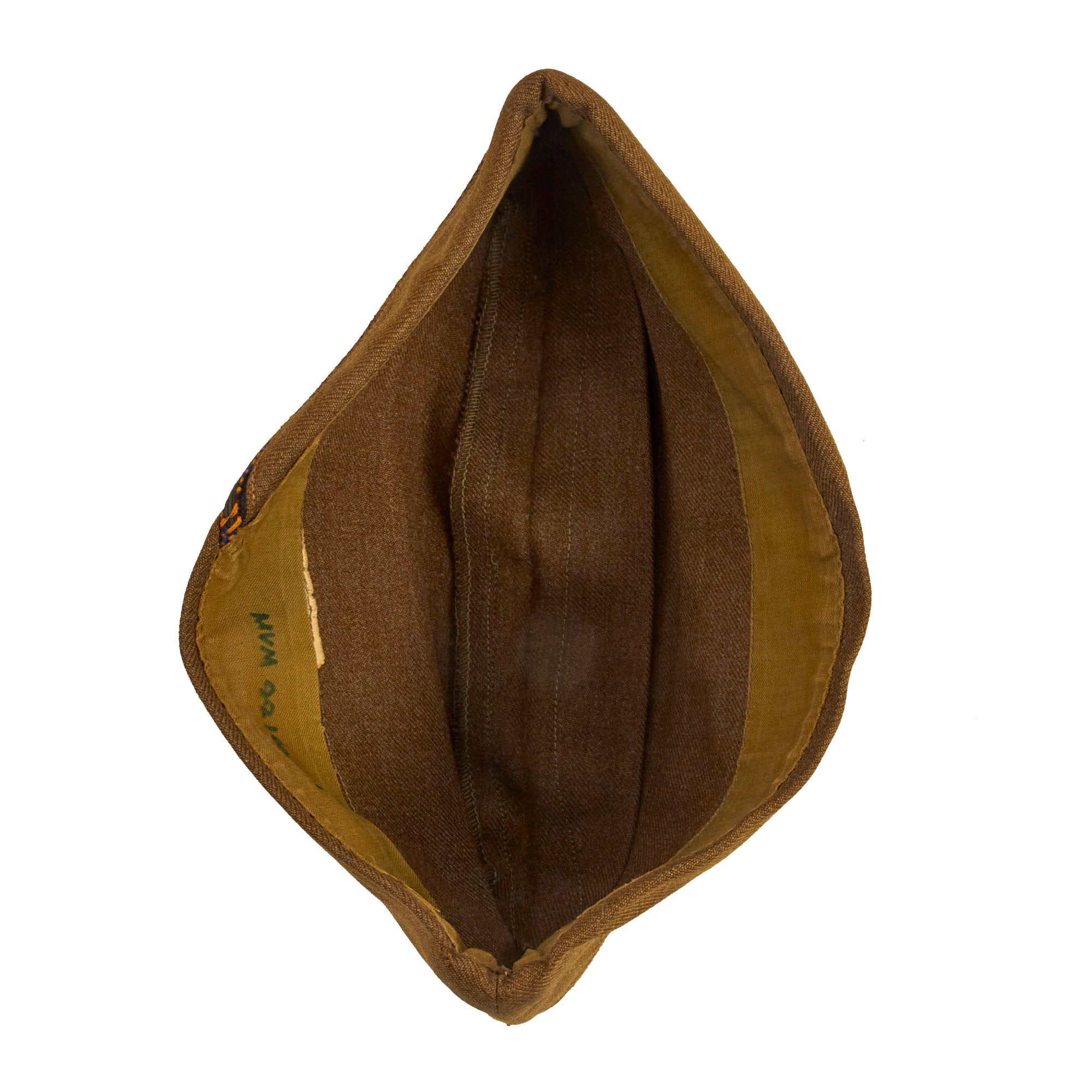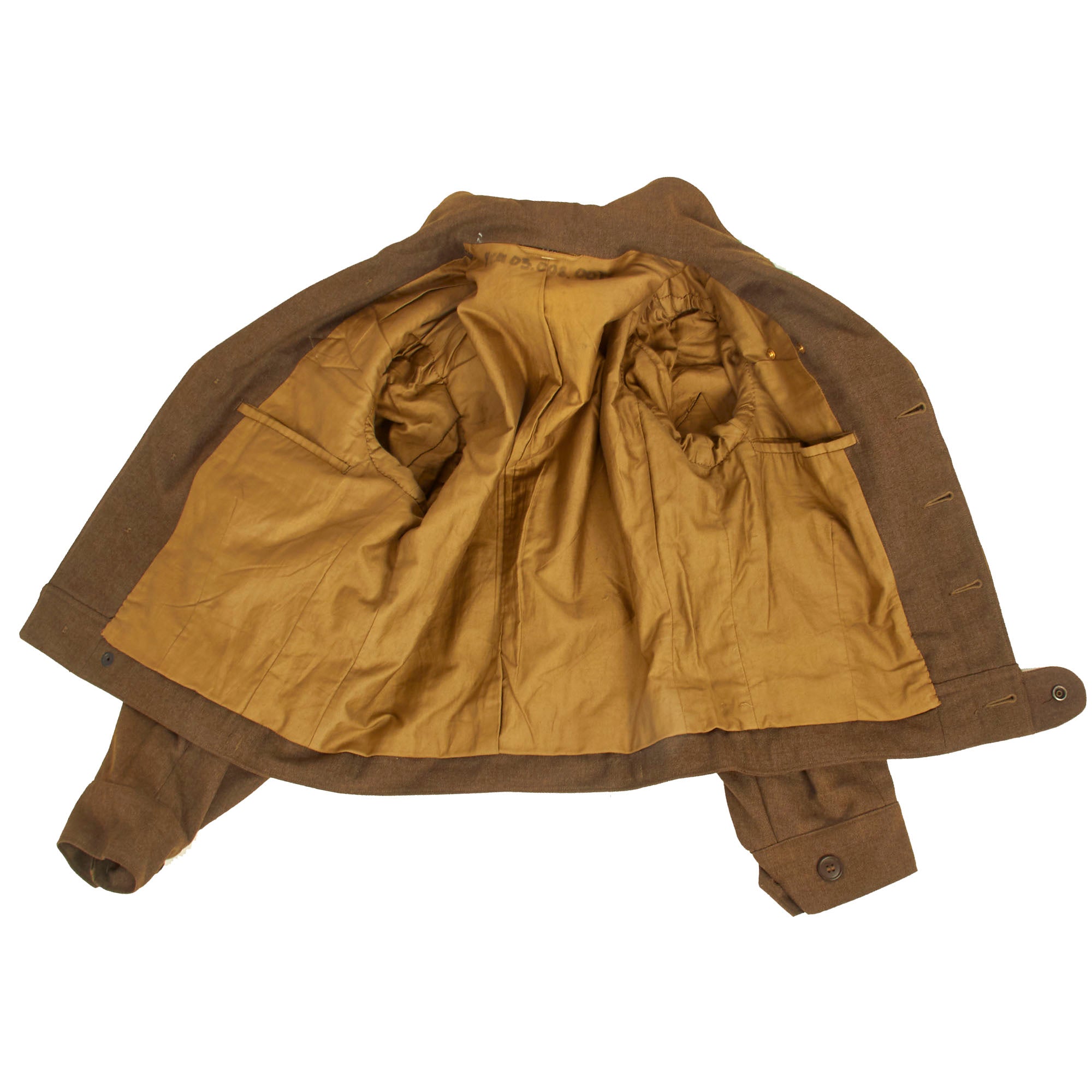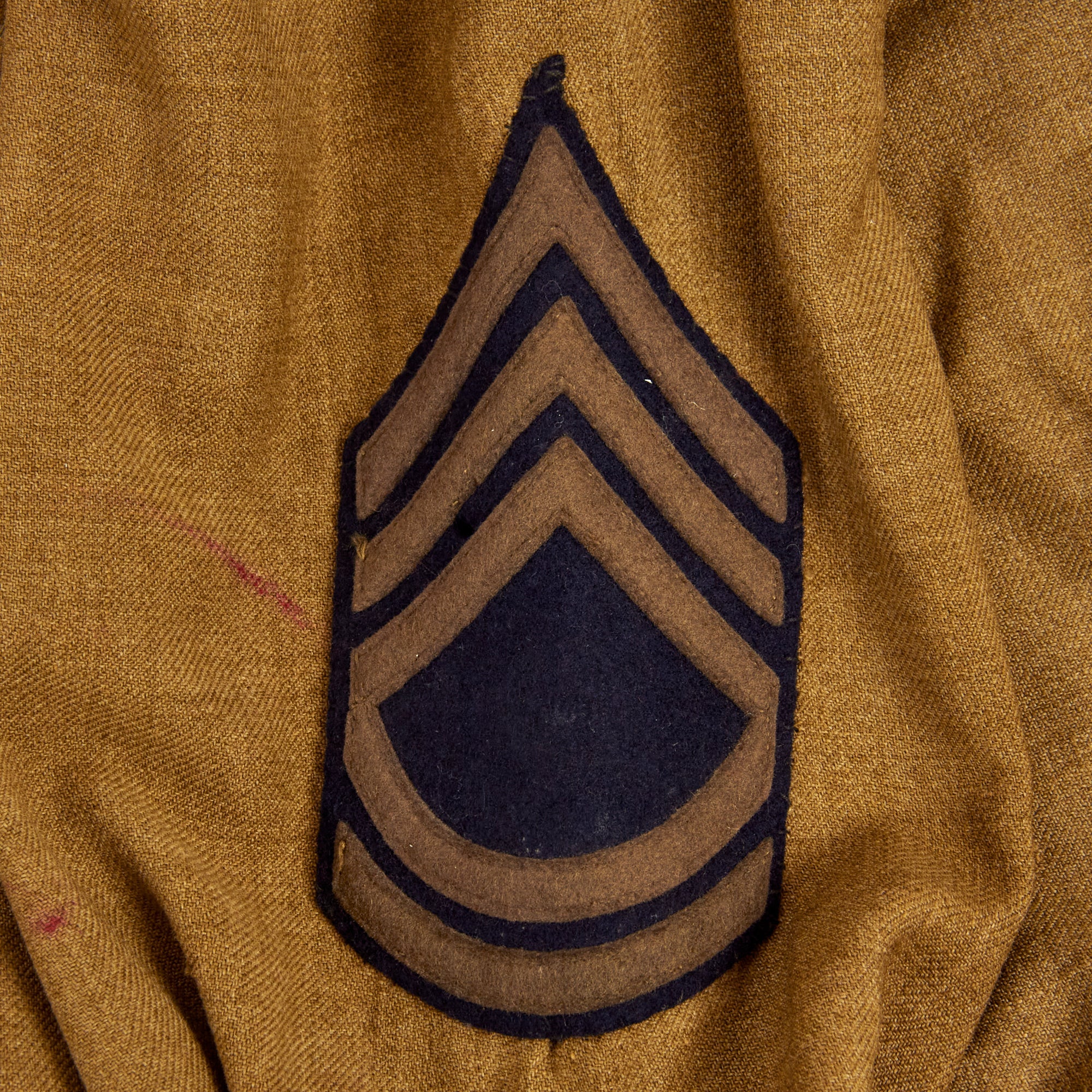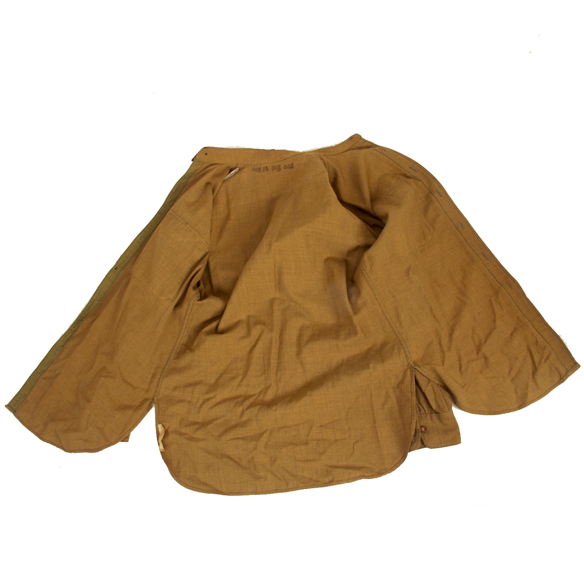 The jacket features a beautiful embroidered 8th Air Force shoulder sleeve insignia above a Sergeant First Class chevron which is also present on the right sleeve. The lower left sleeve has 5 overseas stripes indicating 2.5 years of overseas service. Below the overseas stripe is a single “hash” mark or service stripe. The lower left sleeve bears a “specialty” or “rating” insignia which is a blue triangle with a gold colored bomb. This patch is to signify that this SFC was an Armament Specialist Patch. The color features a single US collar disc with the left disc unfortunately missing. The left breast has a beautiful set of Crewman Wings just above an array of Wolf Brown ribbons for the EAME (5 Stars), American Defense and Army Good Conduct. The wool/flannel shirt is matched to the uniform with the same 8th AF insignia and chevrons as well as what appears to be a service number written on the backside interior, which is faded and difficult to read.