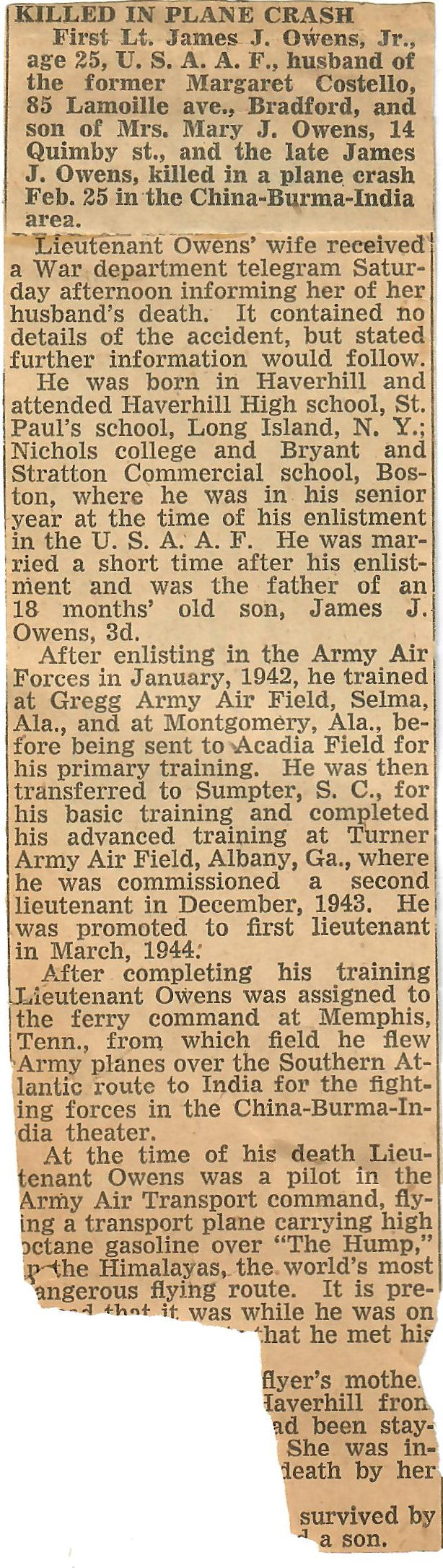 At the time of his death, Lieutenant Owens was a pilot in the Army Air Transport Command, flying a transport plane carrying high octane fuel over “The Hump” in the Himalayas, the world’s most dangerous flying route at the time. It was presumed that it was while on one of these flights when he crashed, and in the end died.