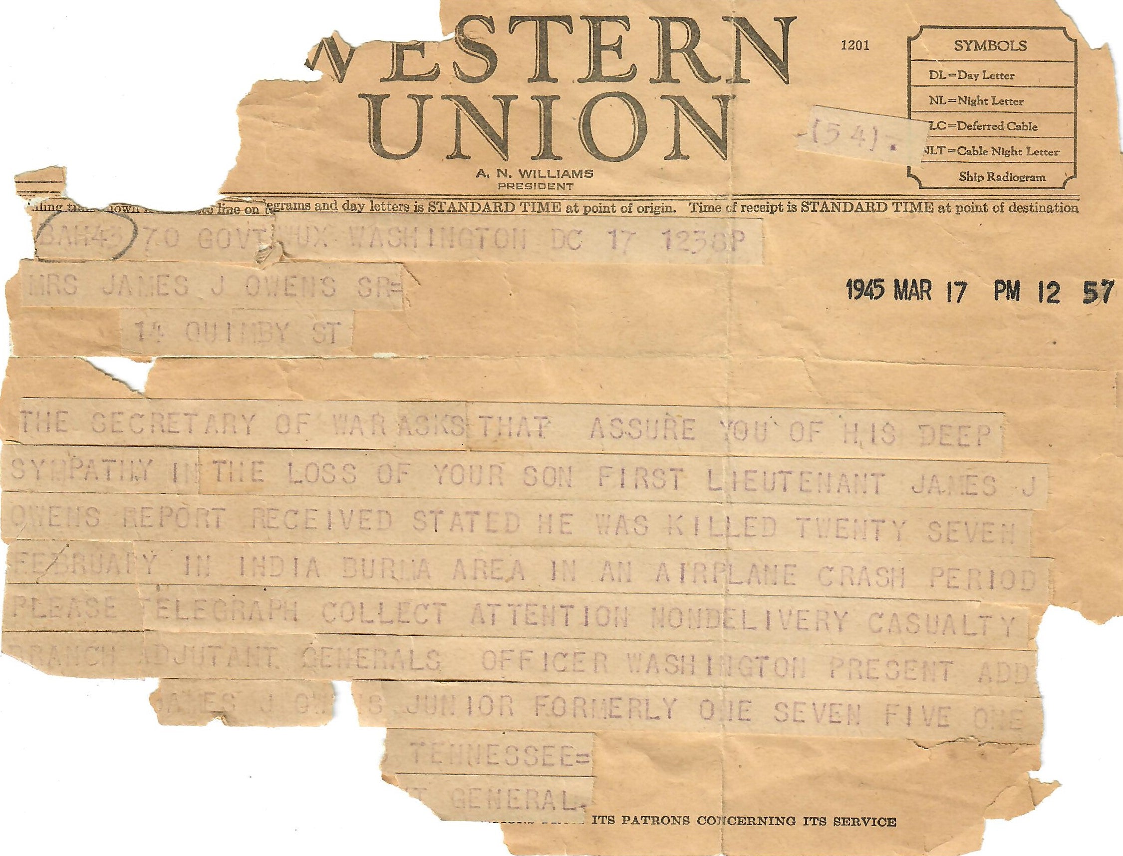 - Newspaper Article and Telegram: Both are in delicate condition and unfortunately dried out with tearing. The telegram is from the War Department informing the mother of James on his death while in the CBI theater. The article appears to be from a local newspaper and talks about his life. The information given above was taken from the article.