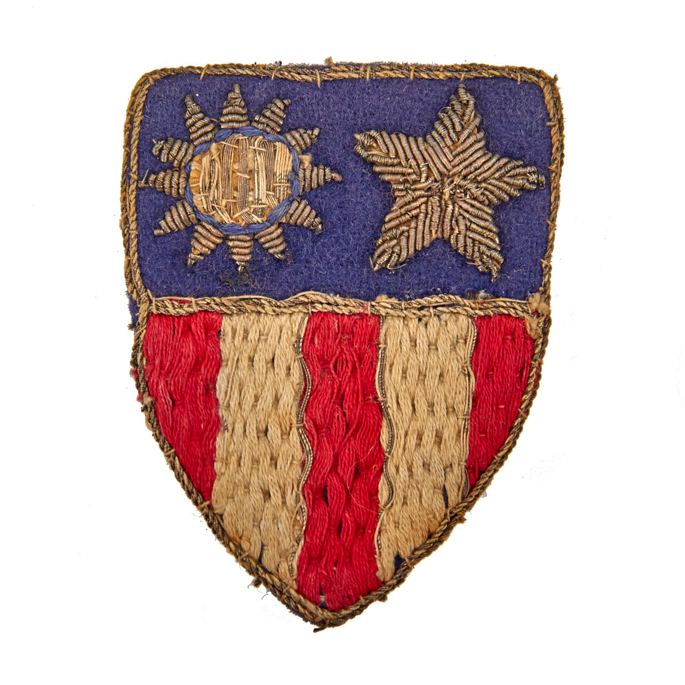 - Army Air Corps Bullion Patch: This lovely “roundel” shoulder patch is constructed of a blue felt background with silver and gold bullion thread. The colors are retained nicely with a lovely patina to the bullion.