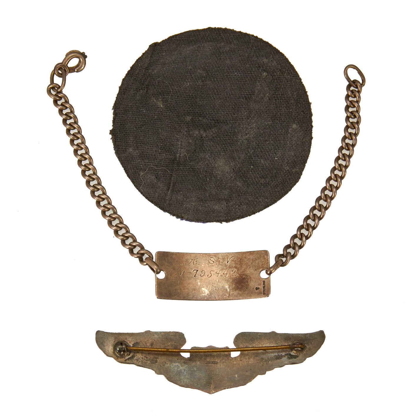 - USAAF ID Bracelet: This is a sweetheart style bracelet featuring a set of Pilots Wings. Hand inscribed on the front, beneath the wings are “J.J. Owens Jr” with “A.S.N. 0-725442” inscribed on the back. The bracelet is marked Sterling and measures 8 ½”. Fully functional and without damage.