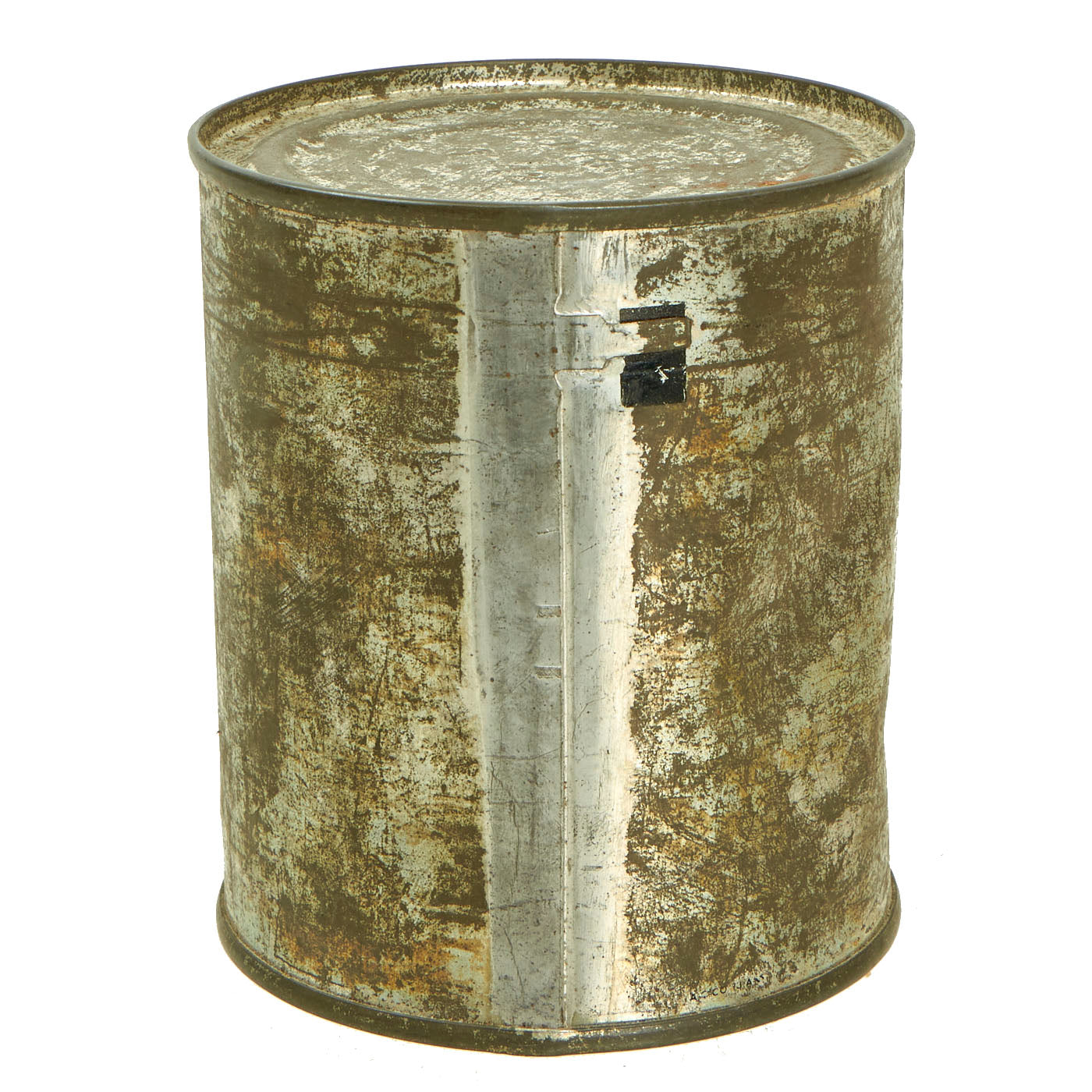 The can is in good condition. Minor dents and rust with the key which is often missing from the bottom as is the case with almost all surviving cans. The can measures 3.5" H and 3.5" in diameter. The field ration can has a list on front that reads: