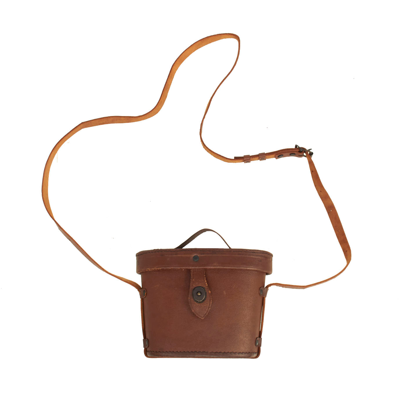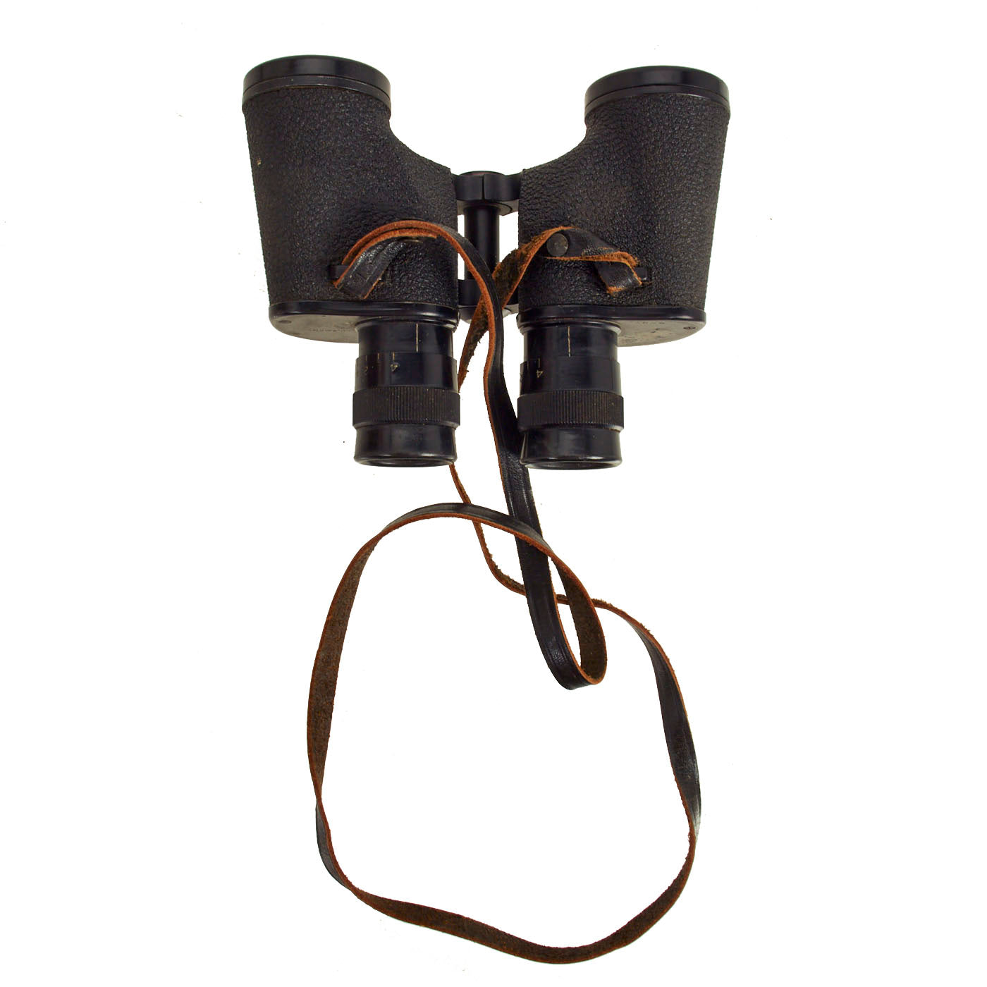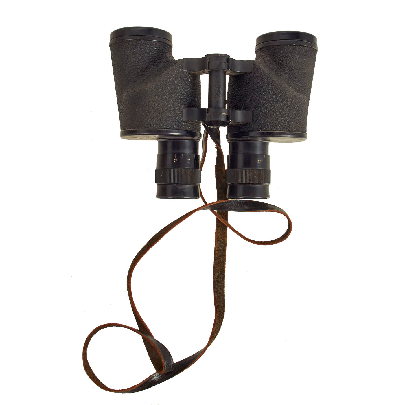 The focus diopters both function and turn easily. The textured covering on the set is in very good condition, with no cracks or chips. It also has an original leather neck strap.