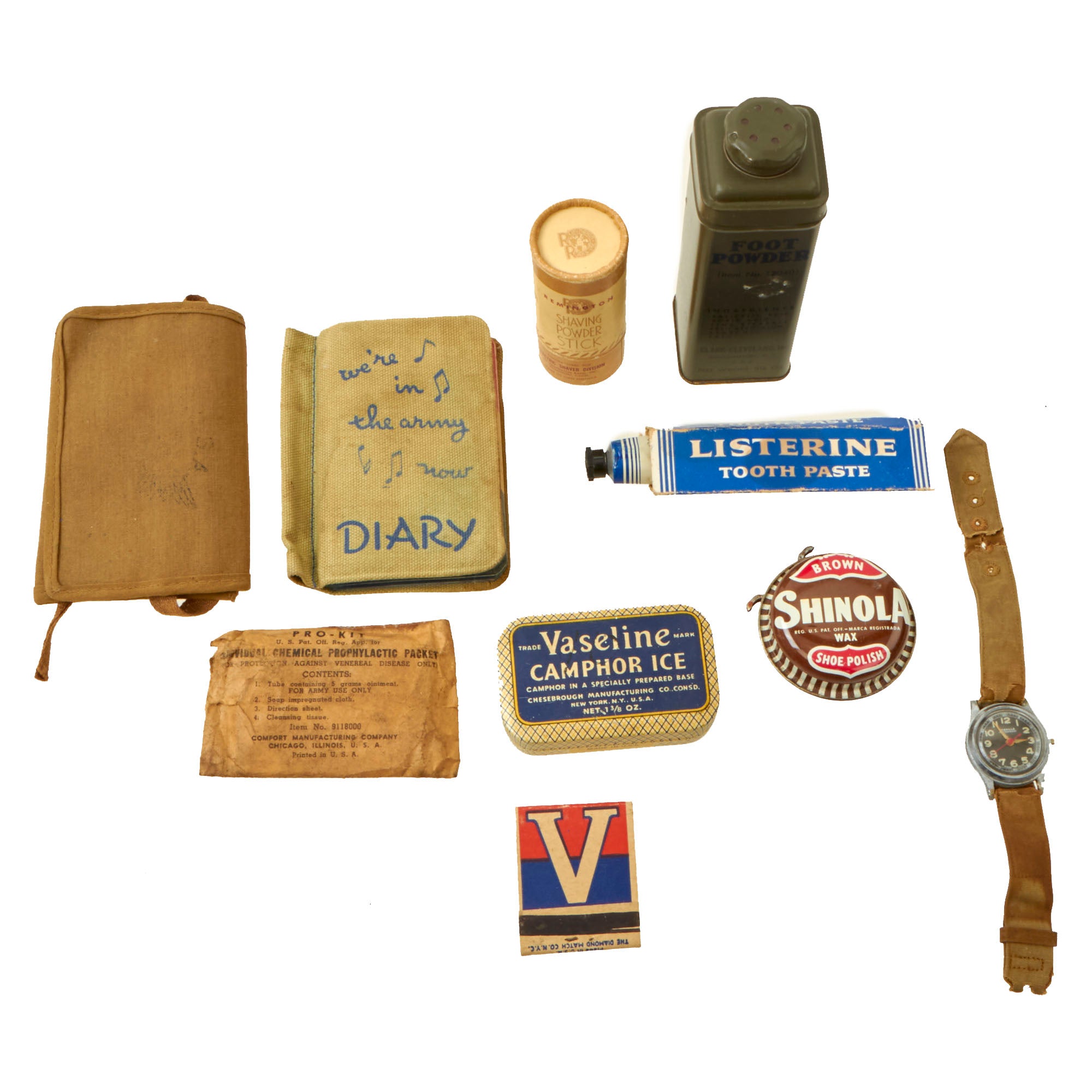 Original Items: Only One Lot of 10 Available. Necessary items to survive in the field during WWII. These are items that were given to the soldiers by the Red Cross, or items bought by soldiers at the Post Exchange. Everything you need to complete a great barracks and field display. These “creature comfort” items would have aided in the mental breaks soldiers needed while fighting a war such as WWII. Something as small as getting to use shaving powder made a world of difference and served as a brief “ civility getaway” from the conflict.