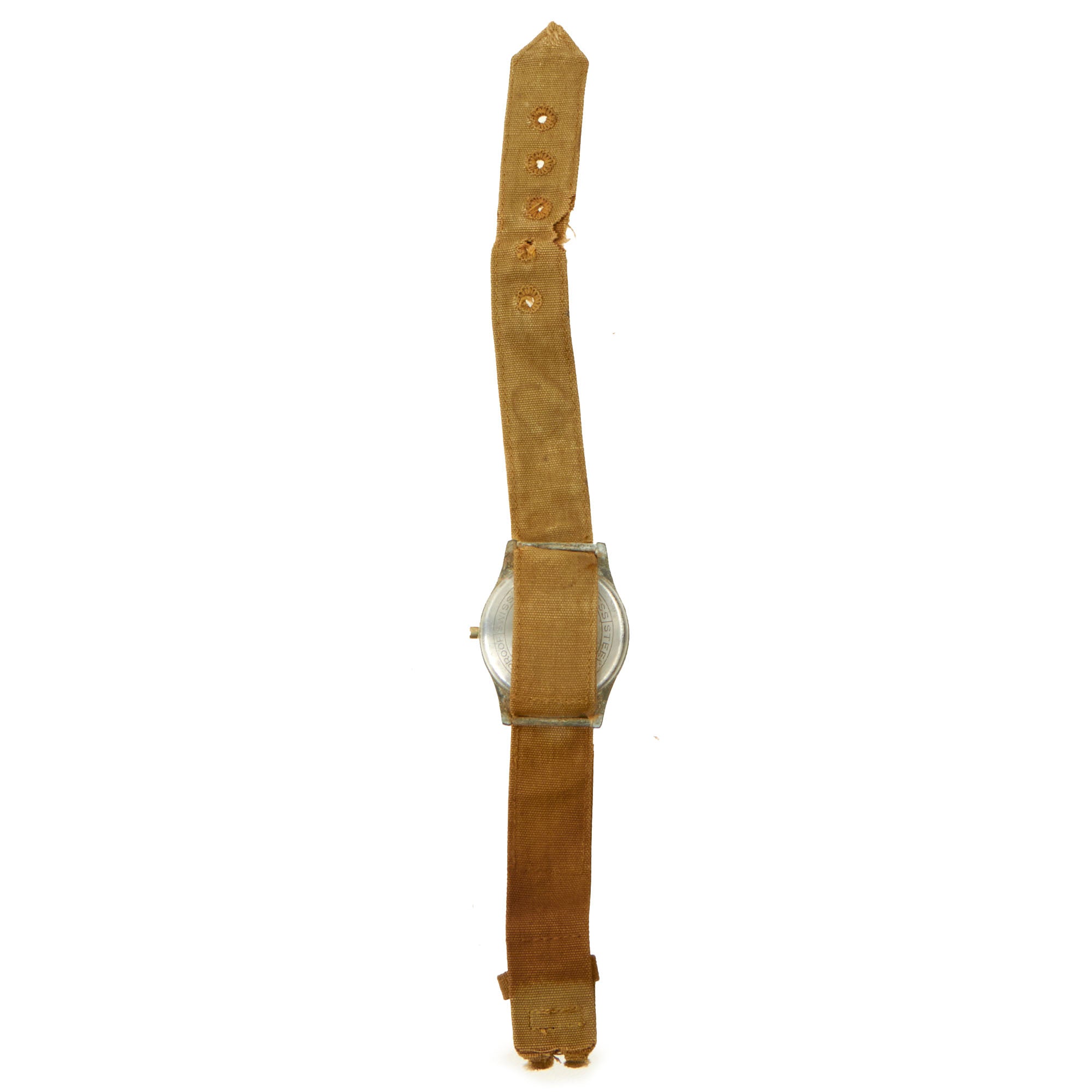 - Swiss Made “PX Watch” by Misalla Ltd: The watch is unfortunately in non-working condition and is being sold simply as a display item or restoration candidate. There is corrosion present on the back around the seam of the back plate and the watch case itself. The only real issue with the watch besides it currently not working is the fact that the crown is missing entirely, leaving us unable to test wind the watch. The band is original but in a very delicate state missing the buckle with tearing present.