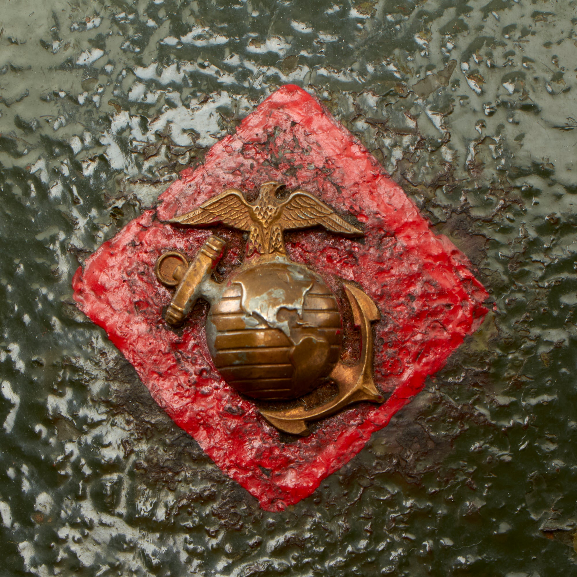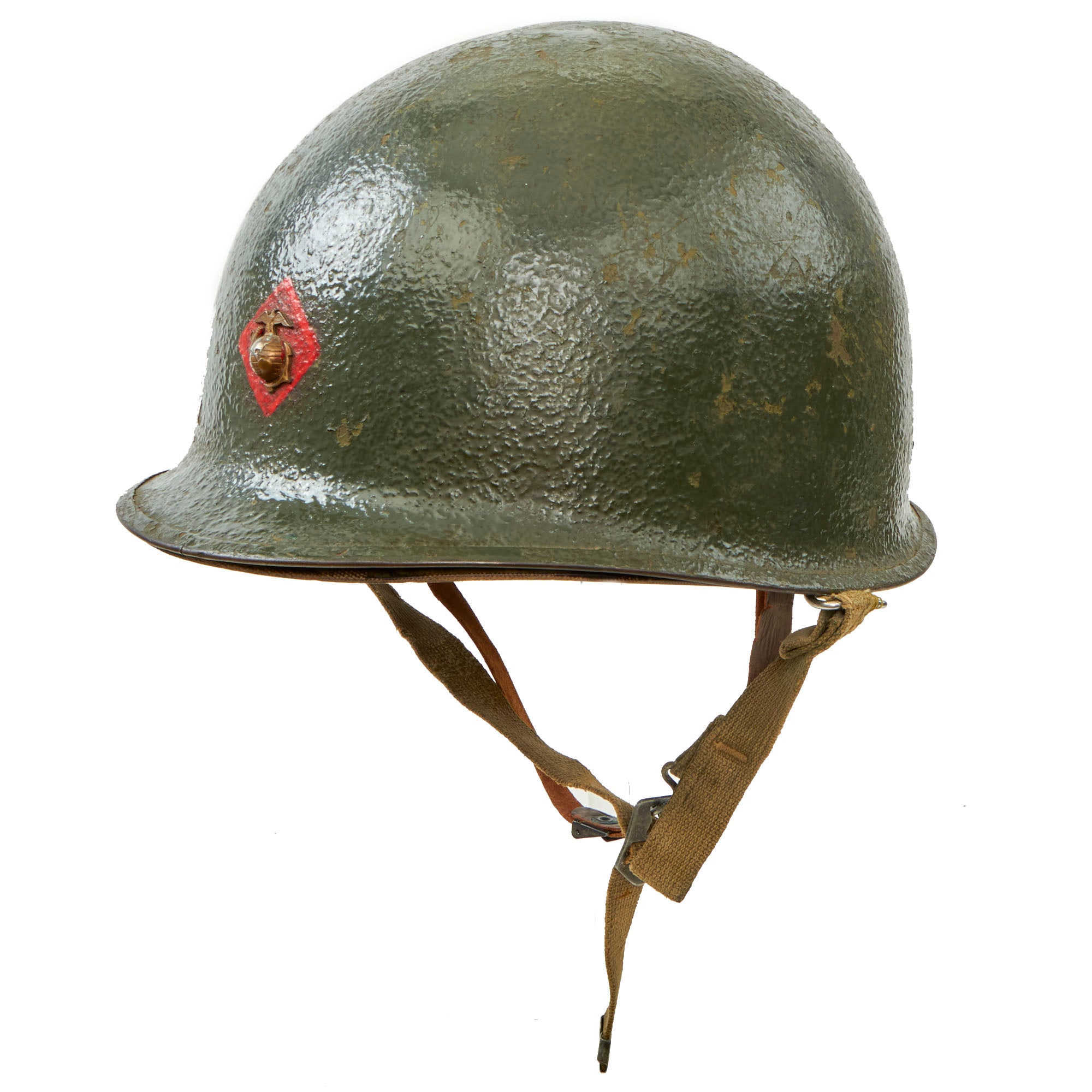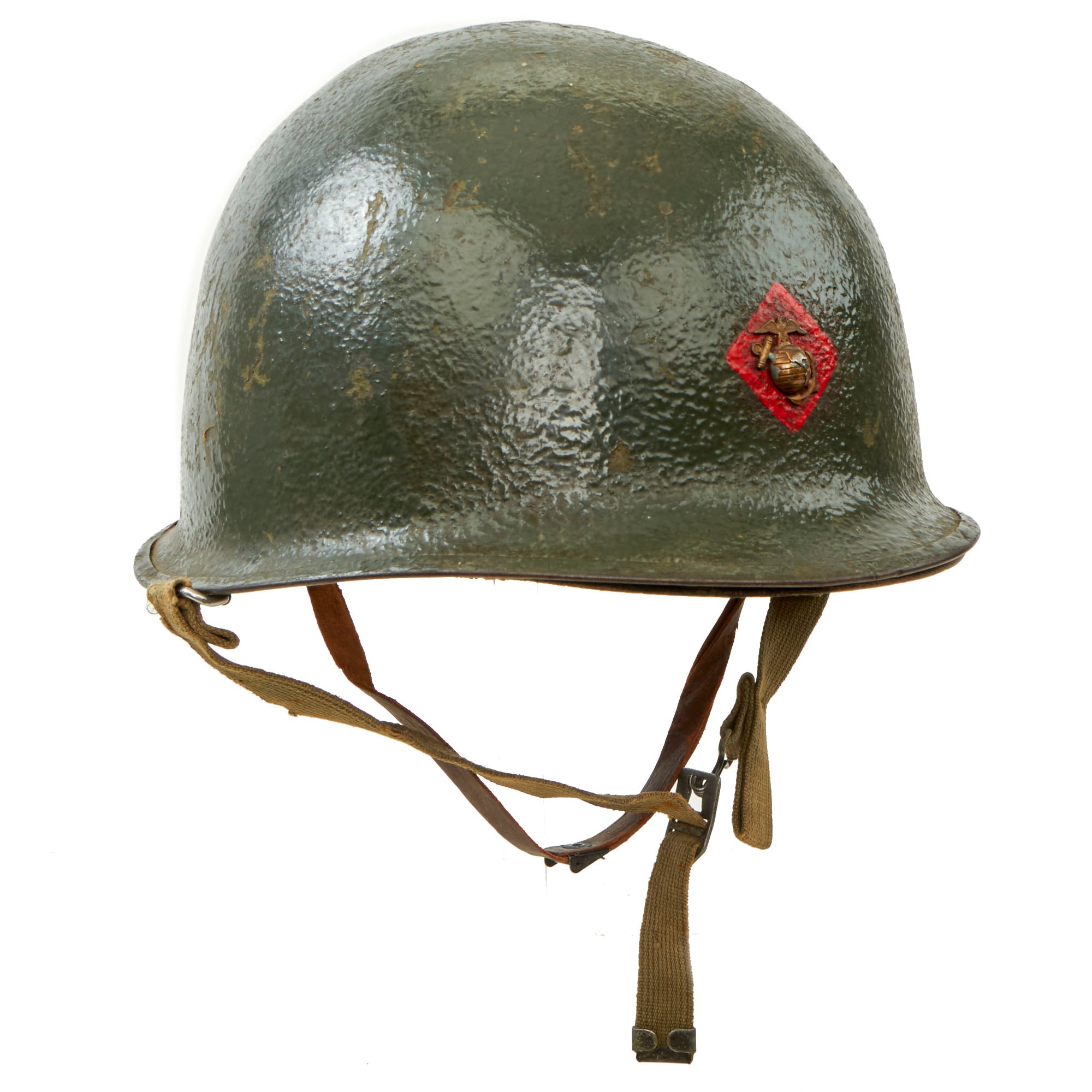 The helmet shell has a lovely red diamond painted on the front with a USMC Eagle, Globe and Anchor affixed to it. We believe this to be for the 4th Marine Division due to it being a diamond shape and not the red square of the Landing Support Specialists.