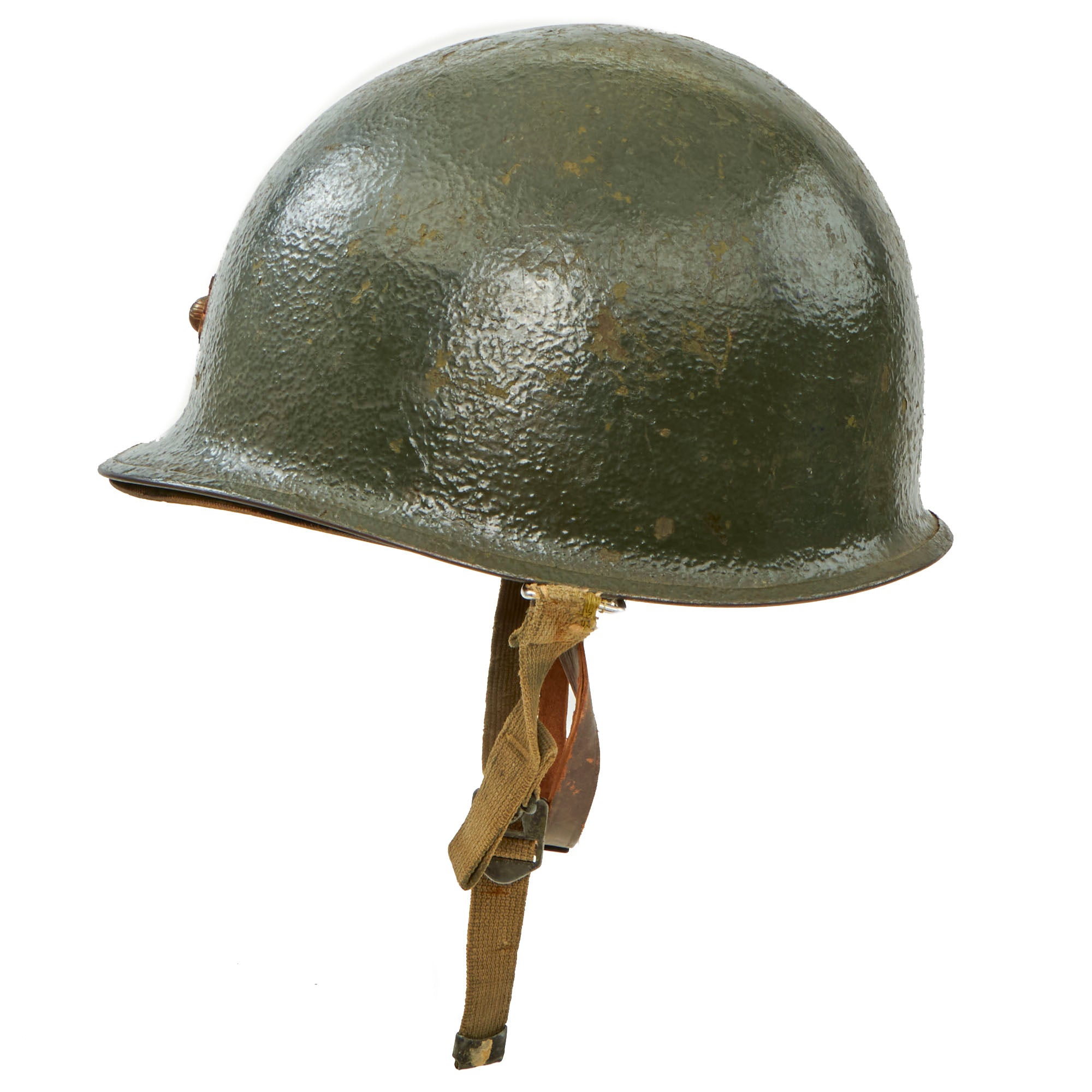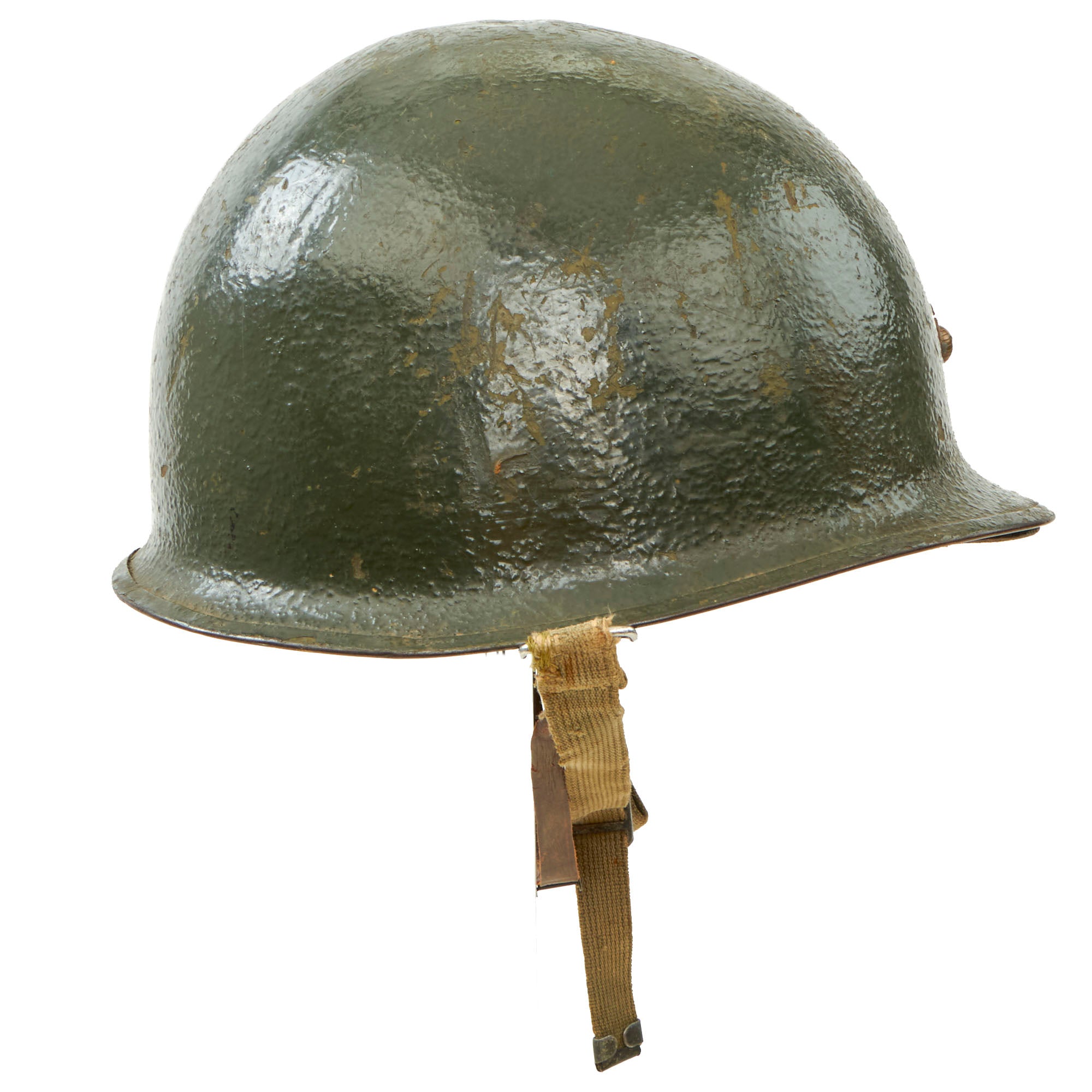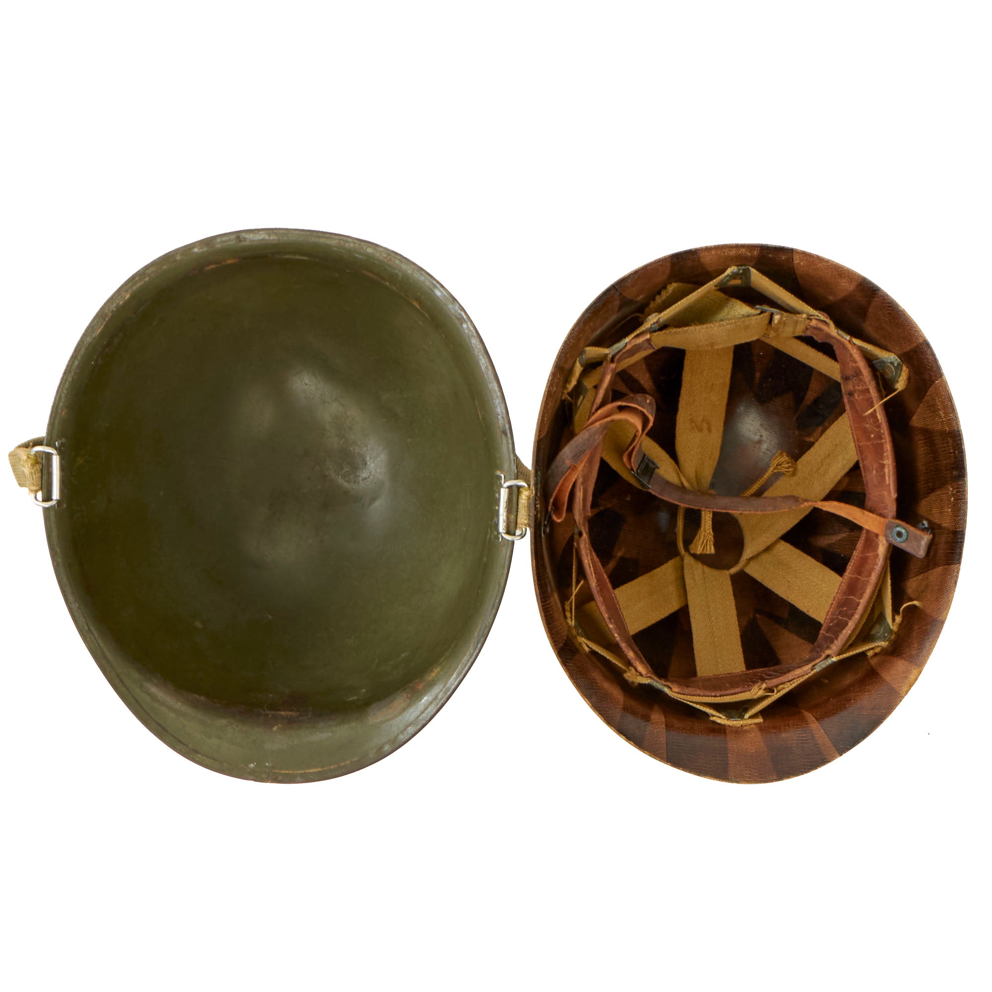 The U.S. WWII M-1 helmet was only produced from 1941 to 1945. The first production batch resulted with over 323,510 M-1 helmets before the start of the American involvement in the war. This helmet is heat lot stamped 844A which indicates the approximate manufacture date of mid 1944.