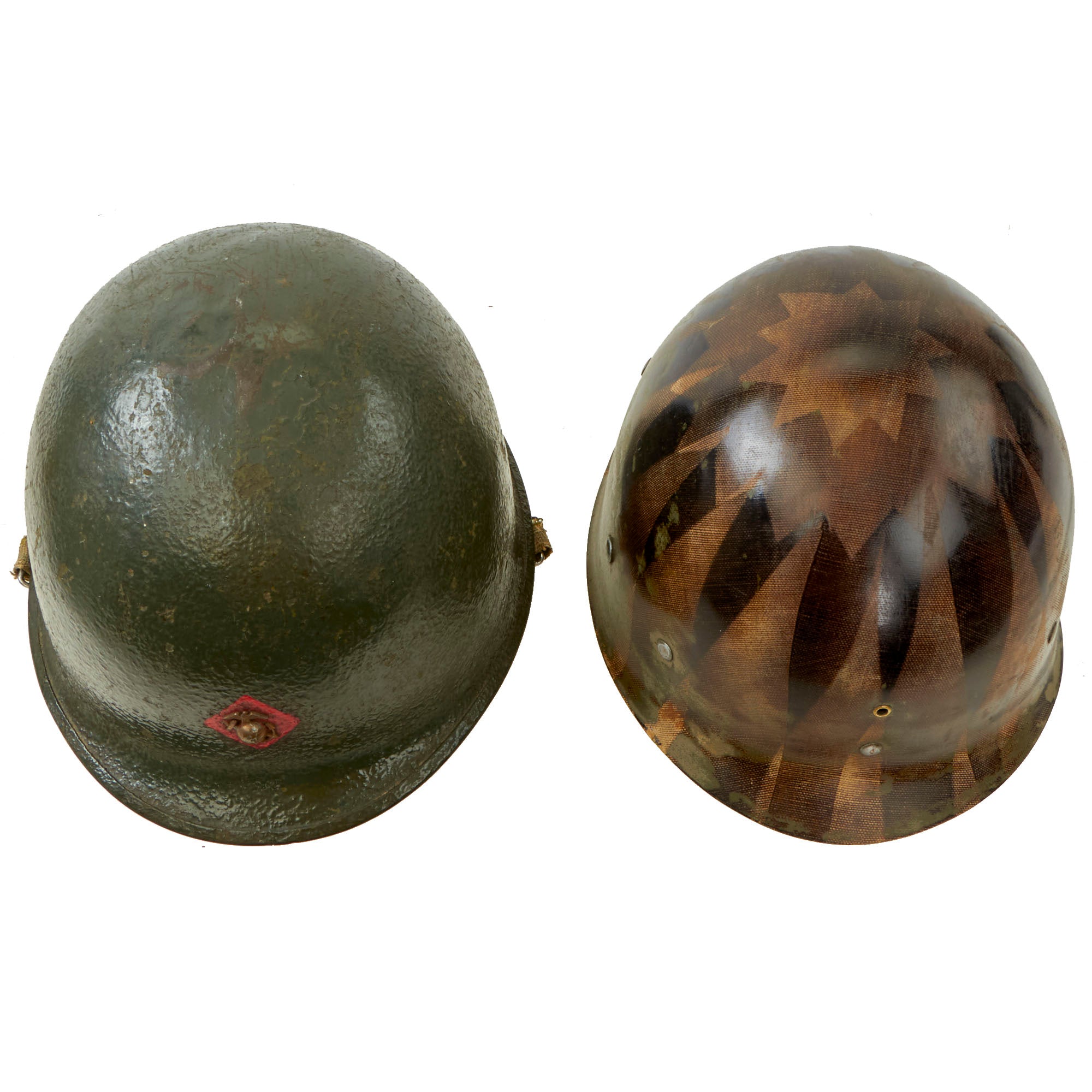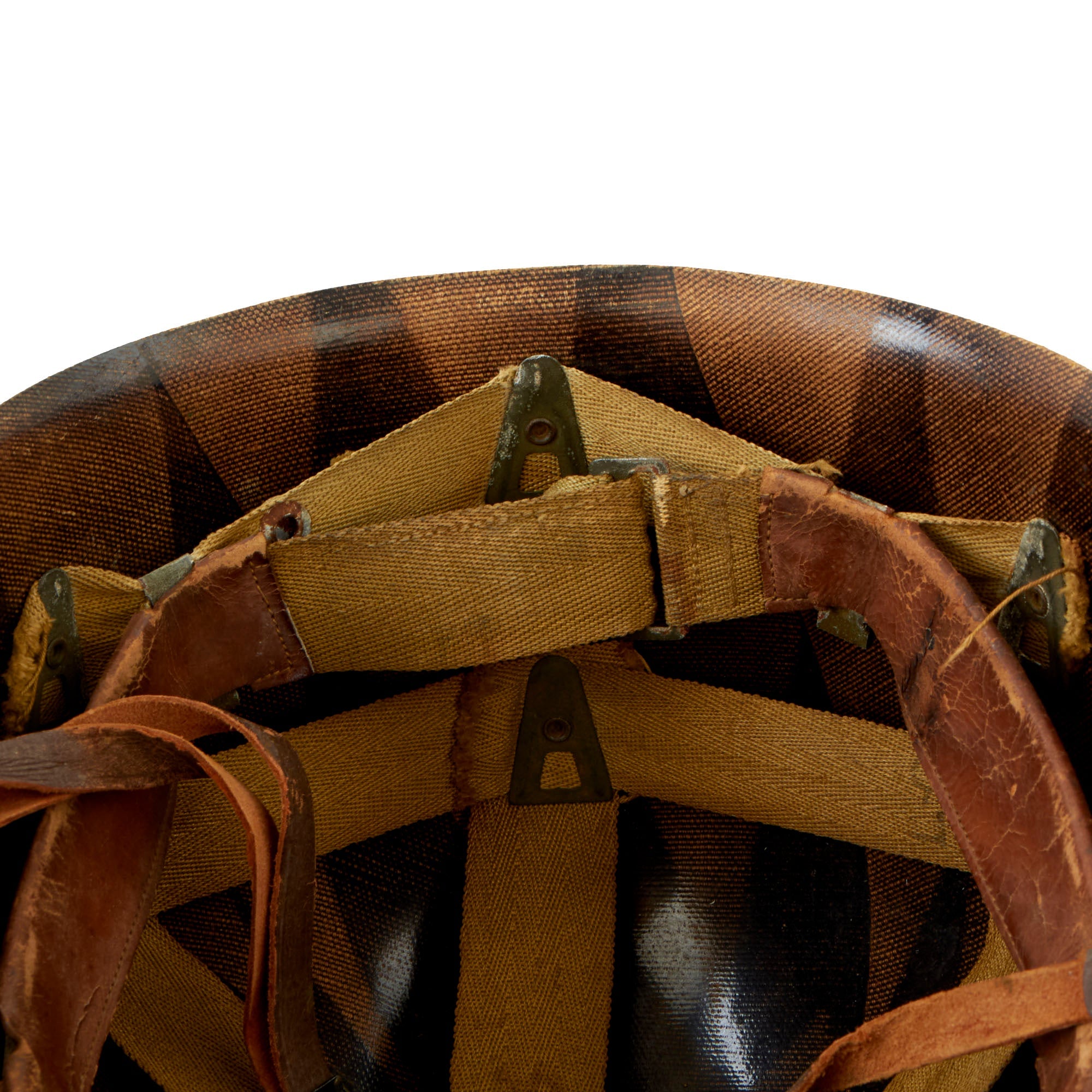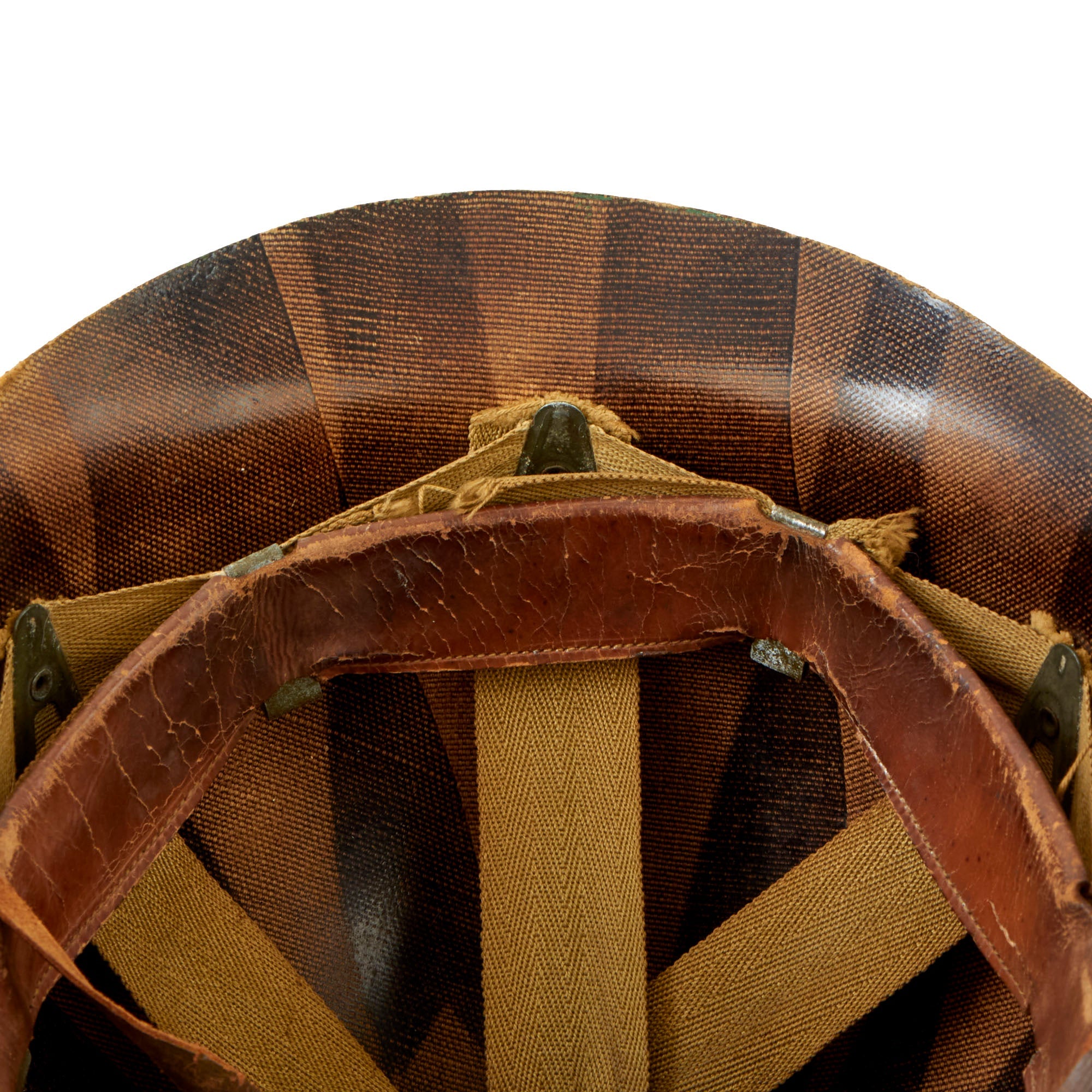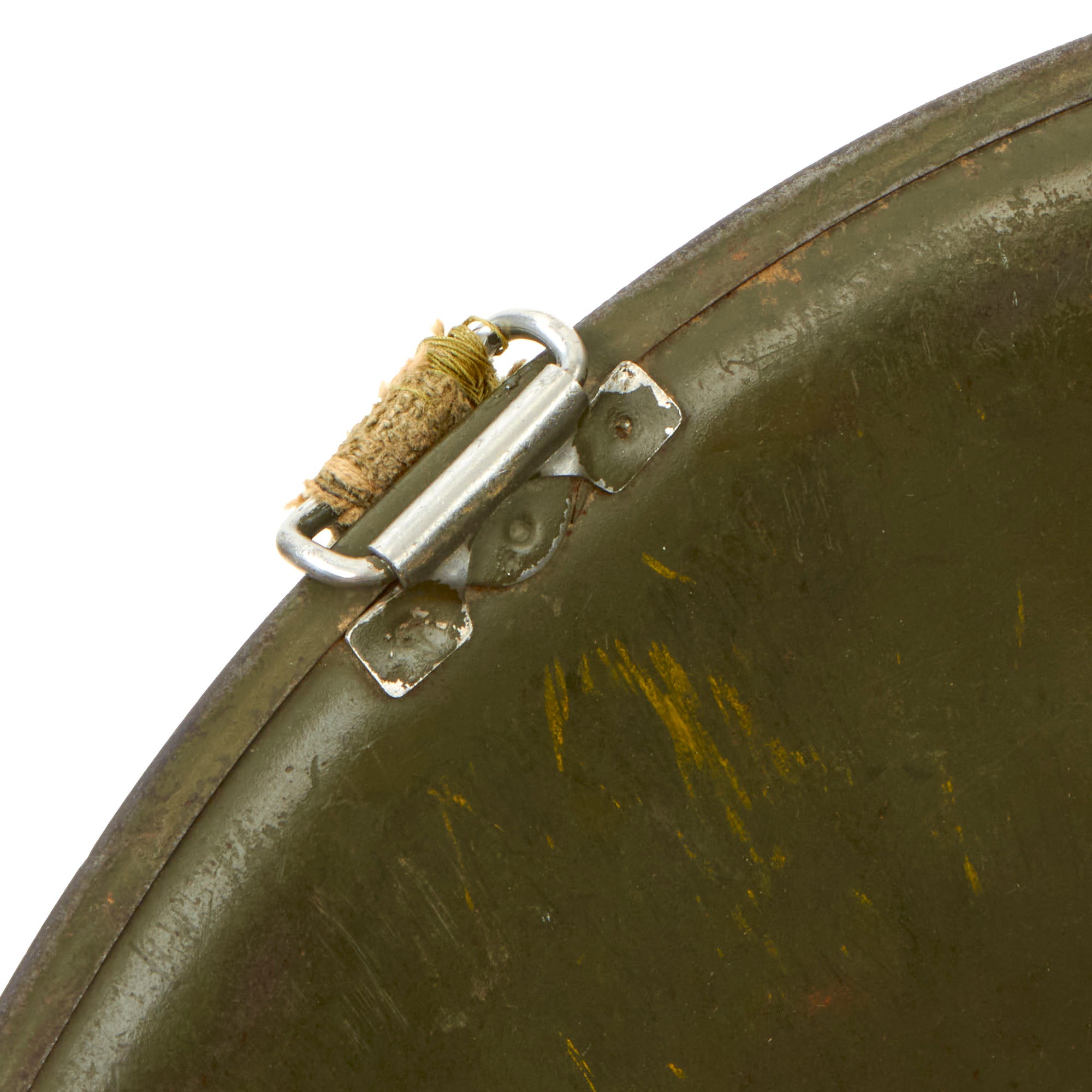 The U.S. WWII M-1 helmet was only produced from 1941 to 1945. The first production batch resulted with over 323,510 M-1 helmets before the start of the American involvement in the war. This helmet is heat lot stamped 844A which indicates the approximate manufacture date of mid 1944.