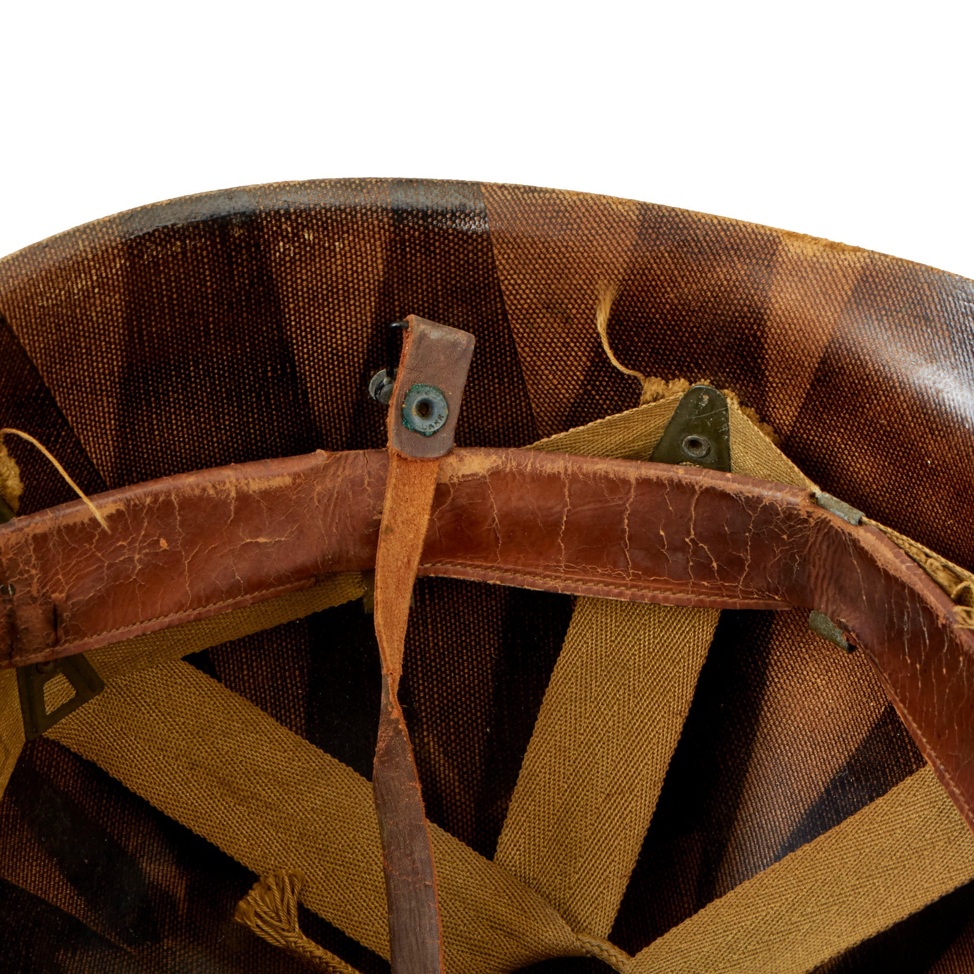 A true US WWII M-1 helmet liner can usually be identified through the frontal eyelet hole. Other correct WW2 features include cotton herringbone twill (HBT) cloth suspension. This HBT suspension is held tightly within the M-1 helmet liner by rivets and a series of triangular "A" washers. The three upper suspension bands are joined together with a correct string. This way the wearer could adjust the fit. The paint on the liner is almost completely gone and may have not been painted at all. The suspension is complete with the original leather chinstrap which is whole but delicate in areas.