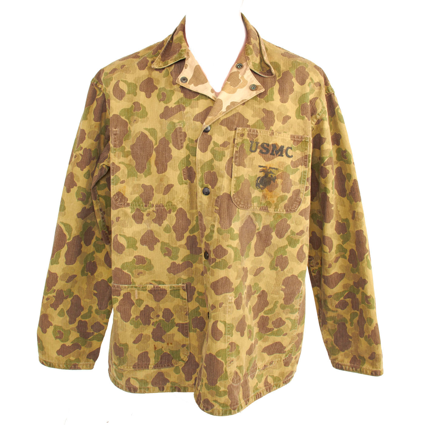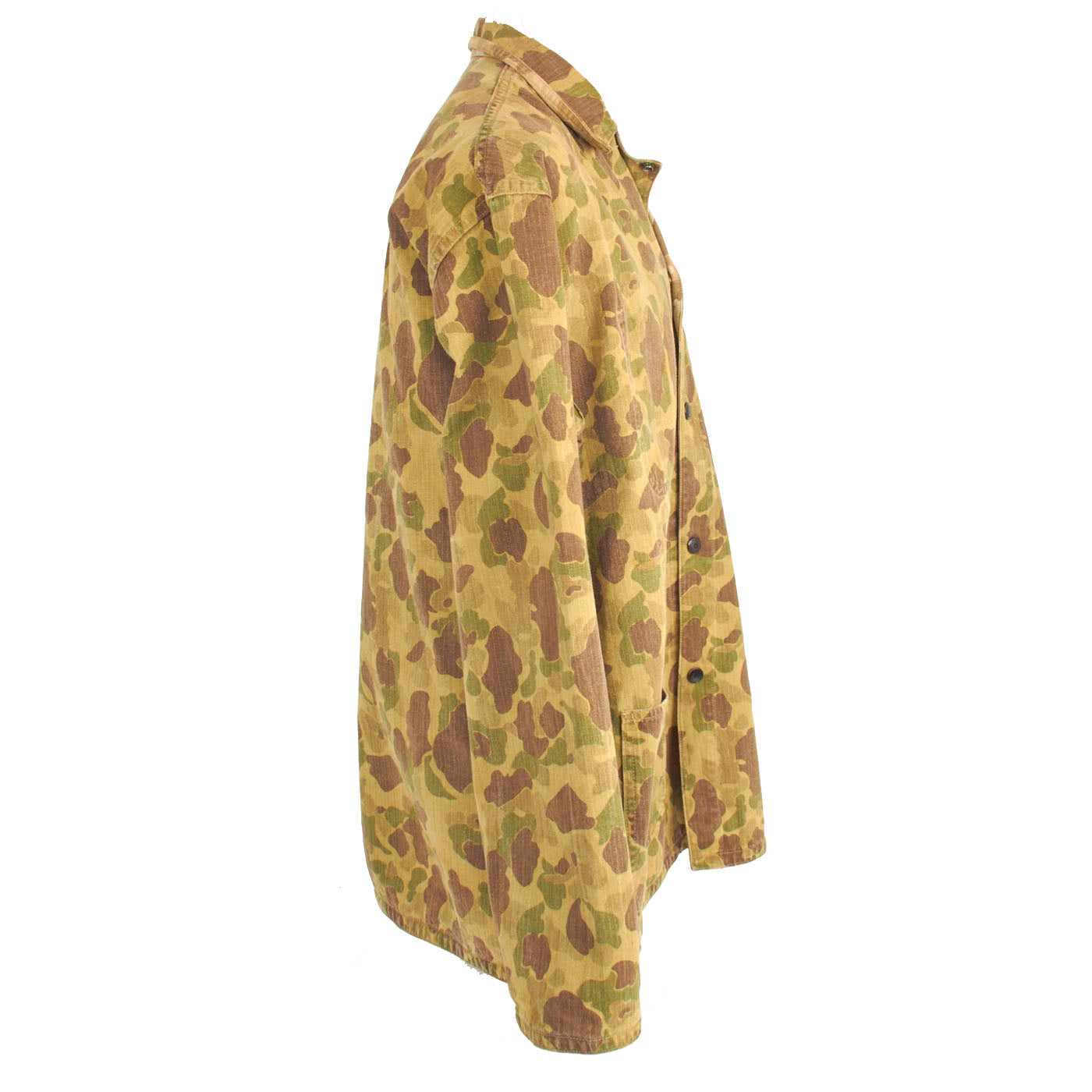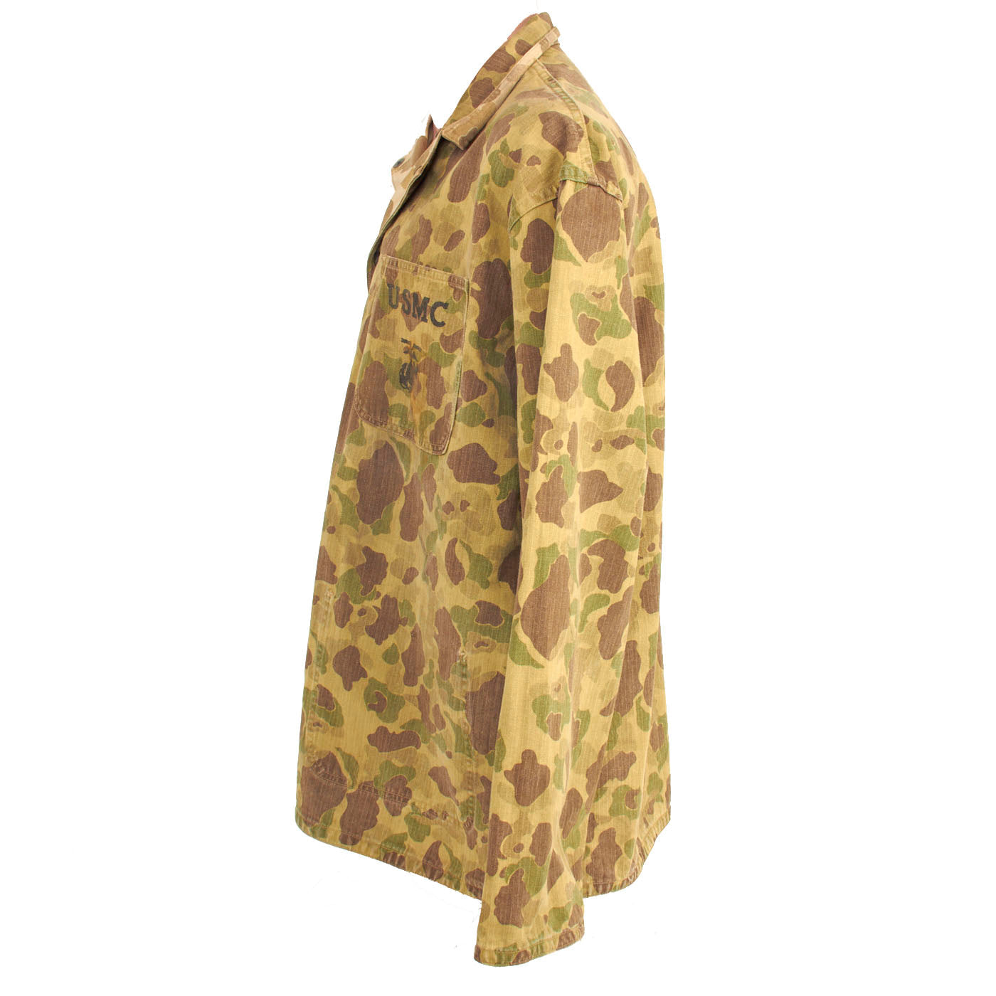 Original Item: Only One Available. This is an excellent condition Pattern 1942 United States Marine Corps Camouflage Utility Top. This cotton HBT (Herring Bone Twill) Camouflage pattern jacket was first issued to Marine Raiders in 1942 and during the Korean war. This pattern was seen as an improvement over the one-piece "jungle" coveralls, which lacking a drop seat, made "relieving yourself" difficult in combat situations. However, the Marines who wore the Camouflage on Tarawa and elsewhere were easy to spot when moving (as opposed to being stationary) and the pattern was discontinued.