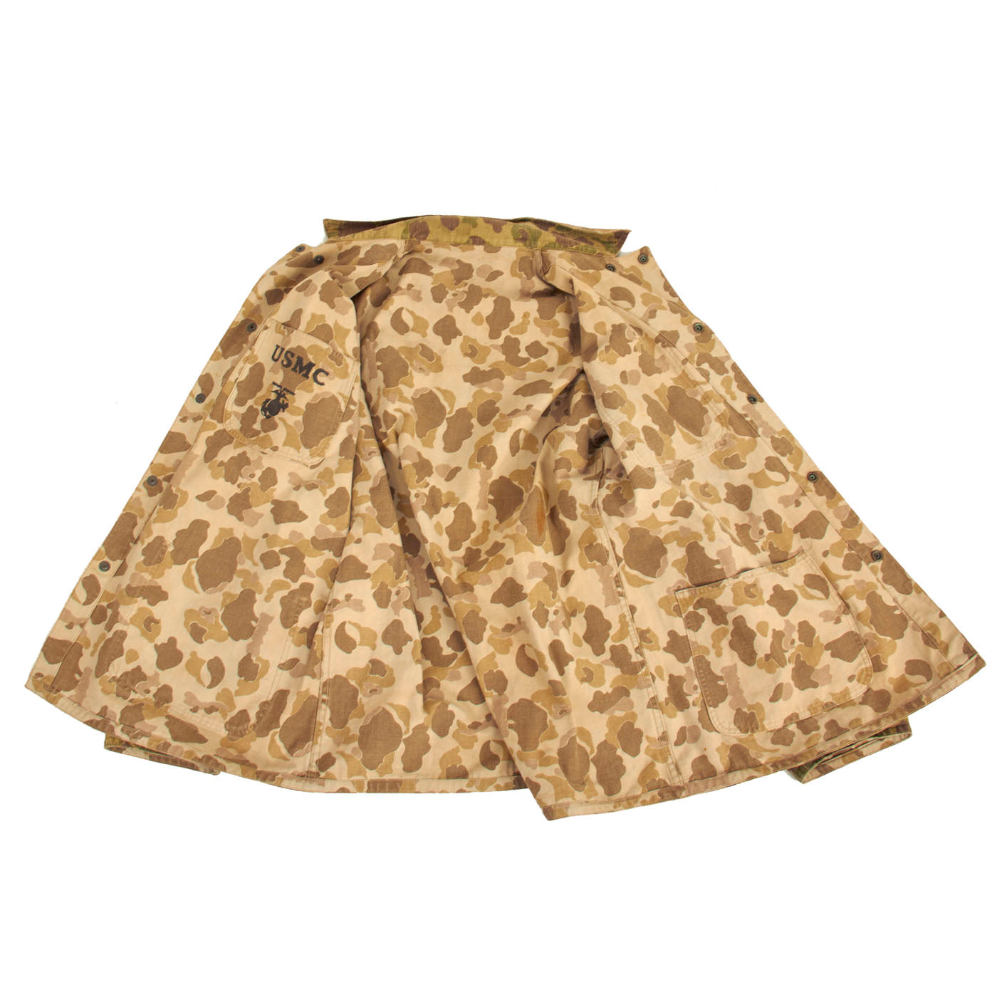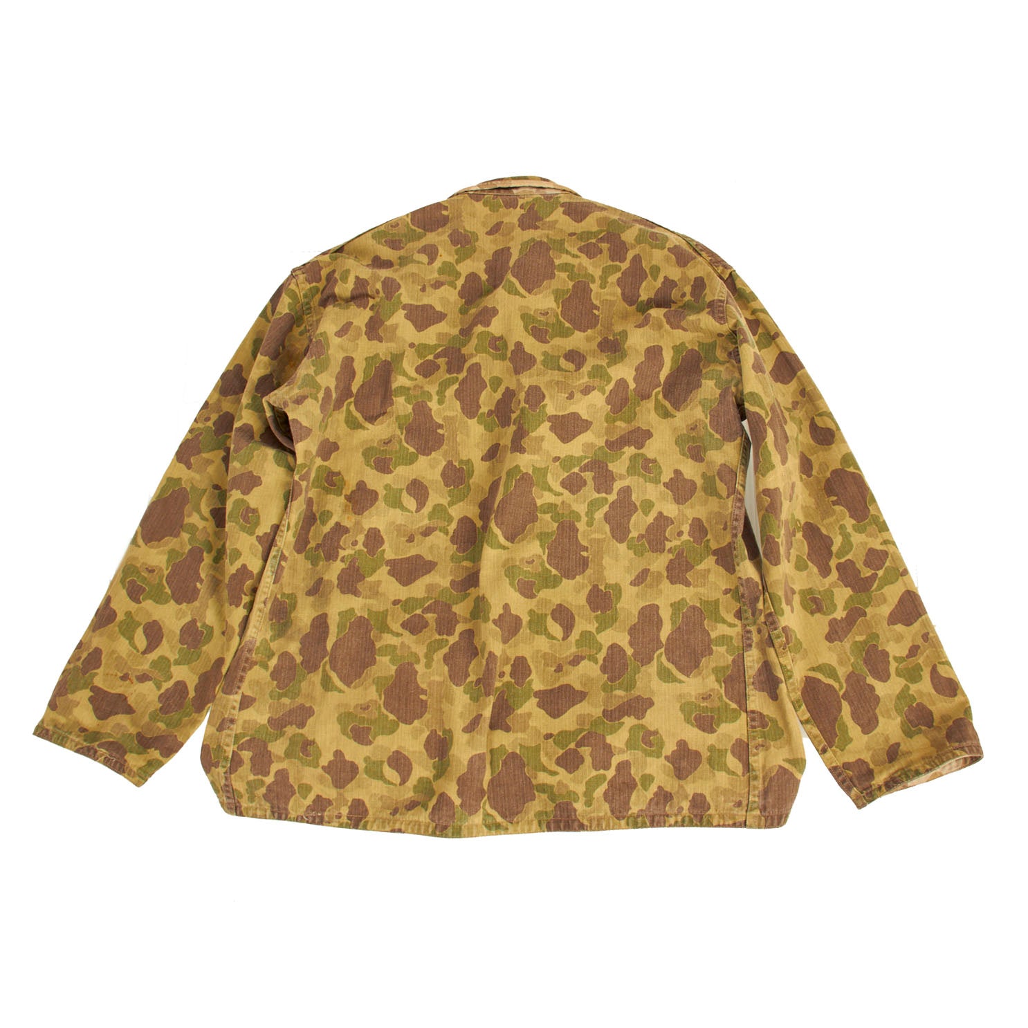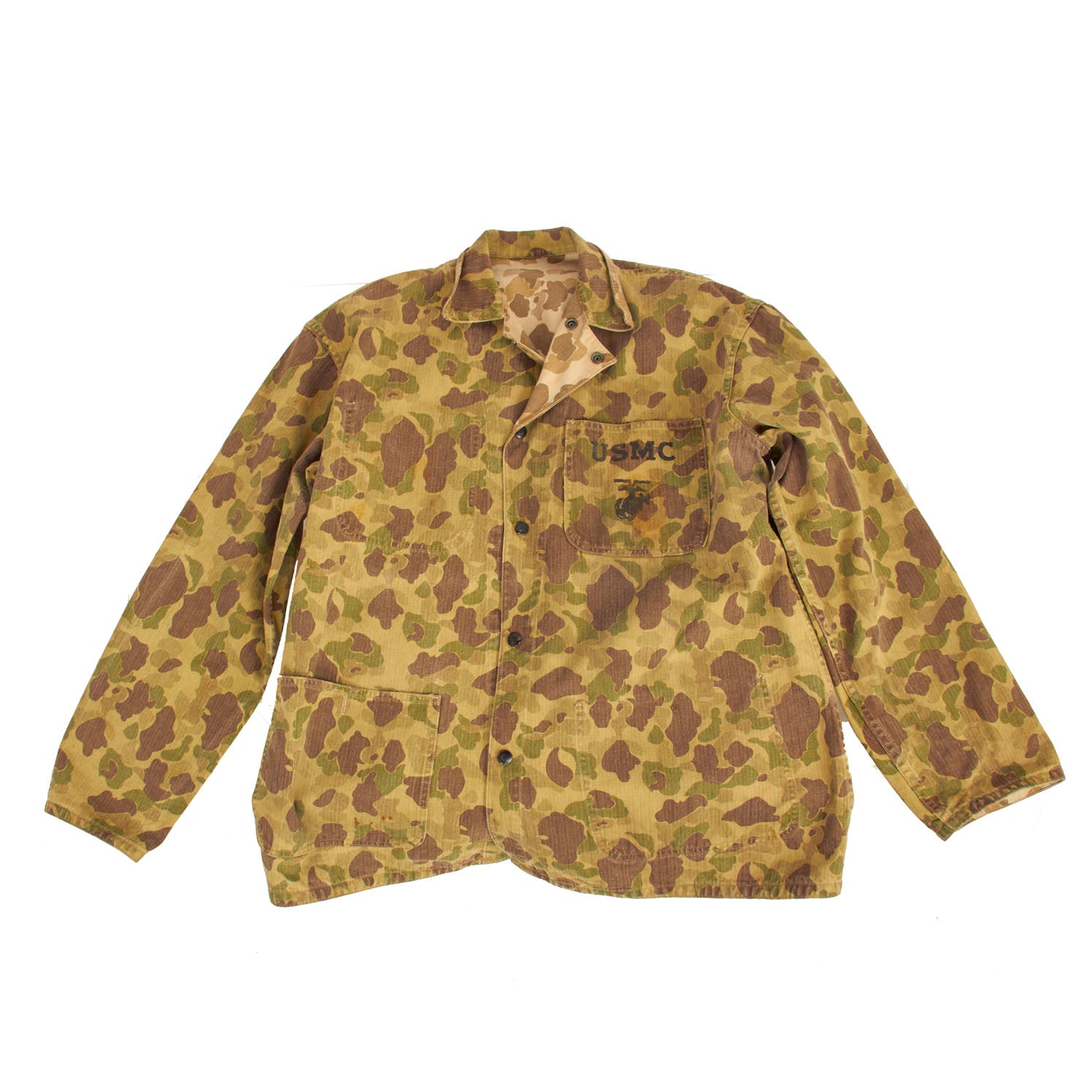 Original Item: Only One Available. This is an excellent condition Pattern 1942 United States Marine Corps Camouflage Utility Top. This cotton HBT (Herring Bone Twill) Camouflage pattern jacket was first issued to Marine Raiders in 1942 and during the Korean war. This pattern was seen as an improvement over the one-piece "jungle" coveralls, which lacking a drop seat, made "relieving yourself" difficult in combat situations. However, the Marines who wore the Camouflage on Tarawa and elsewhere were easy to spot when moving (as opposed to being stationary) and the pattern was discontinued.