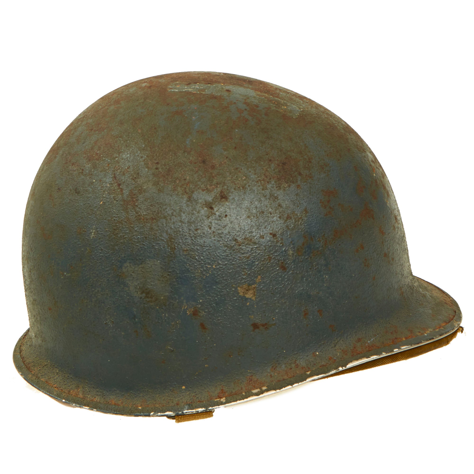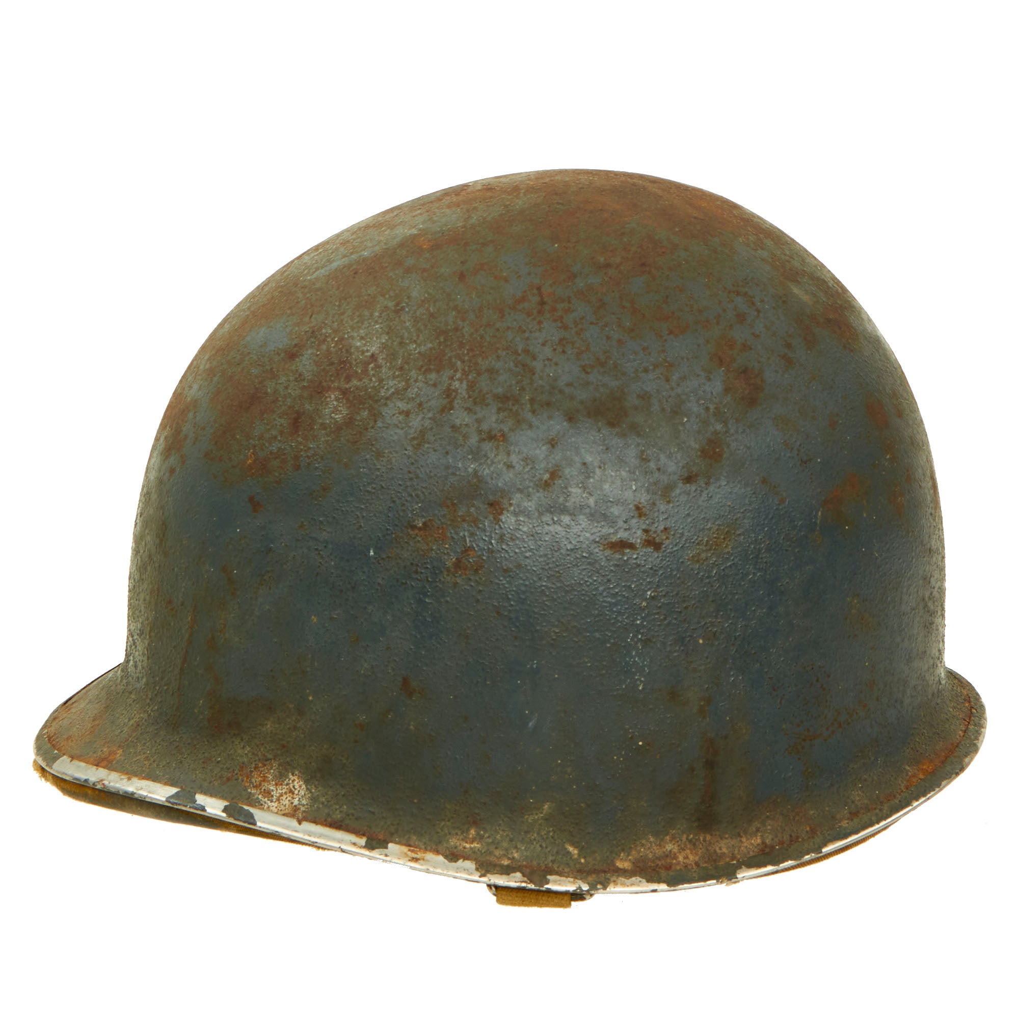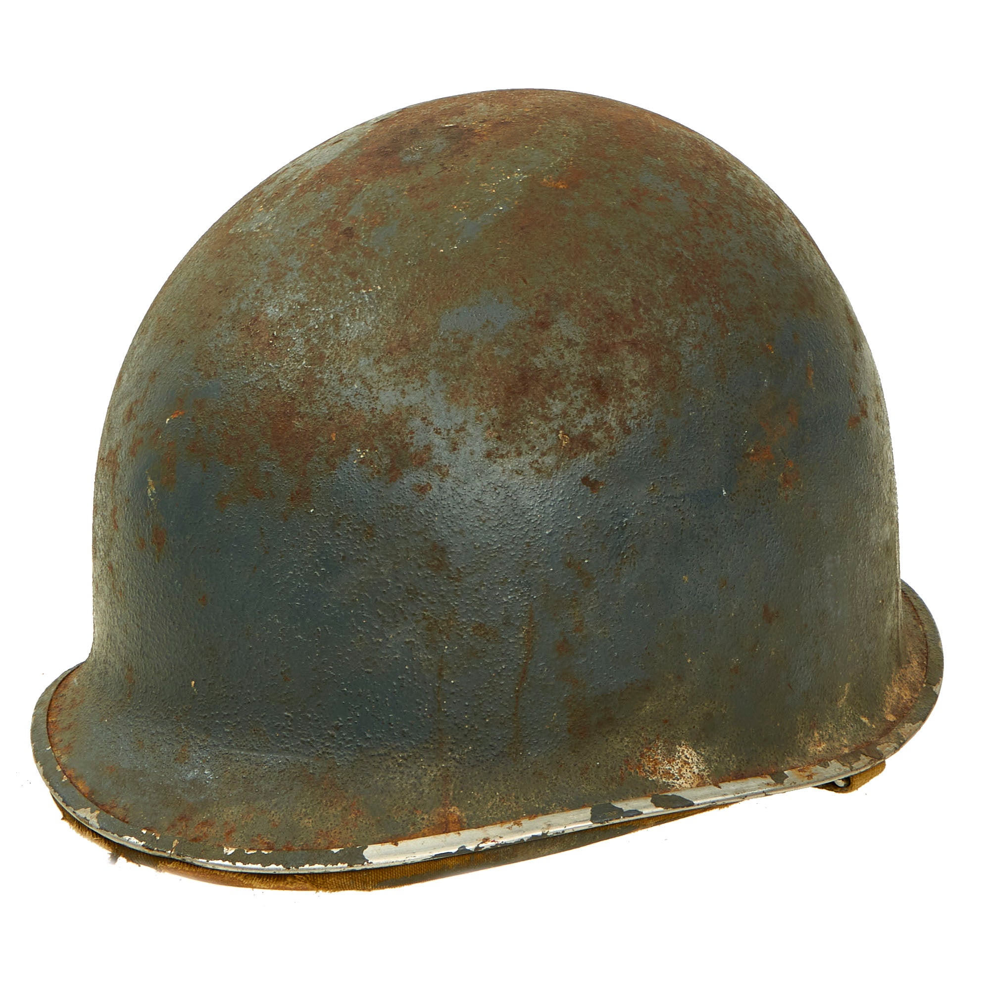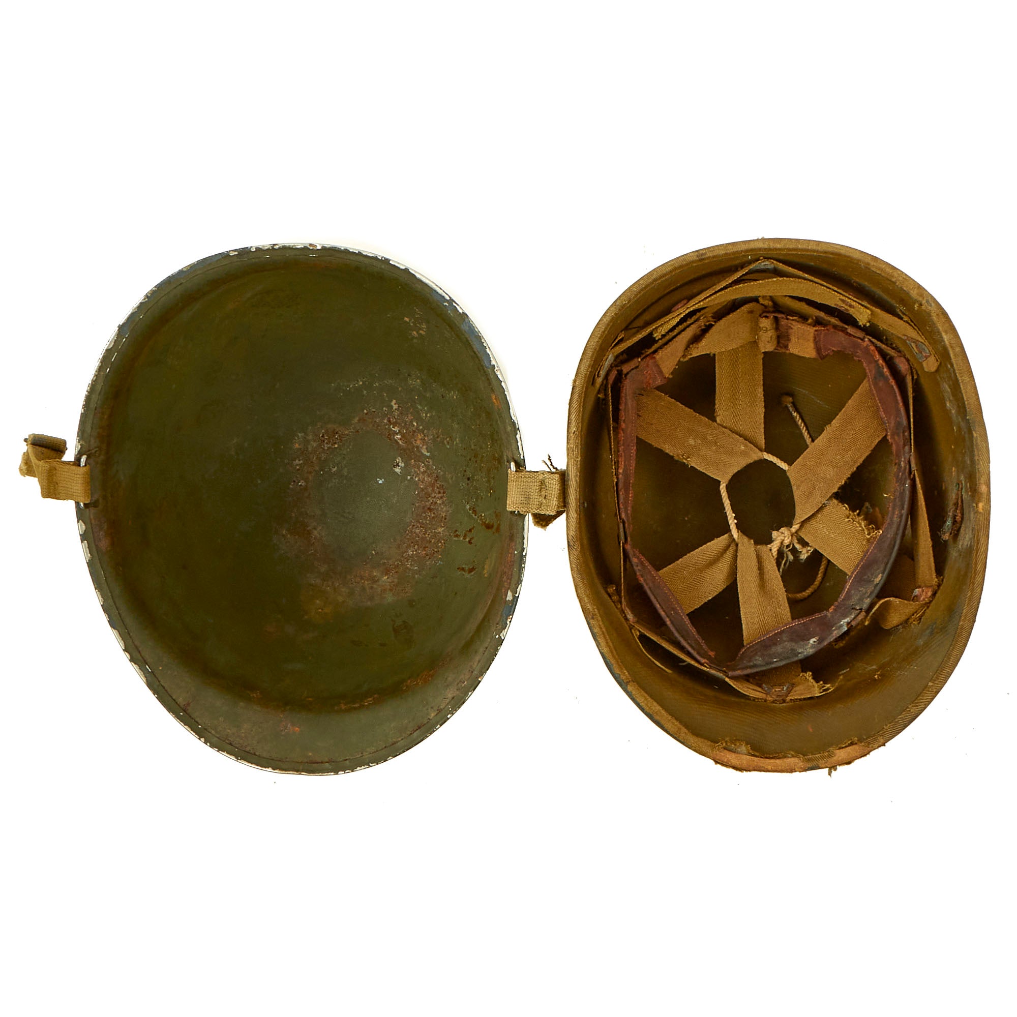 The U.S. WWII M-1 helmet was only produced from 1941 to 1945. The first production batch resulted with over 323,510 M-1 helmets before the start of the American involvement in the war. This helmet is heat-lot stamped 245B, a rather low number which indicates the approximate manufacture date of August 1942.