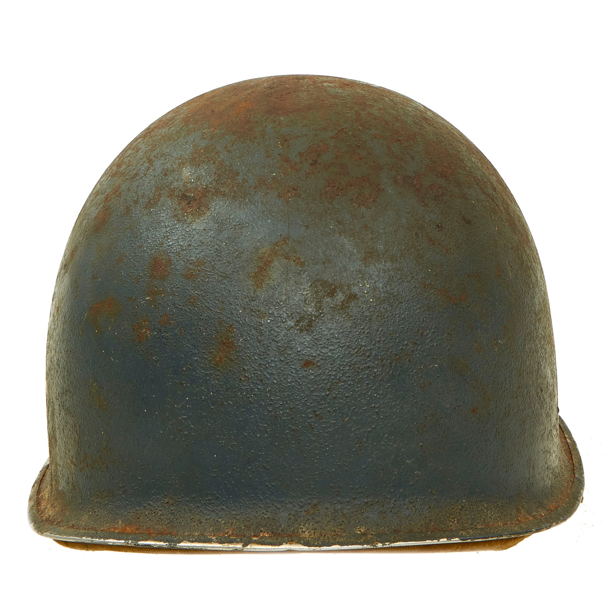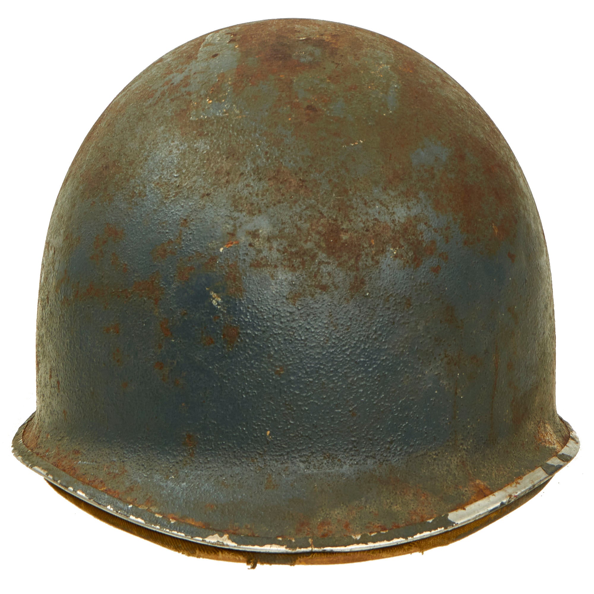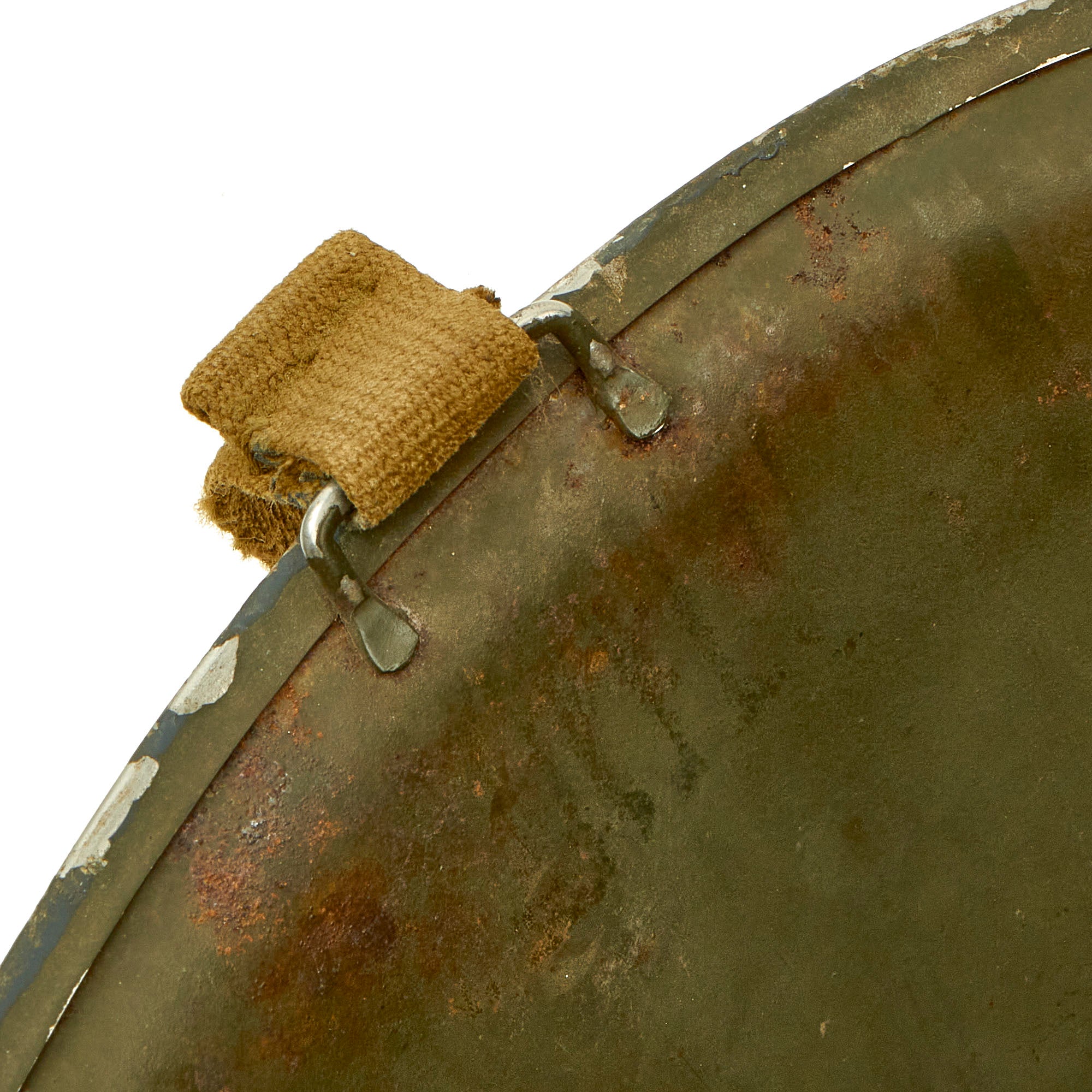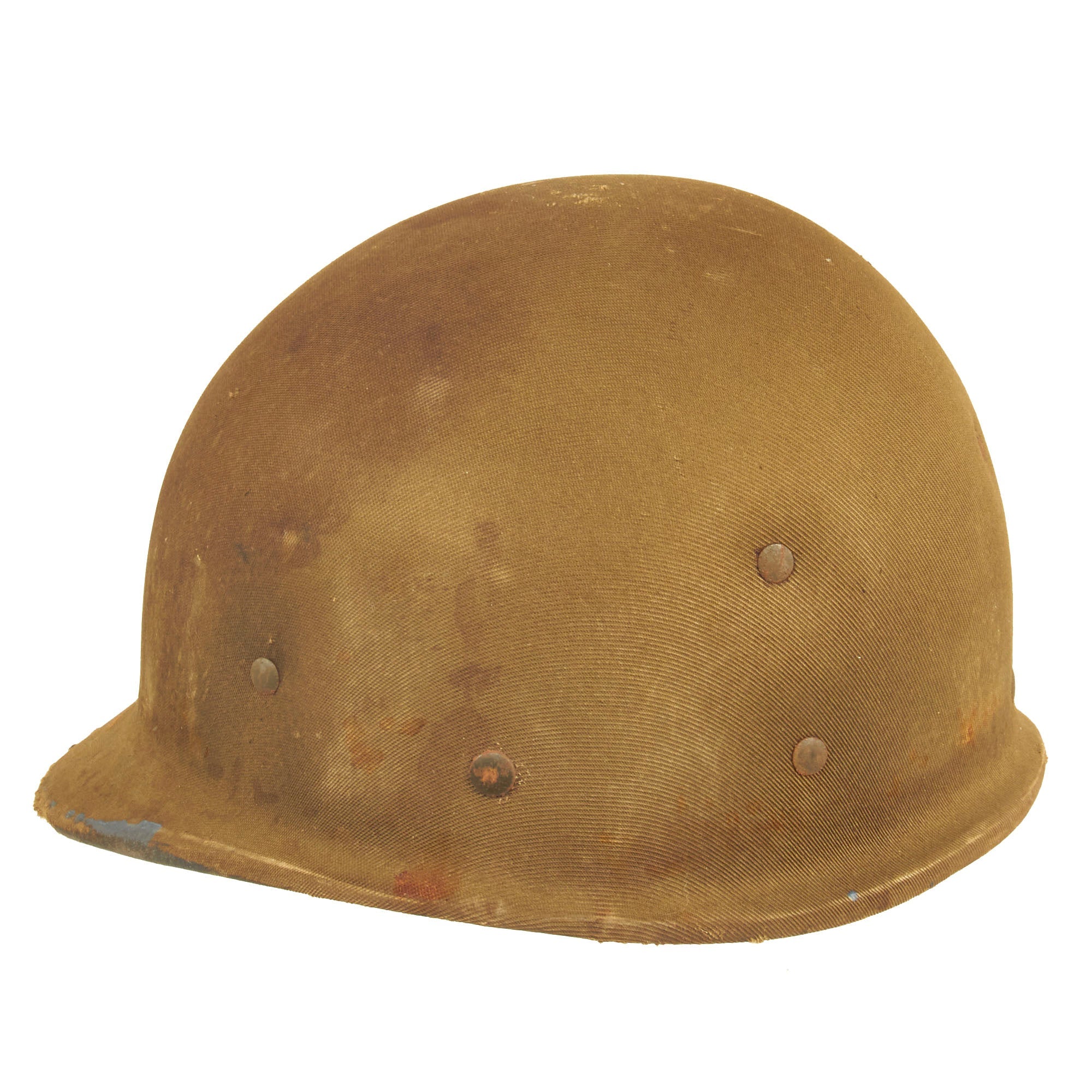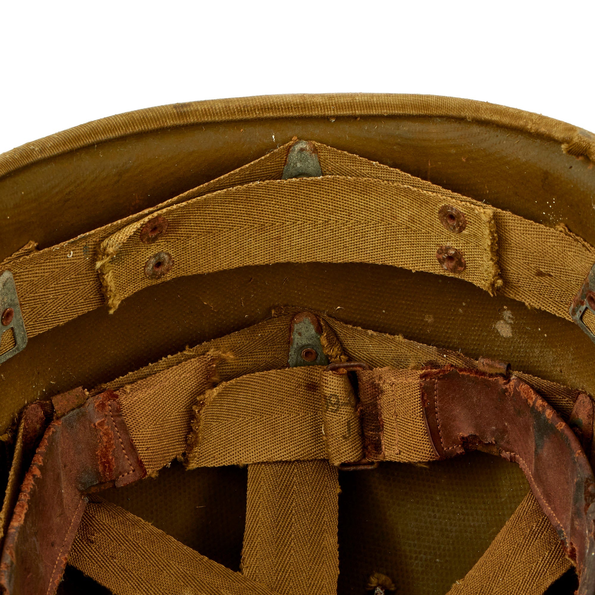 The U.S. WWII M-1 helmet was only produced from 1941 to 1945. The first production batch resulted with over 323,510 M-1 helmets before the start of the American involvement in the war. This helmet is heat-lot stamped 245B, a rather low number which indicates the approximate manufacture date of August 1942.