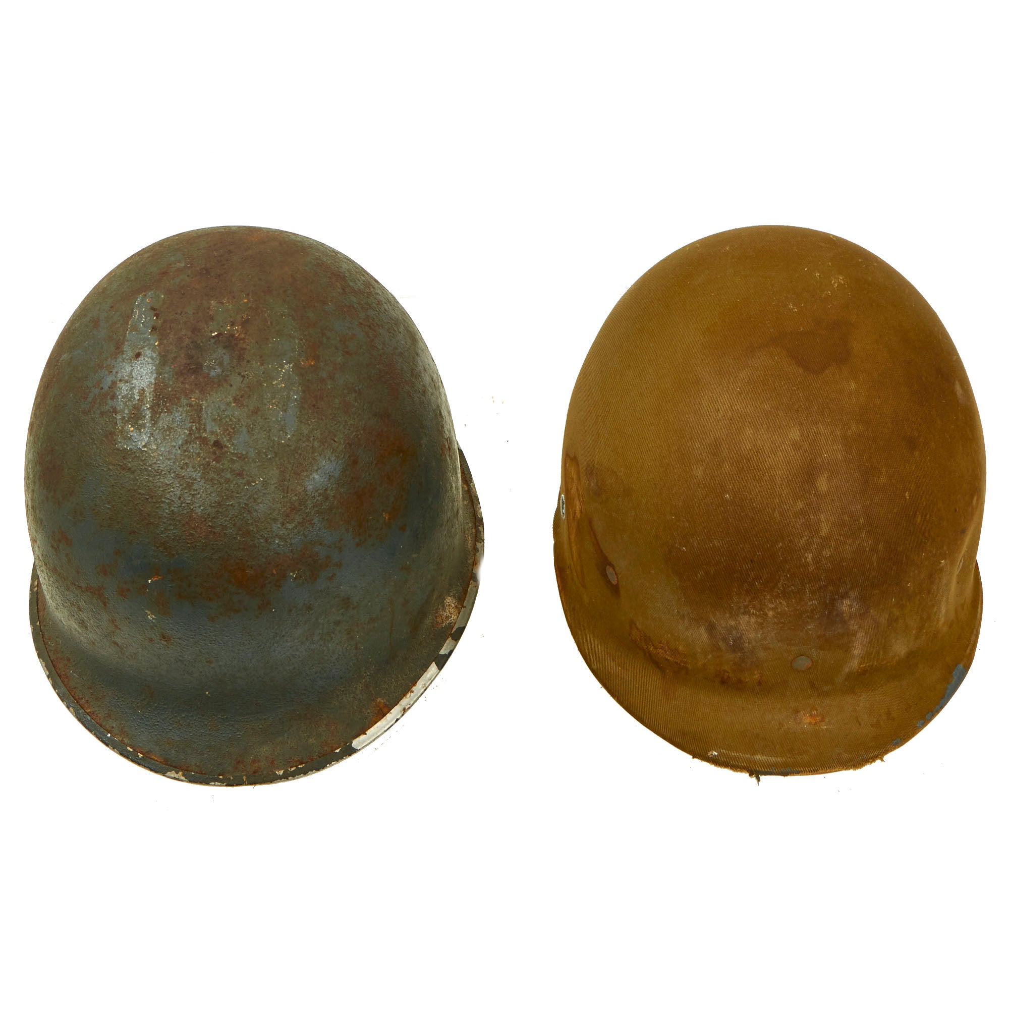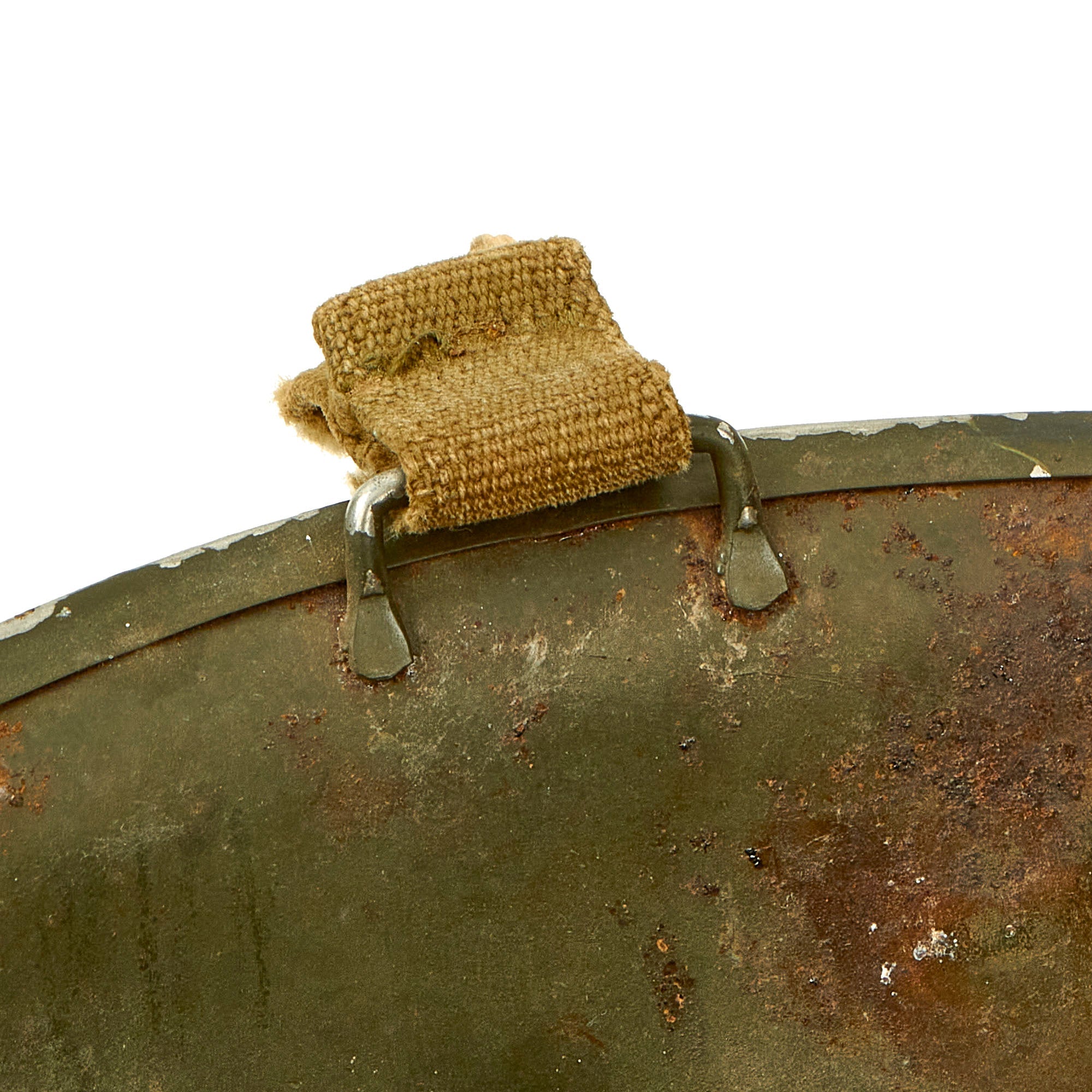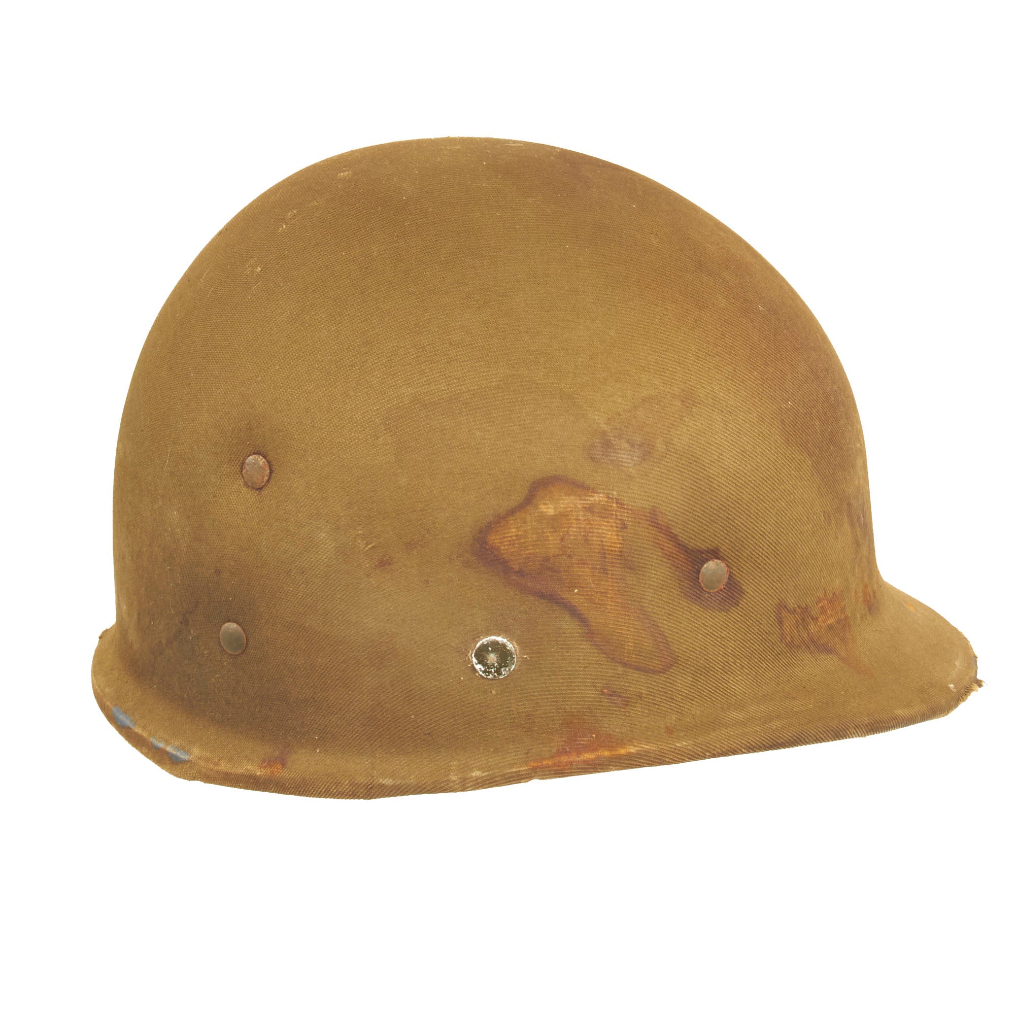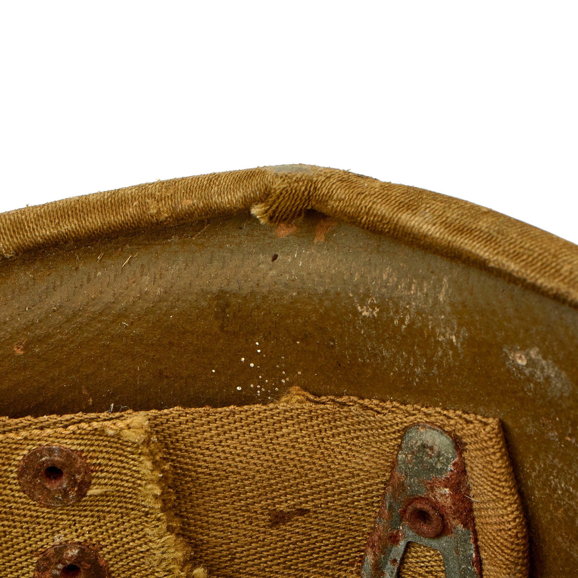 The U.S. WWII M-1 helmet was only produced from 1941 to 1945. The first production batch resulted with over 323,510 M-1 helmets before the start of the American involvement in the war. This helmet is heat-lot stamped 245B, a rather low number which indicates the approximate manufacture date of August 1942.