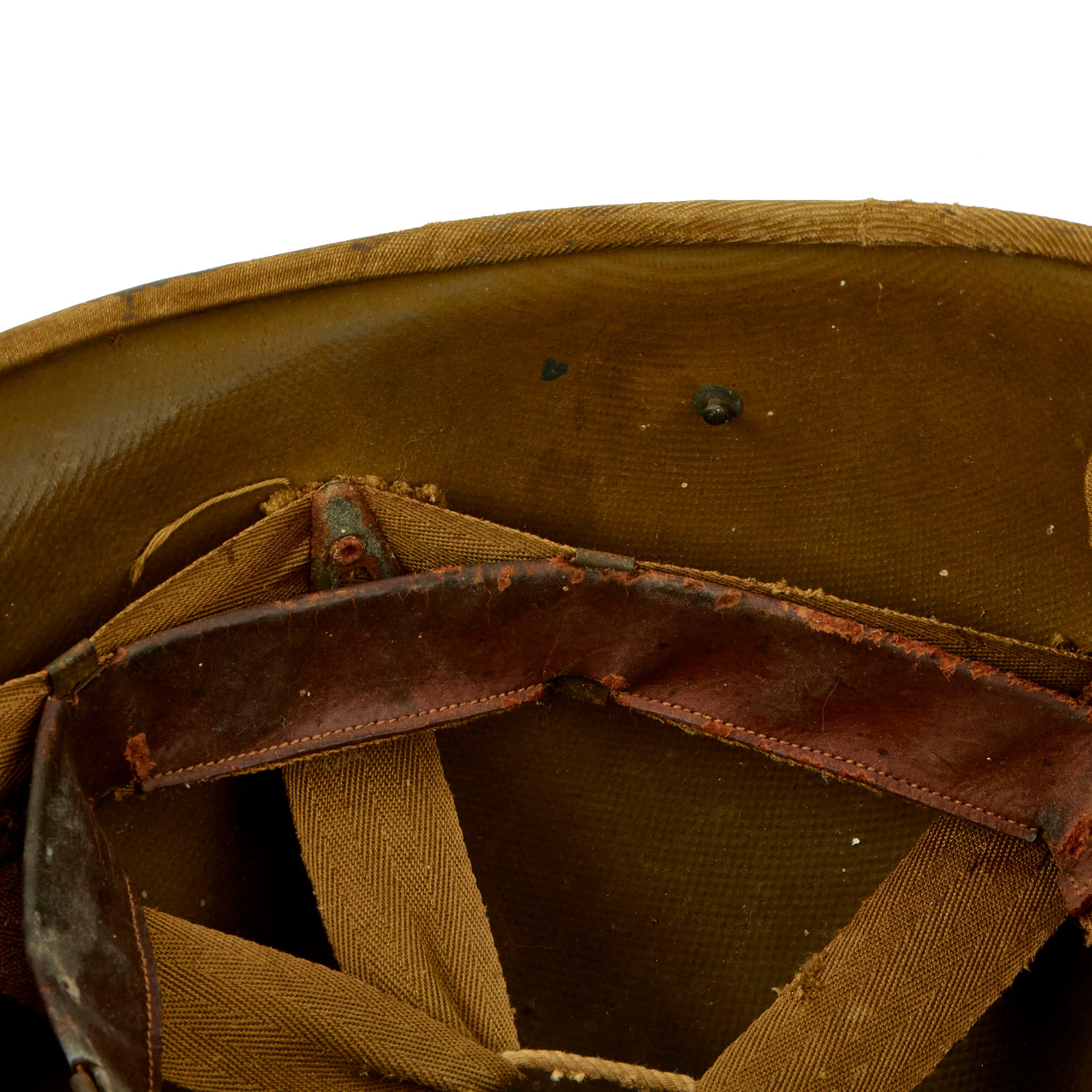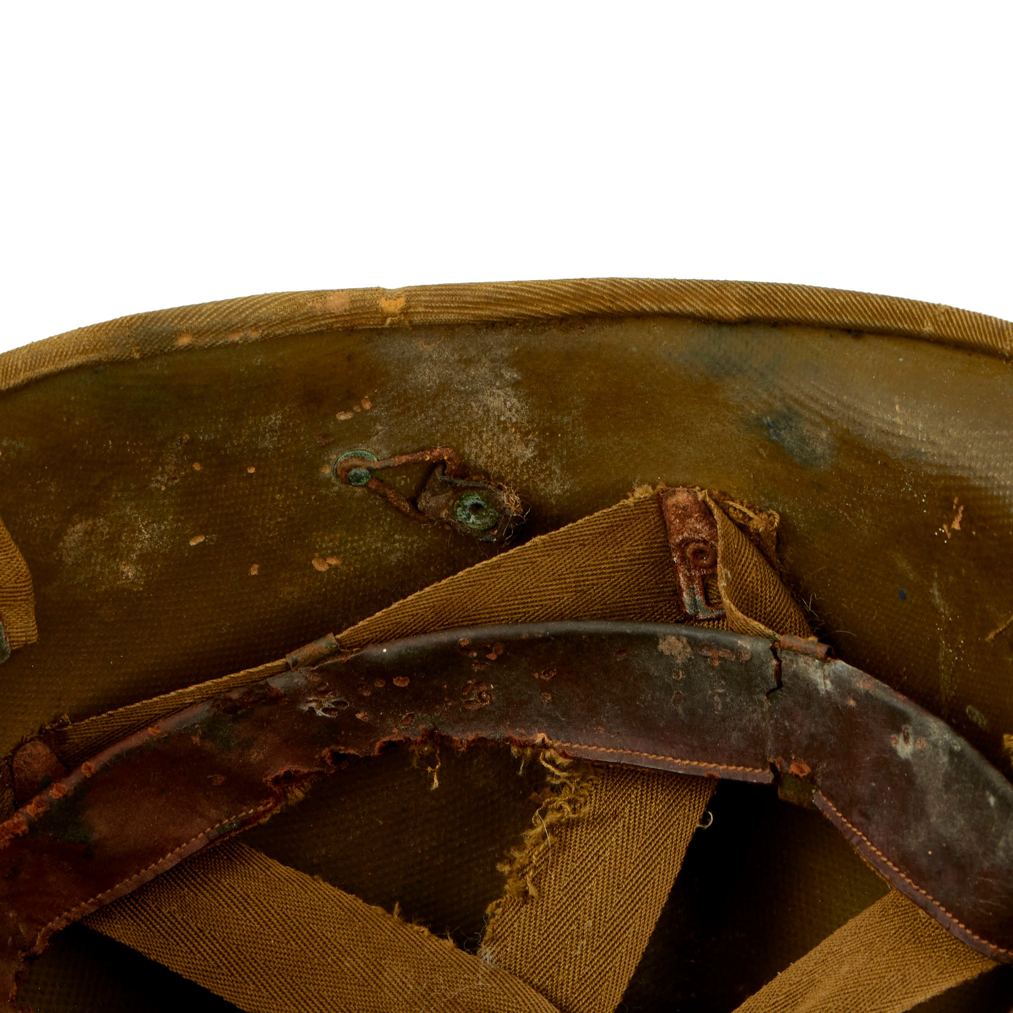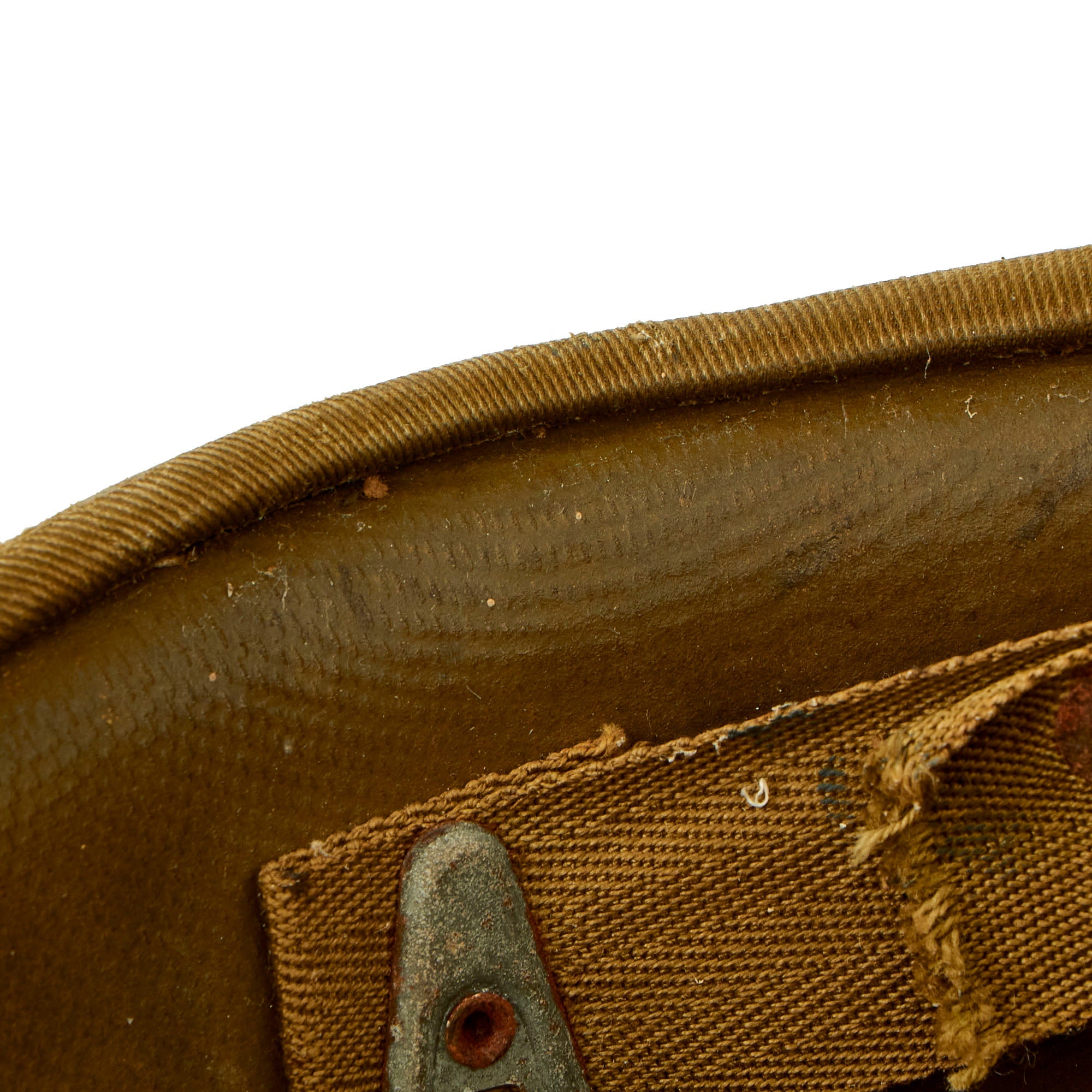 This helmet is a fine example and still retains all of its original WW2 parts and the shell has all original "corked" grain paint with front seam and fixed bails. The chin strap is the correct OD Green #3 with blacked brass hardware. Unfortunately the material on the chinstrap (and other webbing) has fraying and pieces missing.