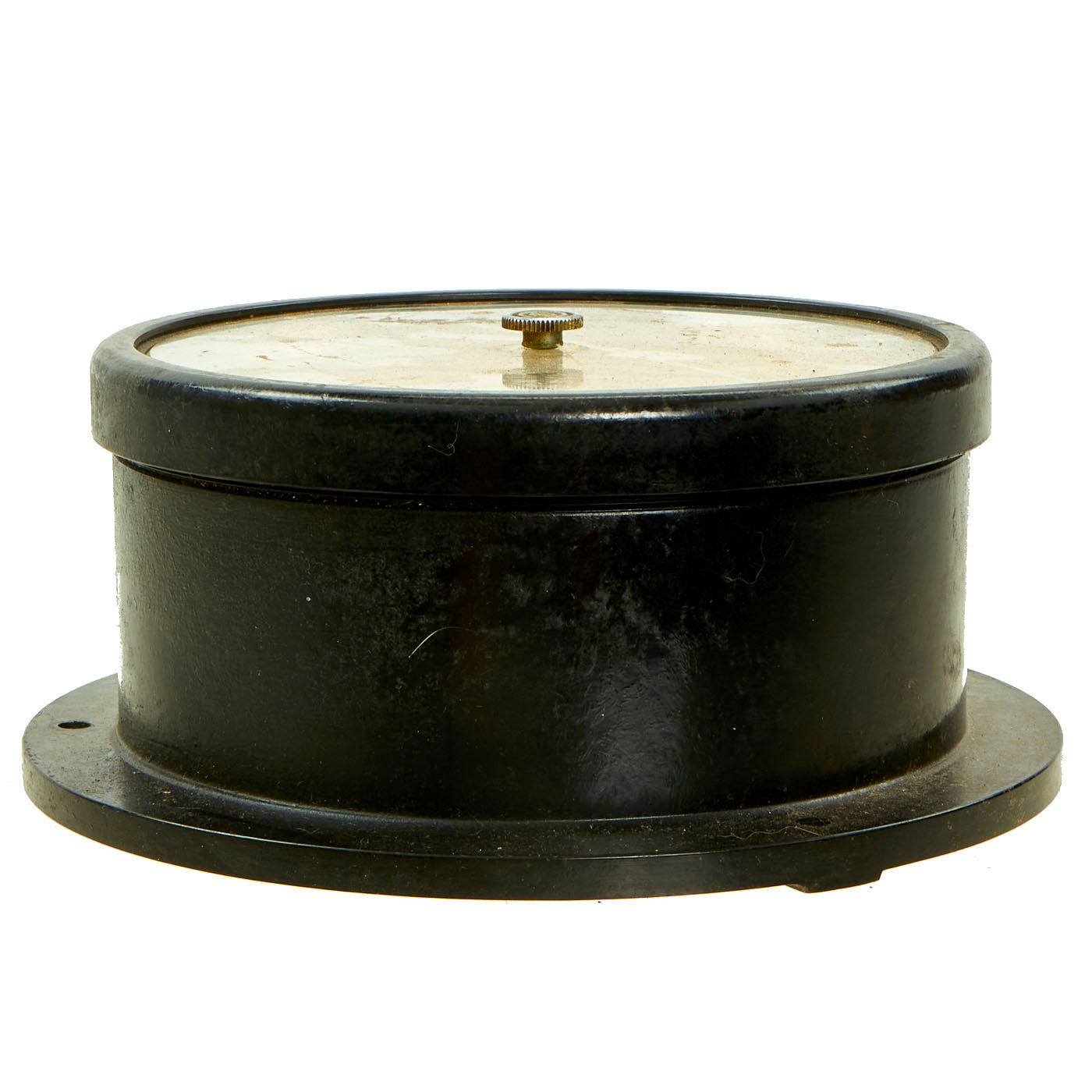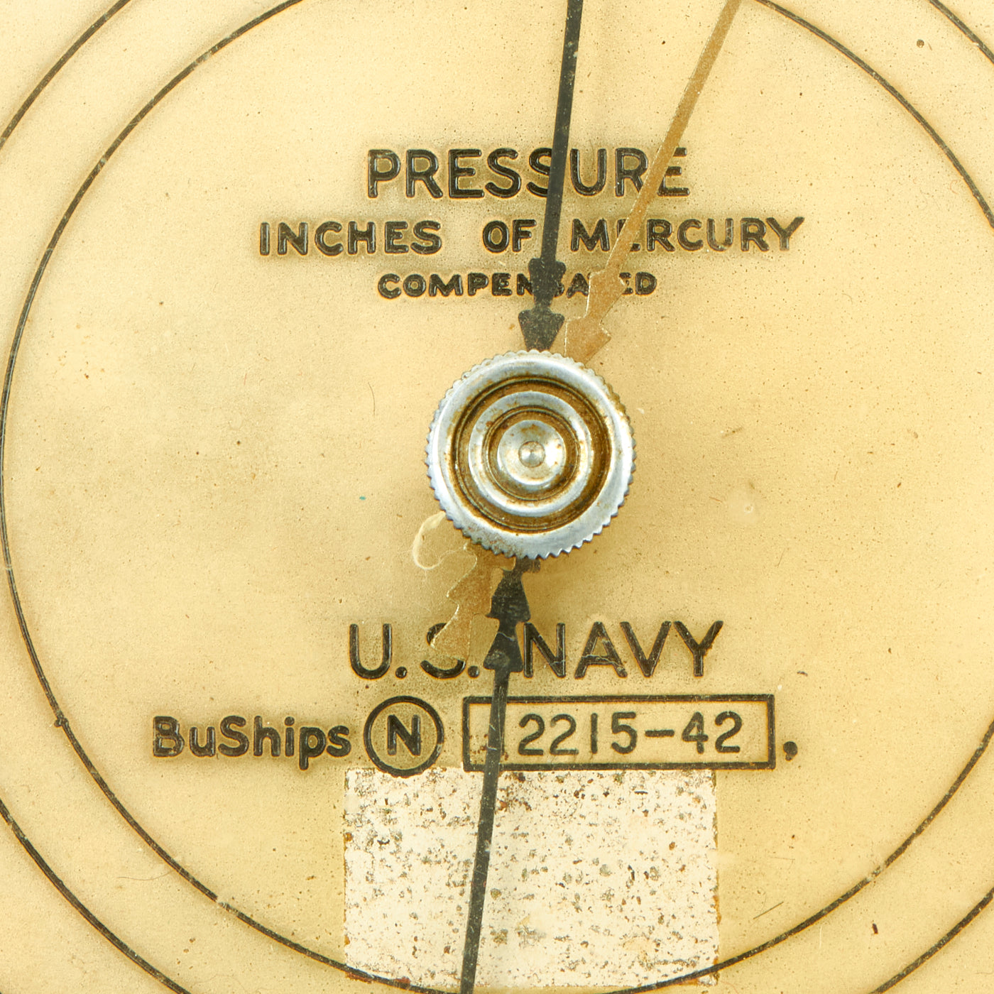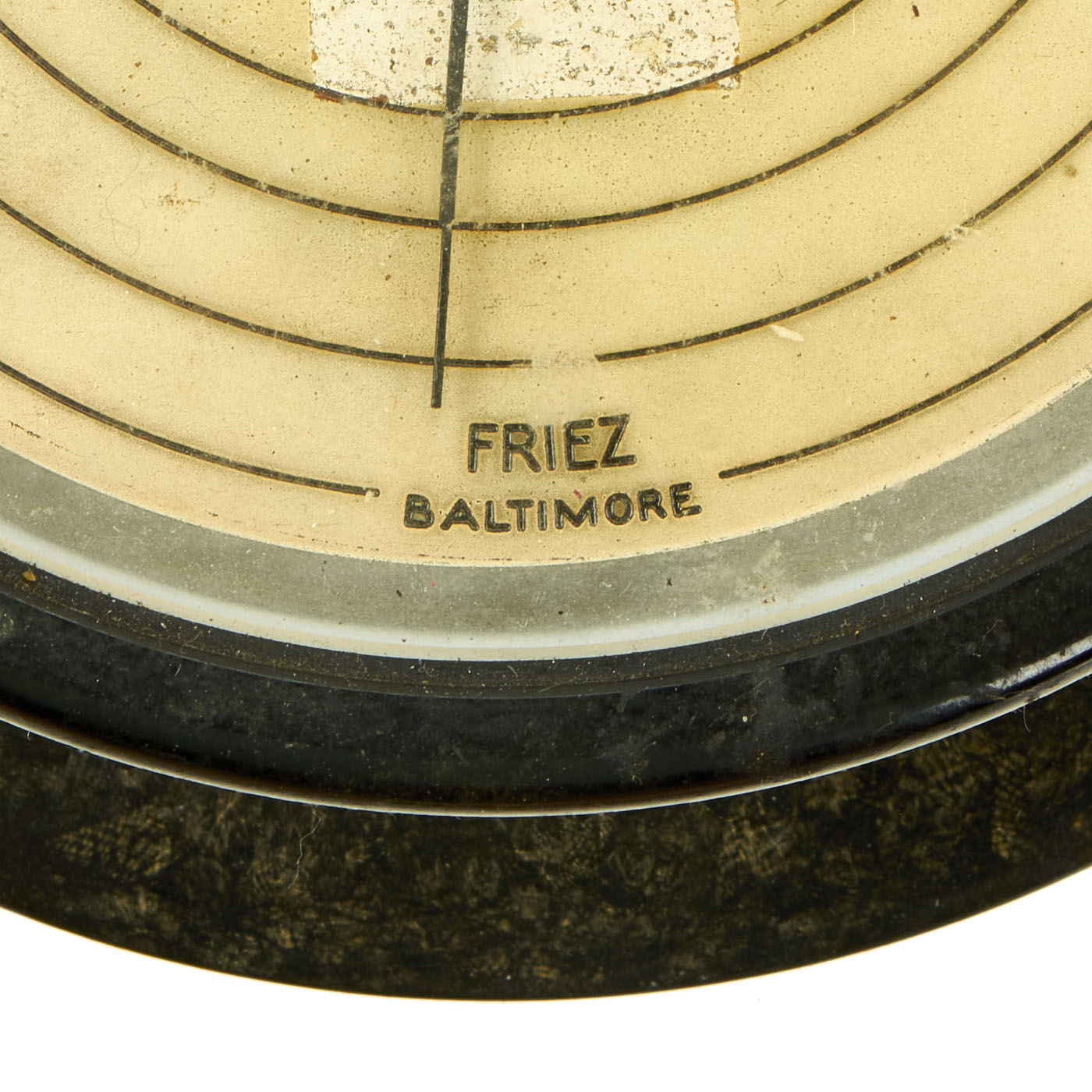 This is a lovely example of a WWII U.S. Navy Barometer in a black phenolic case that measures pressure in inches of mercury. It is identified as from the Bureau of Ships with a number followed by the year of manufacture, 12215-42. Manufactured by Friez, Baltimore as printed at the bottom of the barometer face. The Julien P Friez Company was founded in 1876 in Baltimore, Maryland as a manufacturer of weather instruments. They operated the Belfort Observatory in Baltimore. They became Julien P Friez & Sons in 1913, and Julien died in 1916. In 1929 the company was acquired by the Consolidated Instrument Company. A year later the company was acquired by Bendix Corporation. The Friez company operated relatively independently at first but they began calling themselves the Friez Instrument Division of Bendix sometime around 1943. They continued in operation until about 1966. Bendix was acquired by Allied Corporation (later called AlliedSignal) in 1983, which later bought Honeywell and adopted the Honeywell name.