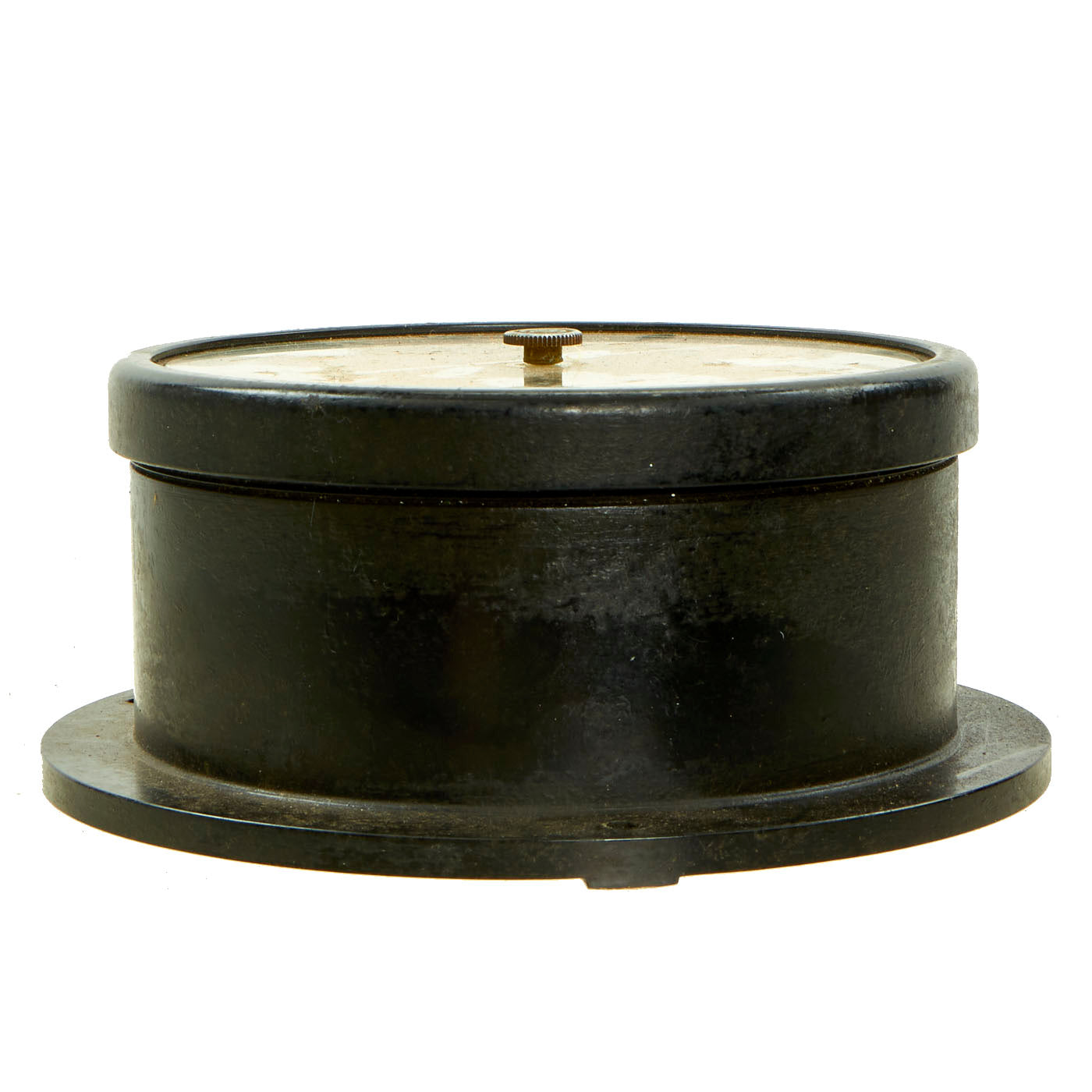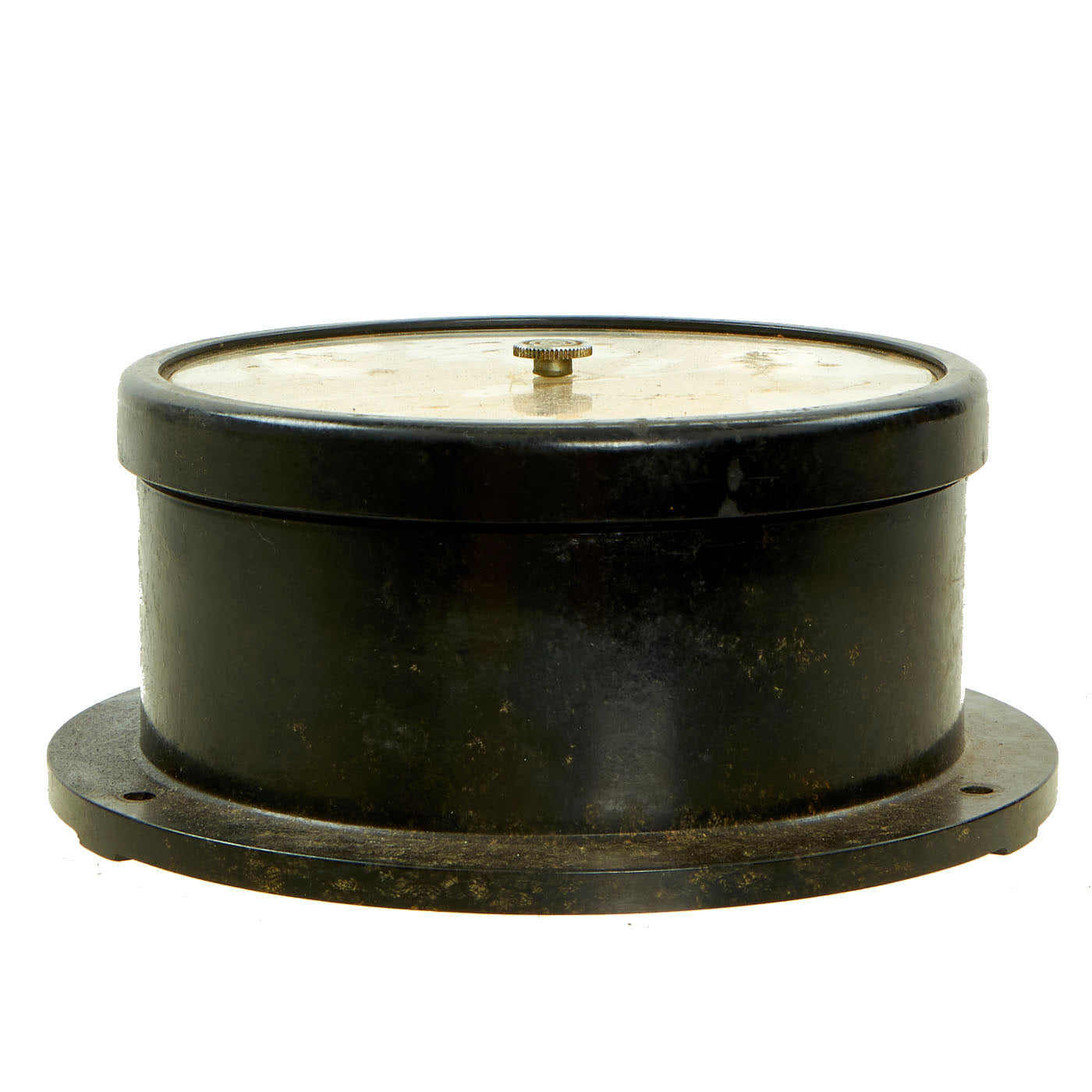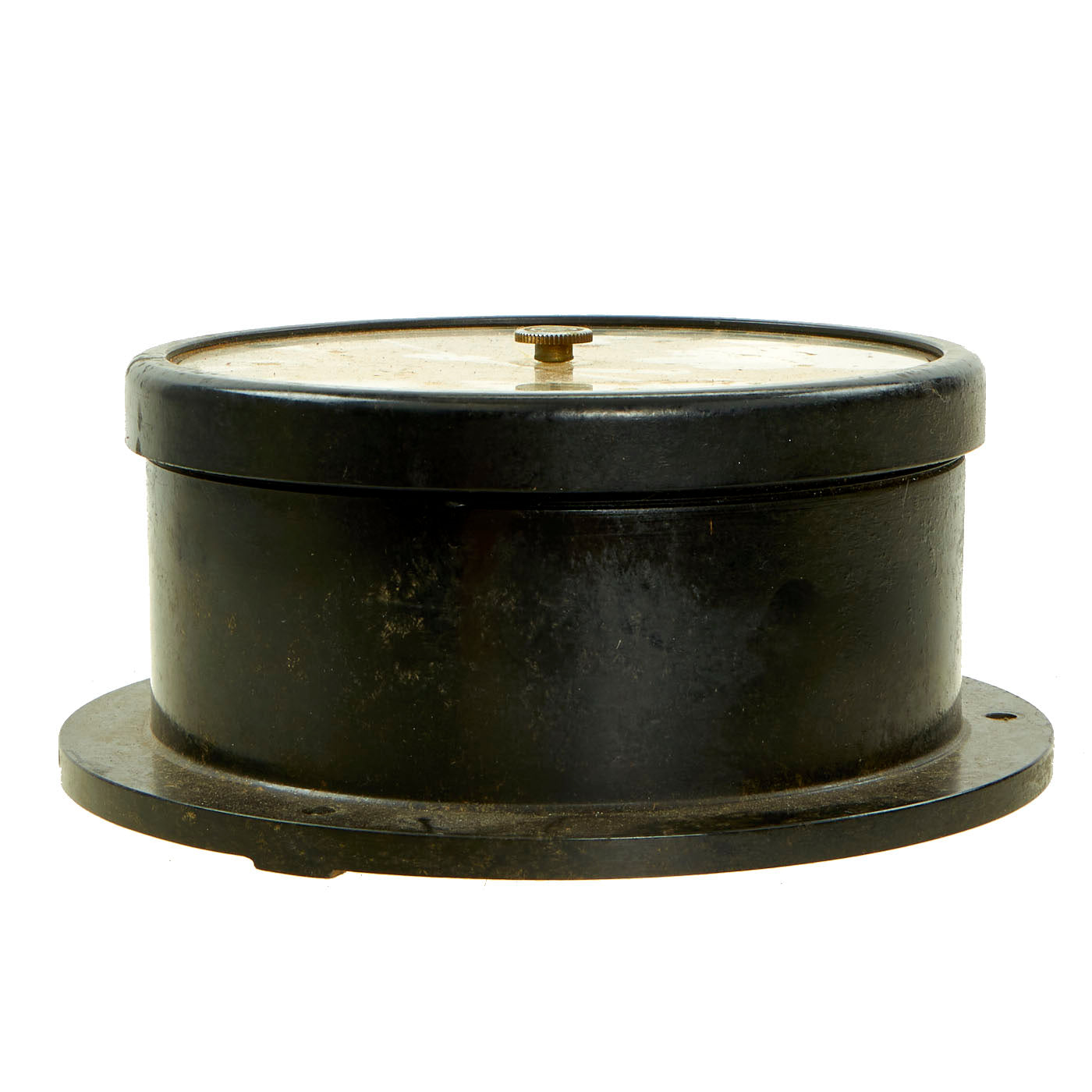 This is a lovely example of a WWII U.S. Navy Barometer in a black phenolic case that measures pressure in inches of mercury. It is identified as from the Bureau of Ships with a number followed by the year of manufacture, 12215-42. Manufactured by Friez, Baltimore as printed at the bottom of the barometer face. The Julien P Friez Company was founded in 1876 in Baltimore, Maryland as a manufacturer of weather instruments. They operated the Belfort Observatory in Baltimore. They became Julien P Friez & Sons in 1913, and Julien died in 1916. In 1929 the company was acquired by the Consolidated Instrument Company. A year later the company was acquired by Bendix Corporation. The Friez company operated relatively independently at first but they began calling themselves the Friez Instrument Division of Bendix sometime around 1943. They continued in operation until about 1966. Bendix was acquired by Allied Corporation (later called AlliedSignal) in 1983, which later bought Honeywell and adopted the Honeywell name.