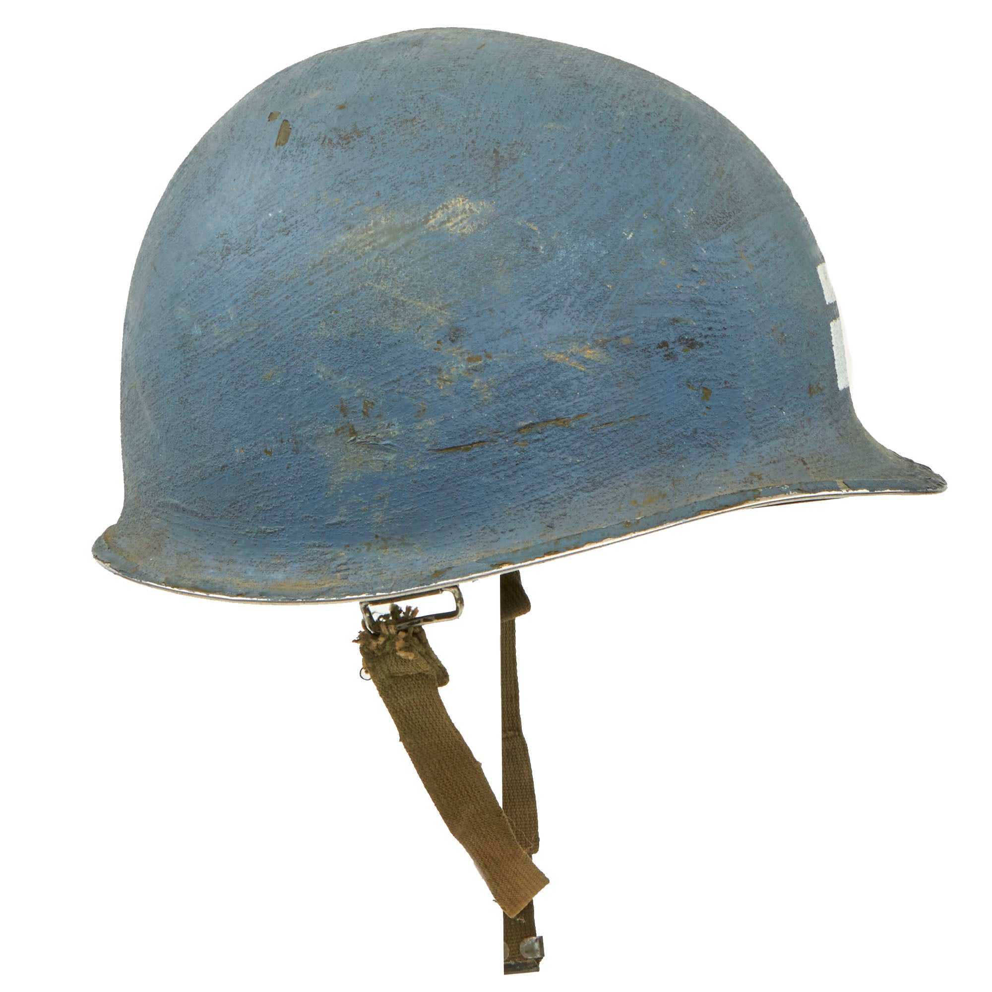 This helmet is a fine example and still retains all of its original WW2 parts and the shell has all original "corked" grain paint, which is still visible under the blue paint. There is also the usual wear on the stainless steel rim. It has the correct late war OD green #3 Chin straps with steel buckles that have trace amounts of green paint. Unfortunately the chinstrap are almost torn through on the bales.