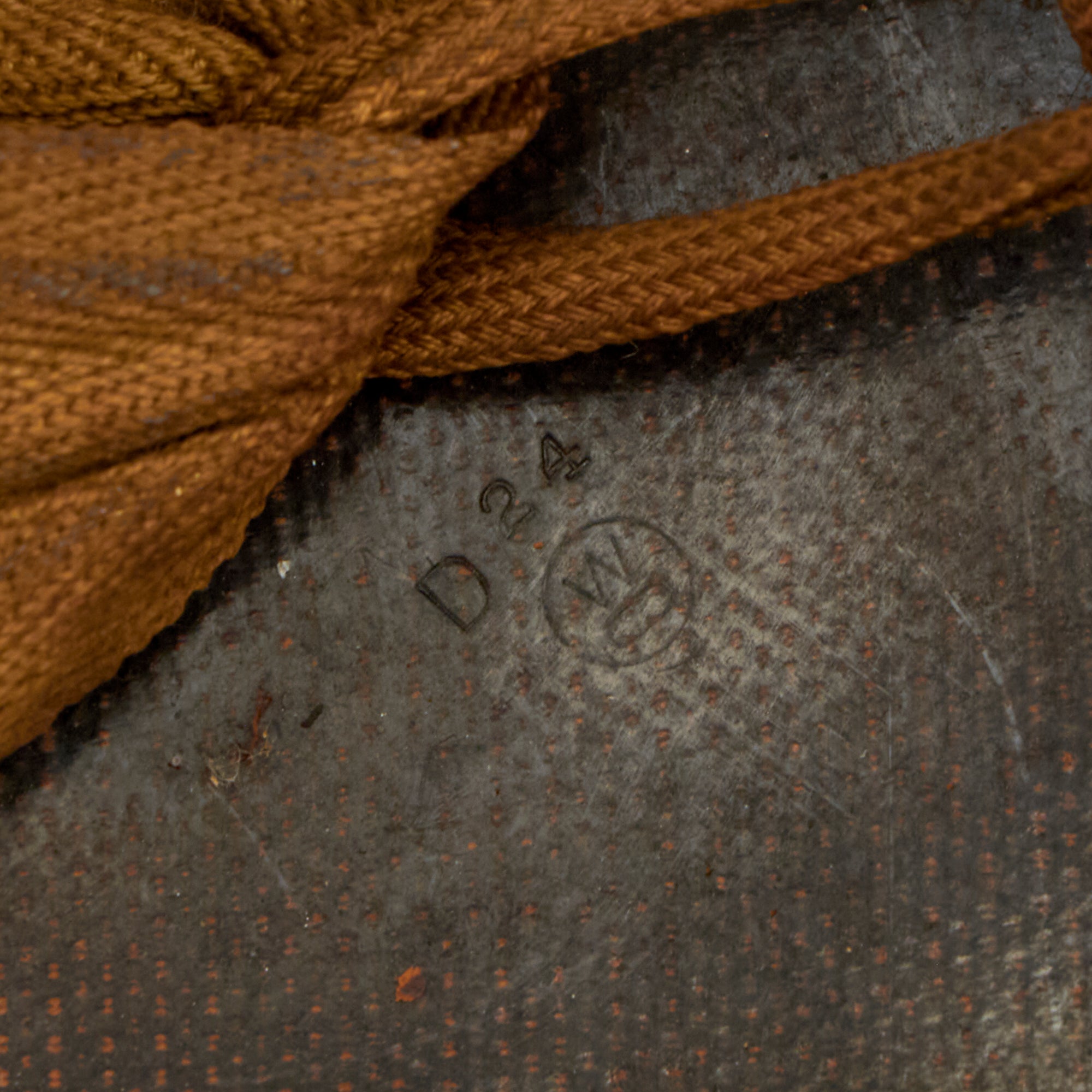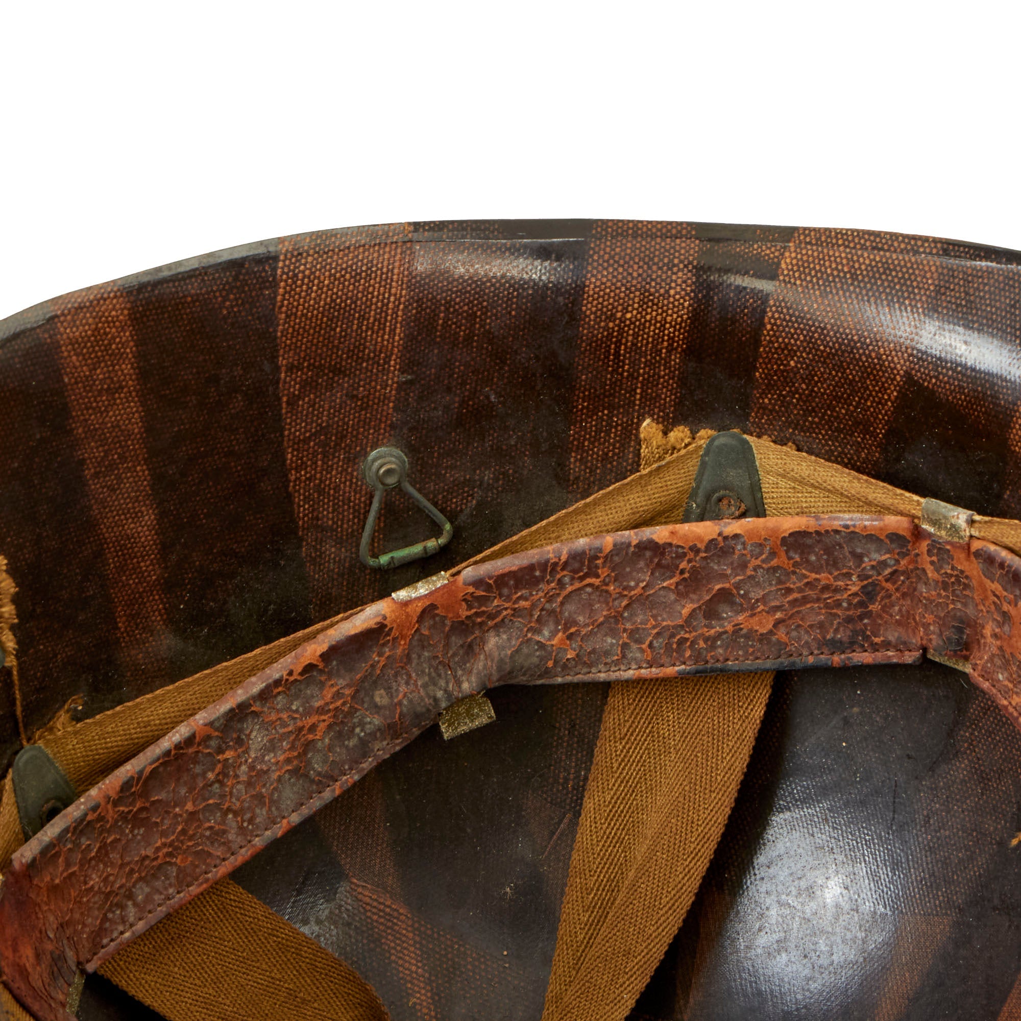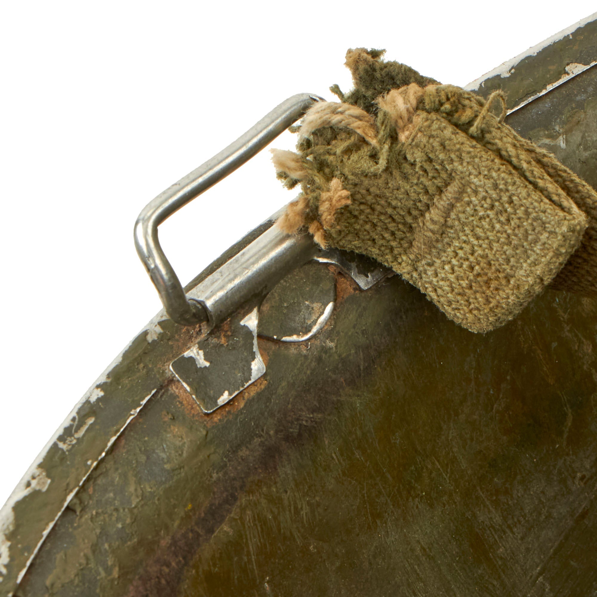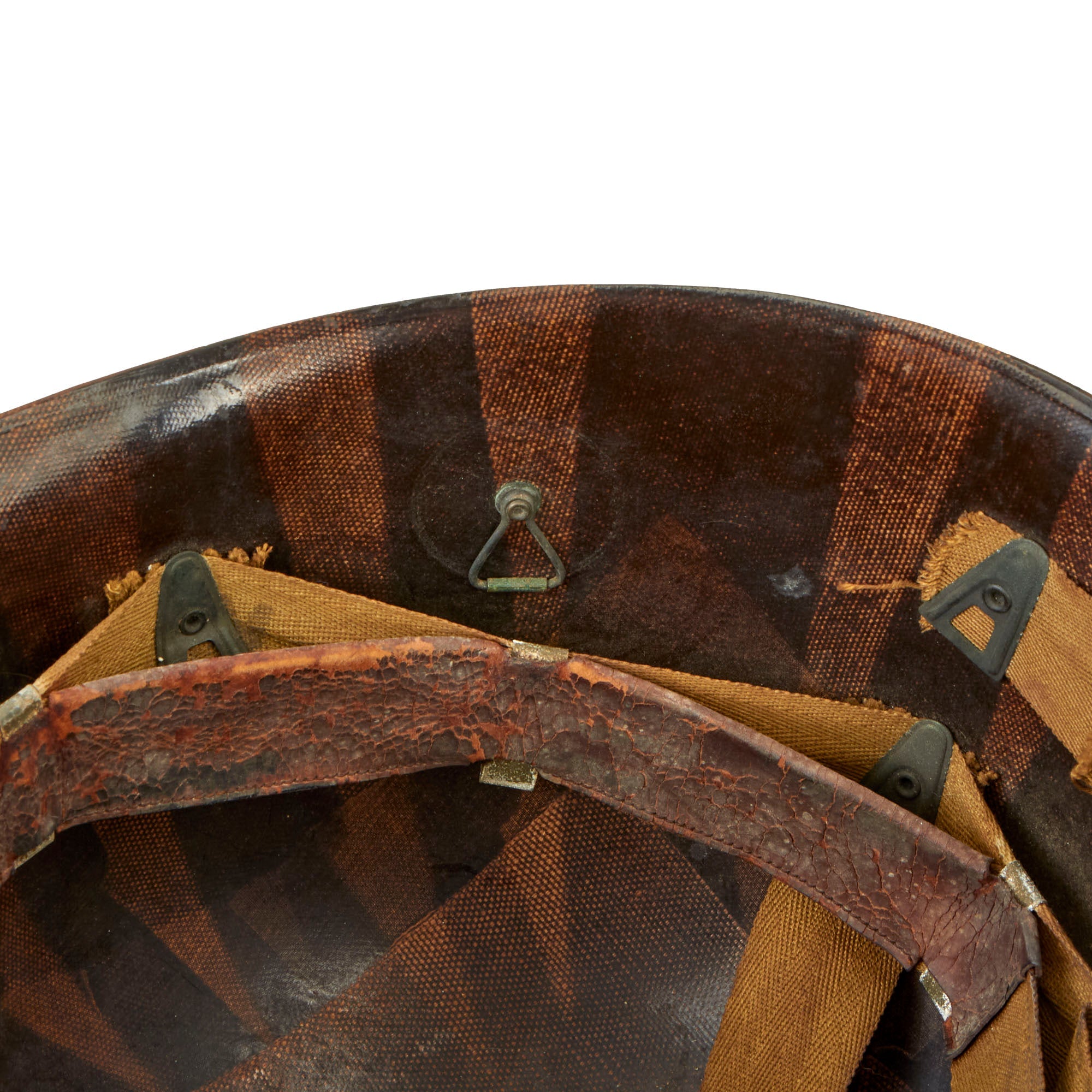 This true US WWII M-1 helmet liner can be identified through the frontal eyelet hole. Other correct WW2 features include cotton herringbone twill (HBT) cloth suspension. This HBT suspension is held tightly within the M-1 helmet liner by rivets and a series of triangular "A" washers. The three upper suspension bands are usually joined together with a string but unfortunately one of the suspension bands is missing completely. This way the wearer could adjust the fit. The original leather chin strap is missing.