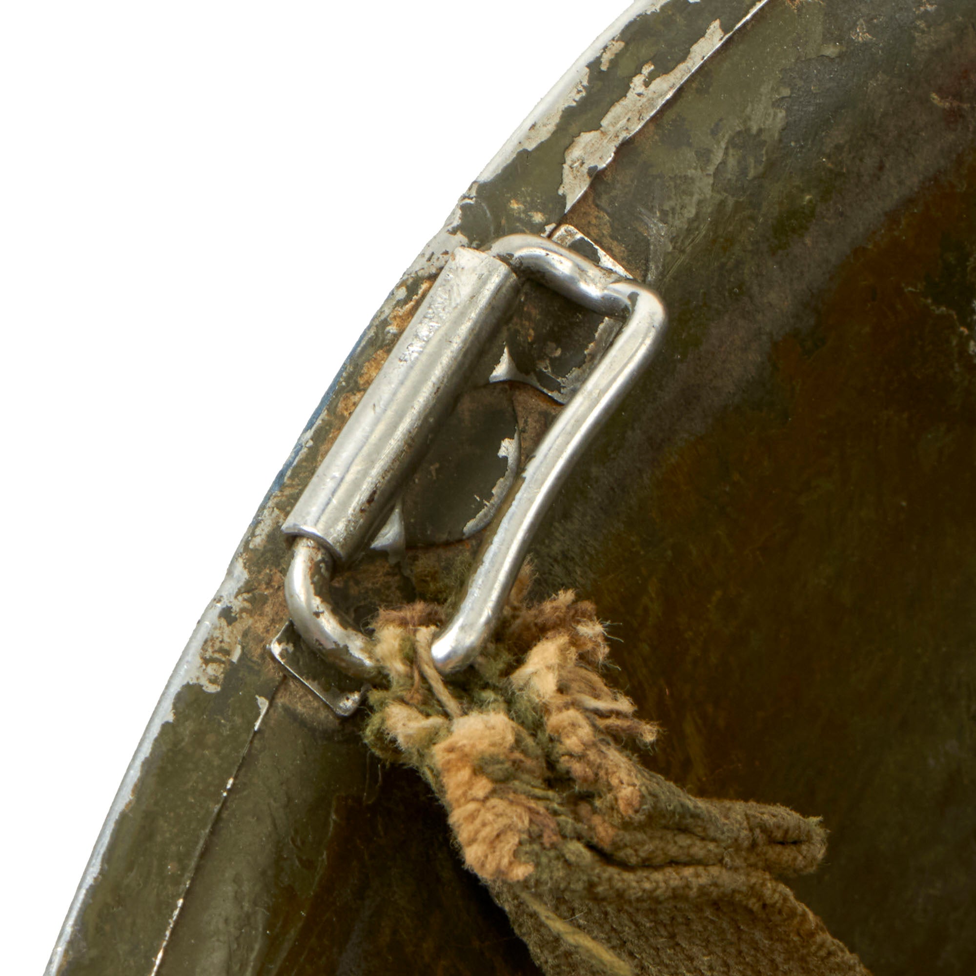 This very good condition M1 shell has correct mid war swivel chinstrap loops, called "bales," and a stainless steel rim with a front fully welded seam. These rims were both rust resistant and had "non-magnetic qualities" that reduced the chance of error readings when placed around certain sensitive equipment (such as a compass). In November 1944 the specification was changed to have the rim seam in the rear of the helmet.