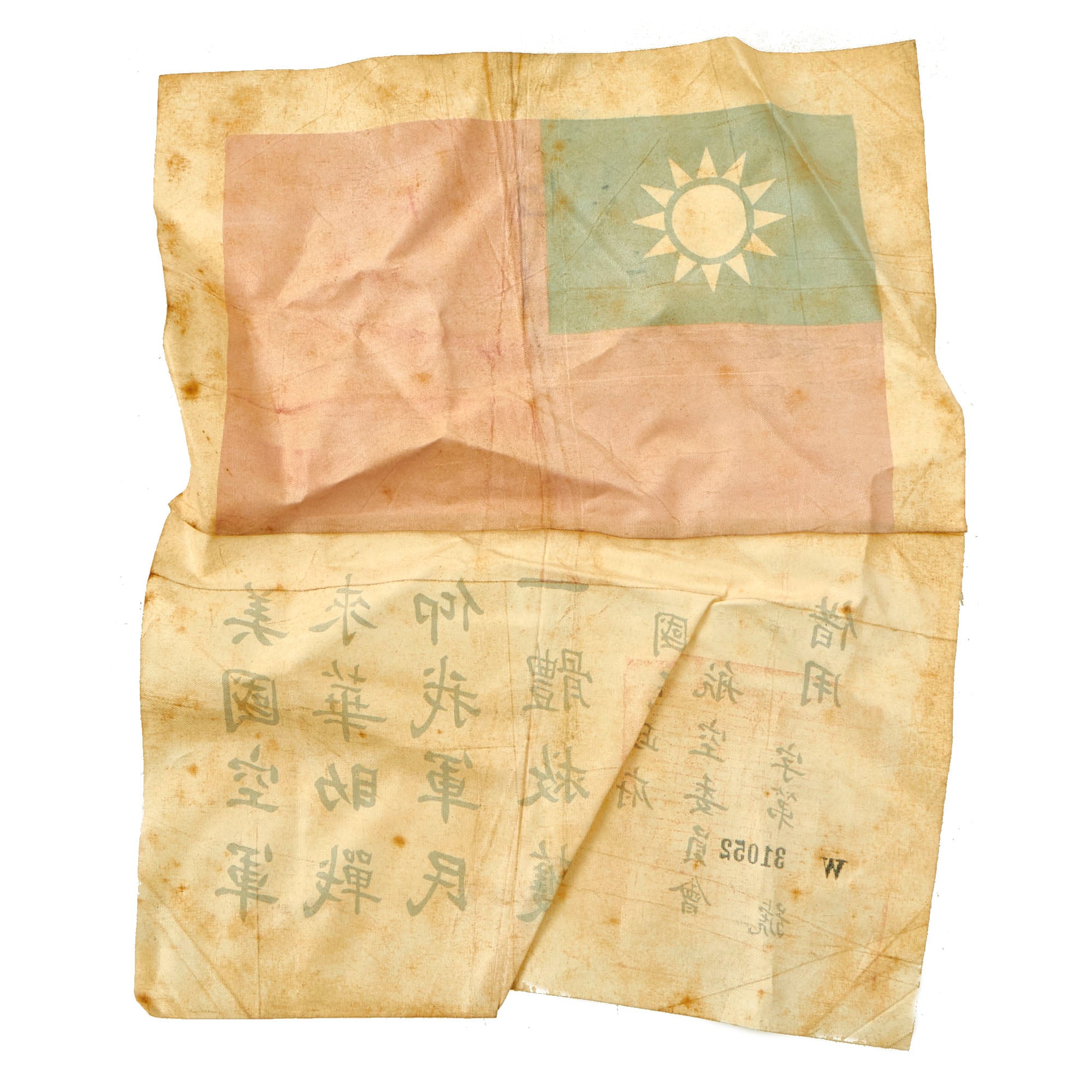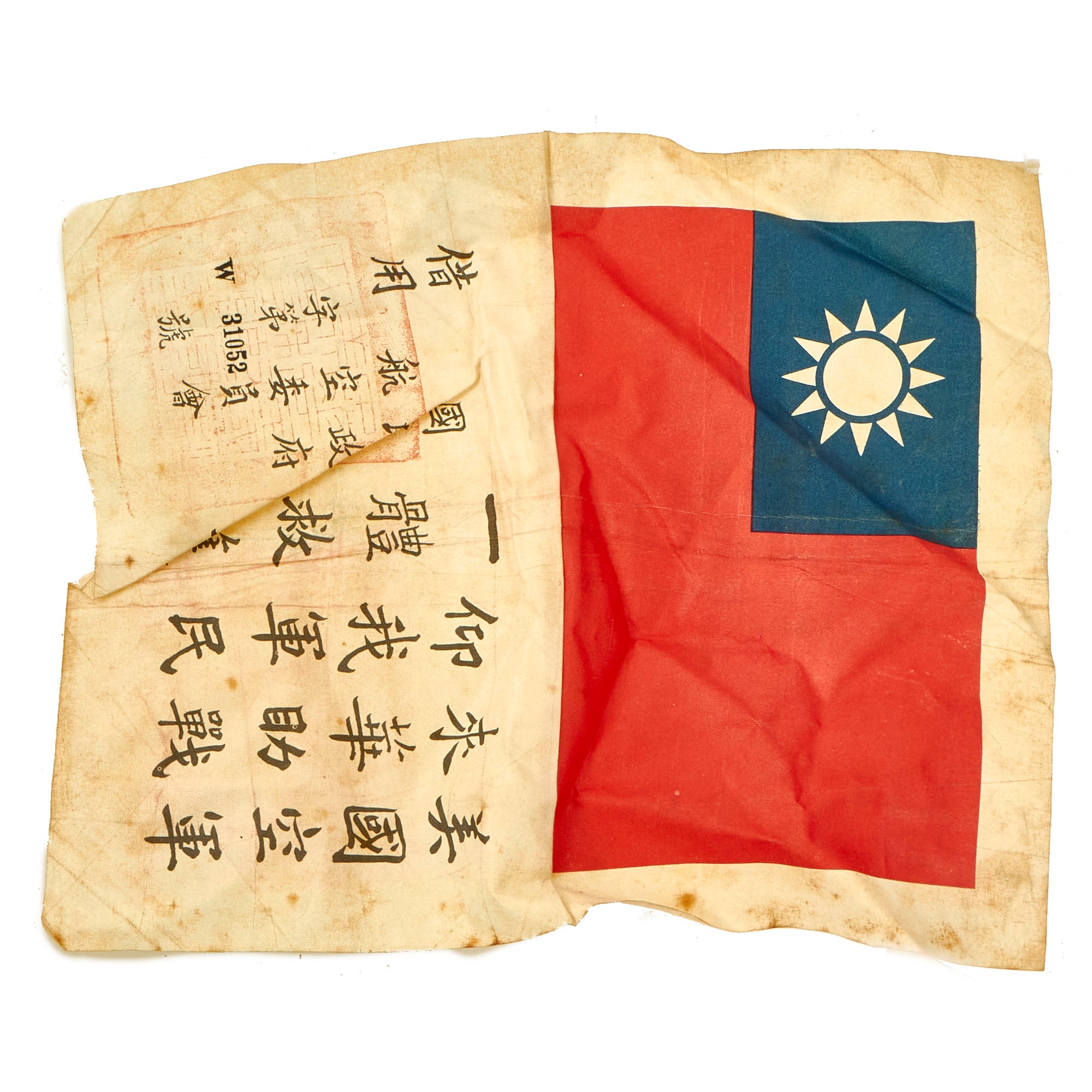 - 10” x 8” Chinese Flag Blood Chit: This would have been stitched to the back or inside lining of a U.S. Aviator flight jacket. This example is marked with an identification number, and these are part of the standard contents of a China Burma India Survival set. Condition is very good, with just a bit of staining and a small hole, as well as creases from decades of being folded.