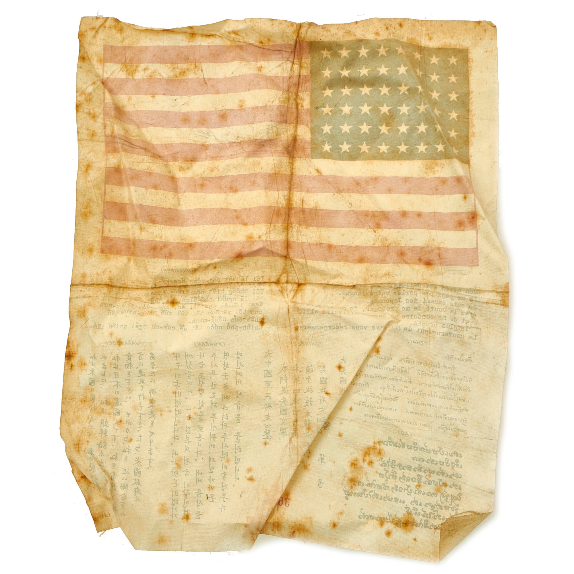 - 11 ½” x 9 ½” American Flag Blood Chit: . This is an excellent condition silk blood chit from World War Two. It is a printed 48 Star American Flag and a message printed in 7 languages.