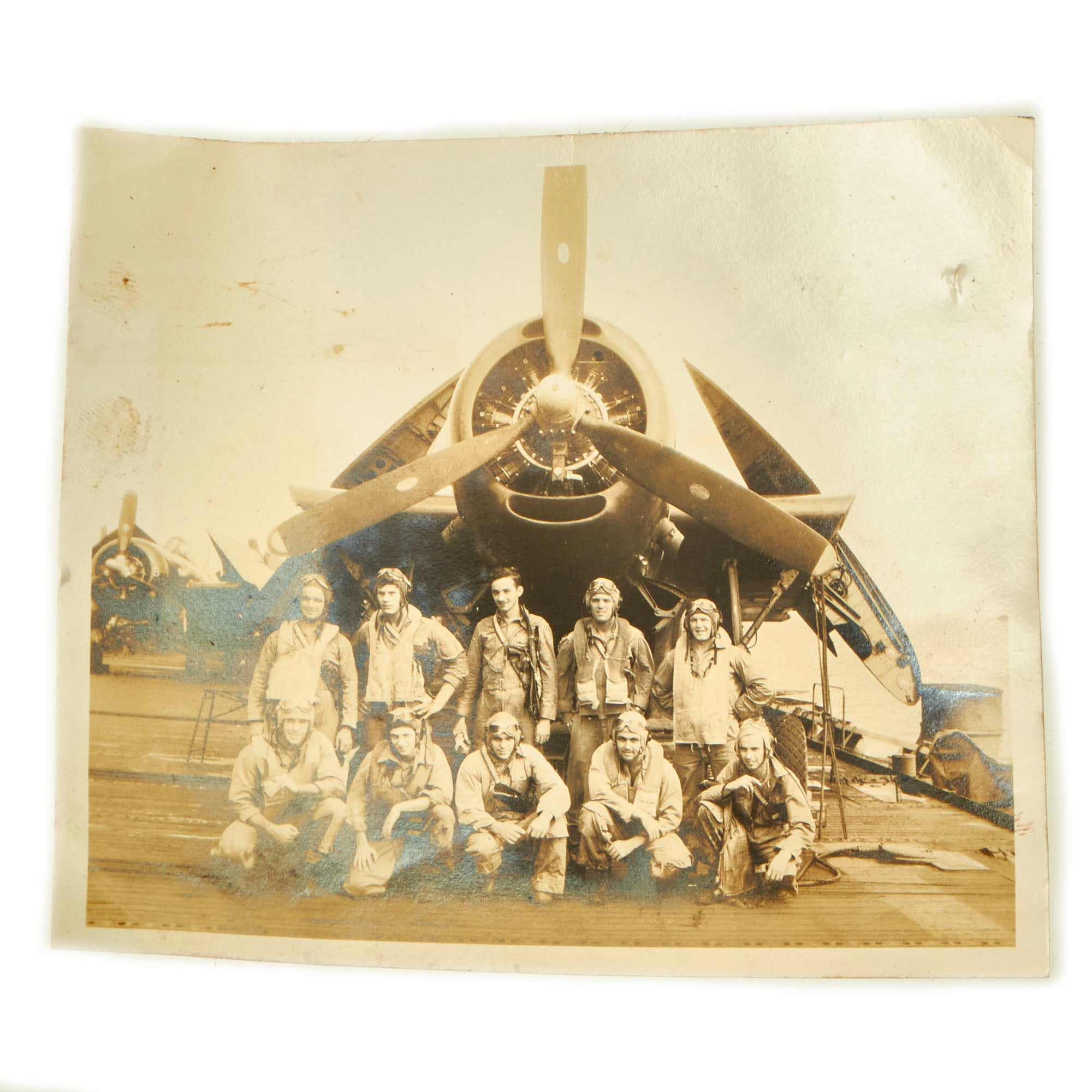 - 4” x 3 ½” Photo: The photo is of 10 Pilots/Crewmen standing in front of a Grumman TBM with Sto-Wing folding wings. The Grumman-patented Sto-Wing aftwards-folding wing folding system, pioneered on the Grumman F4F-4 Wildcat, has been used since World War II on a number of Grumman-designed carrier aircraft, a version of which is still in use in the 21st century on the Grumman E-2 Hawkeye shipboard airborne early warning (AEW) aircraft and its C-2 Greyhound derivative.