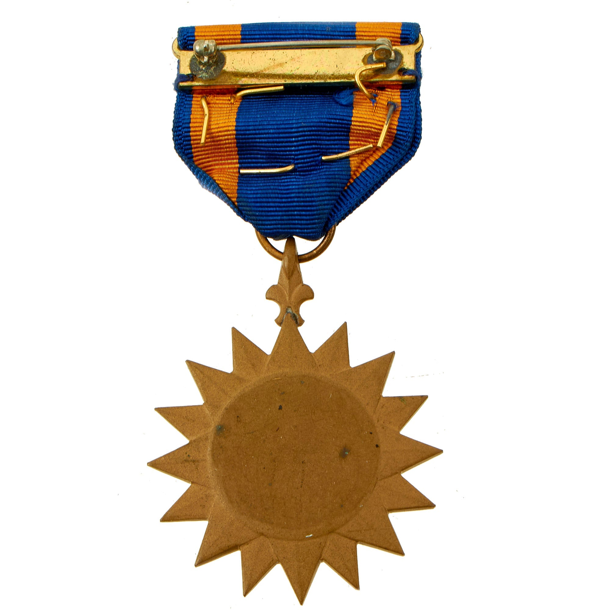 For those who have participated in actual combat missions, gold service stars are worn pinned to the top of the decoration. Upon earning more than three gold stars, silver stars are awarded in recognition of three gold stars, meaning three silver equates to nine gold plus the initial award of the combat aircrew device. This one appears to just be 3 GOLD stars.