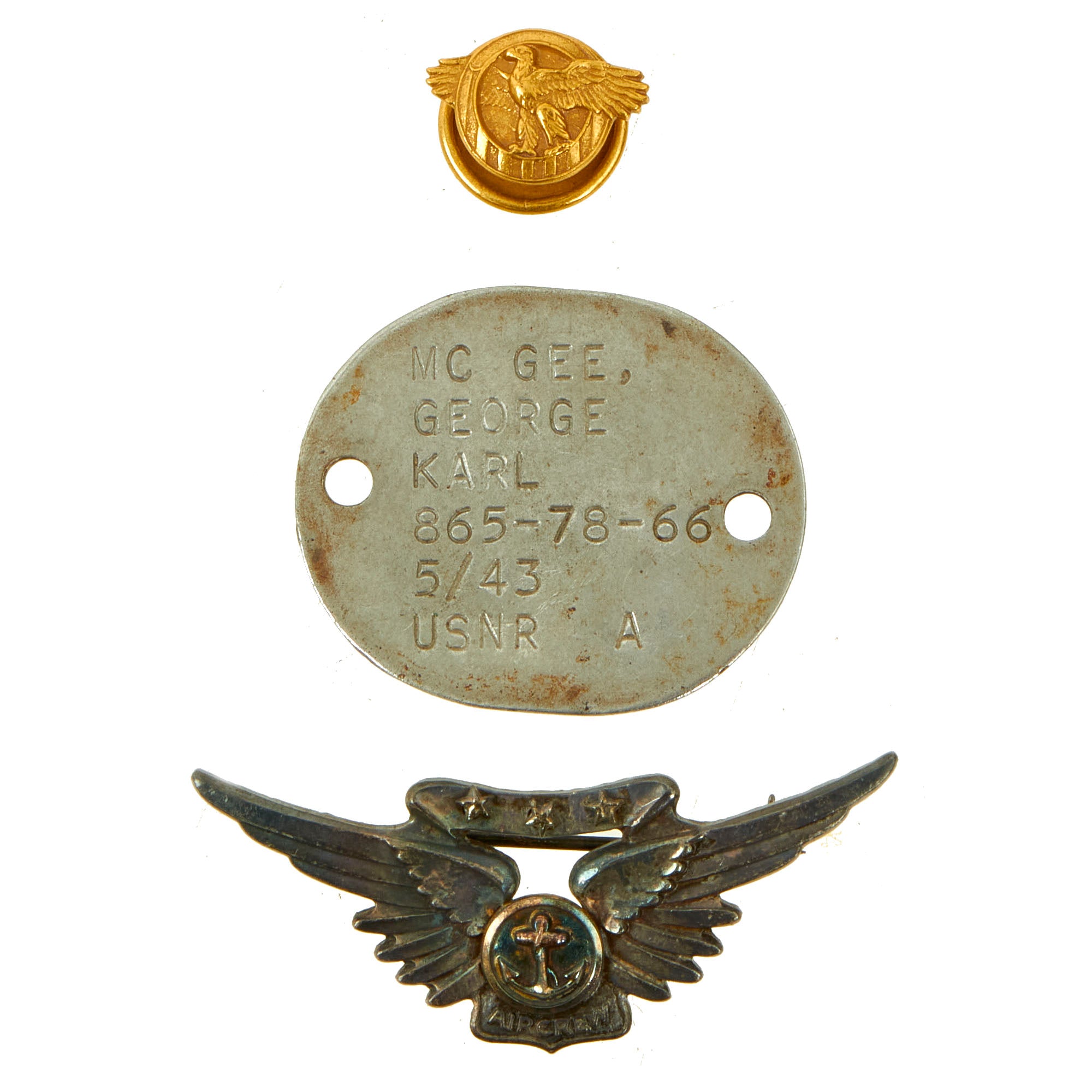 - US Navy Combat Aircrew Member Wings: United States Naval Combat Aircrew Member Badge; one piece stamped silver wings; relief of anchor on applied gold center disc; three gold stars on banner that surmounts wings; raised letter text "AIRCREW" on bar below center disc; pin back; regulation size for wear on dress uniform.