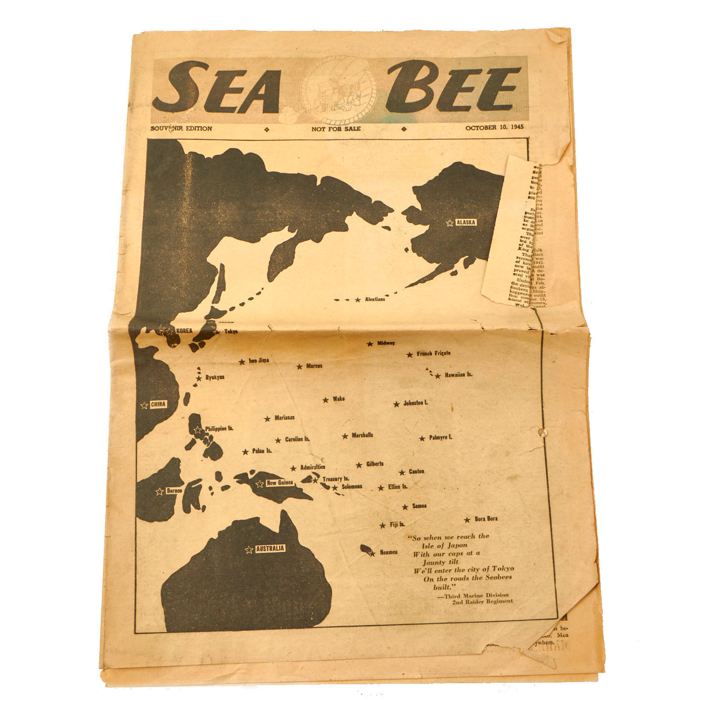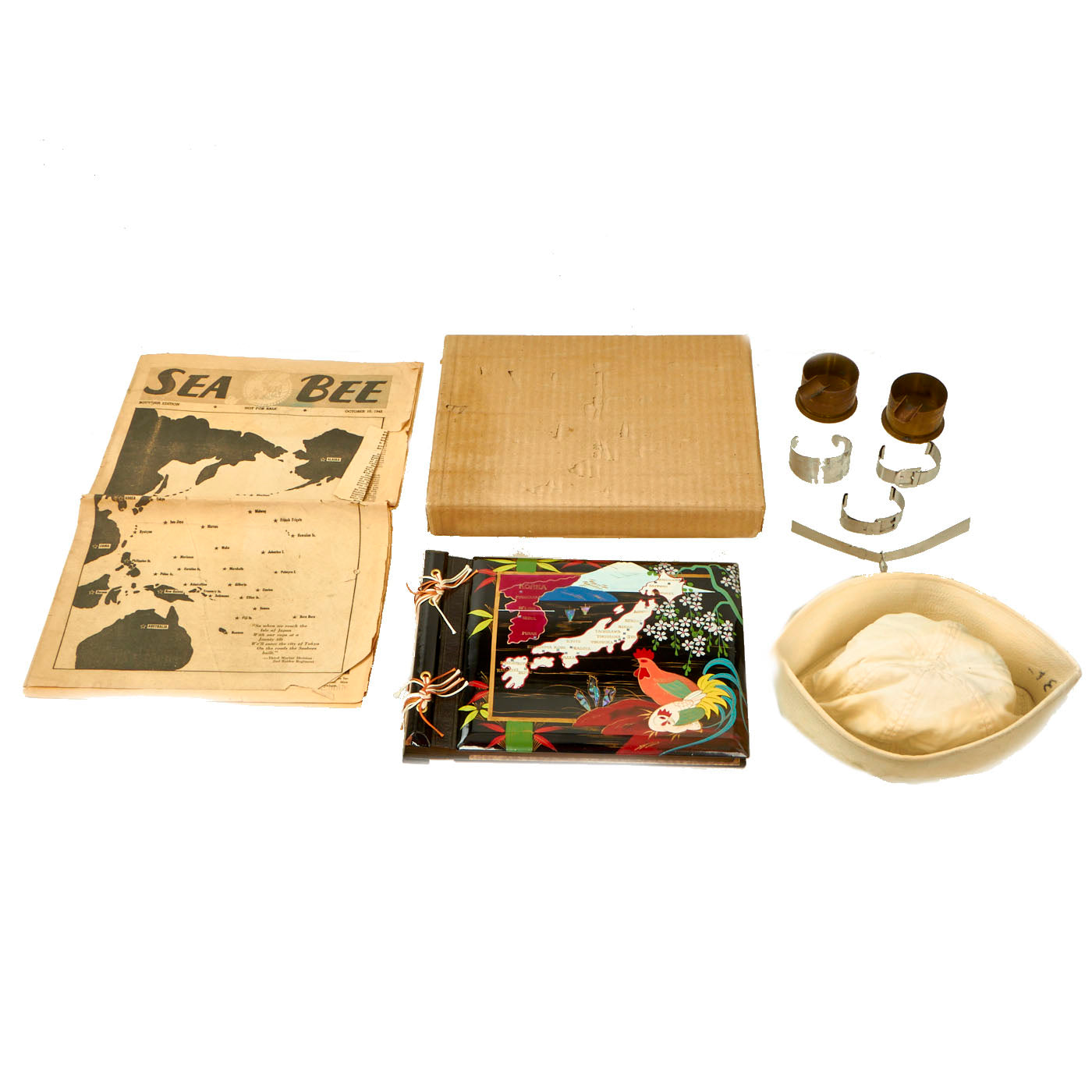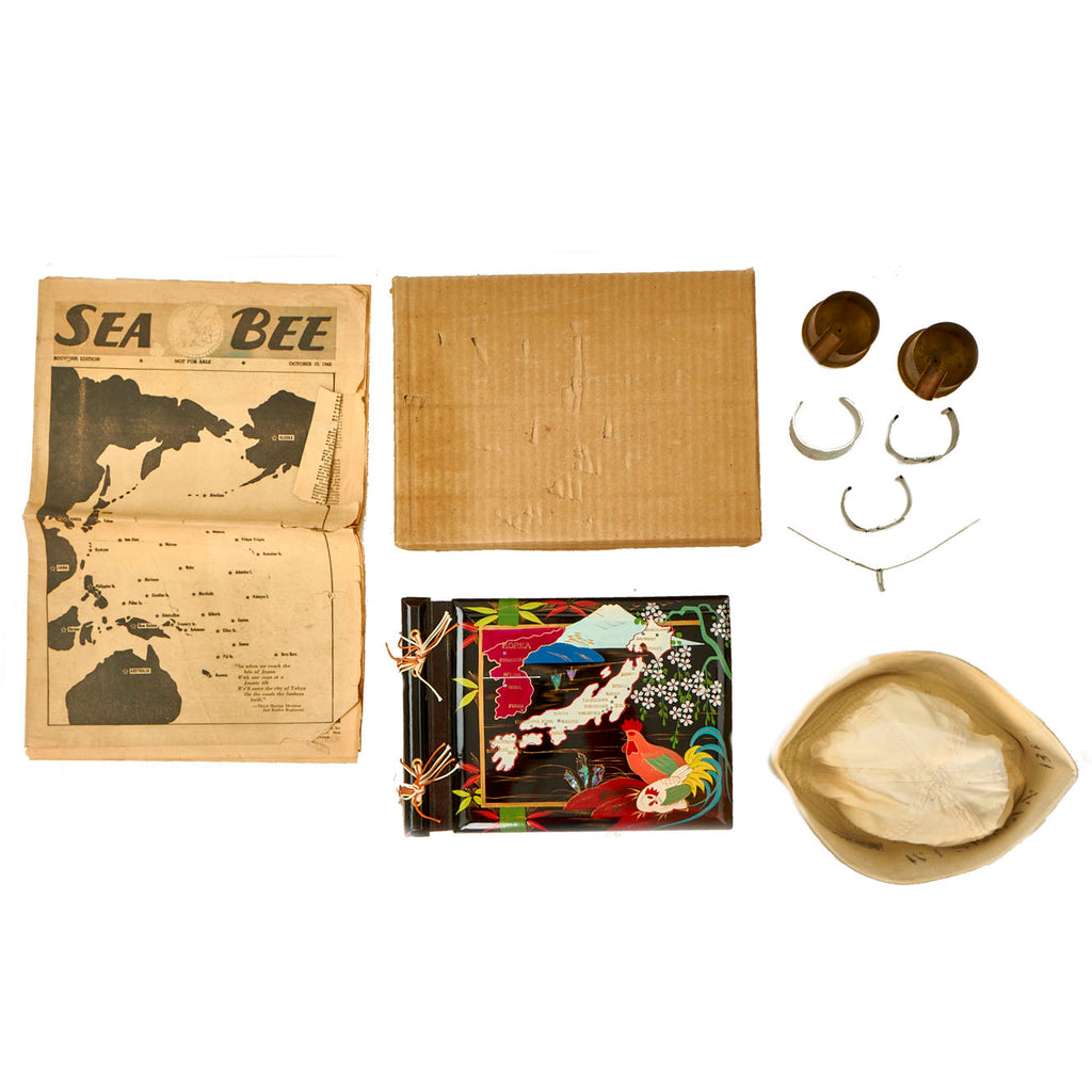 Original Items: Only One Lot of 9 Available. This is a lovely little grouping sent home by US Navy Seabee “Benny” Wiseman some time in late 1945 to early 1946. The Gilbert and Marshall Islands campaign were a series of battles fought from August 1942 through February 1944, in the Pacific theater of World War II between the United States and Japan. They were the first steps of the drive across the central Pacific by the United States Pacific Fleet and Marine Corps.