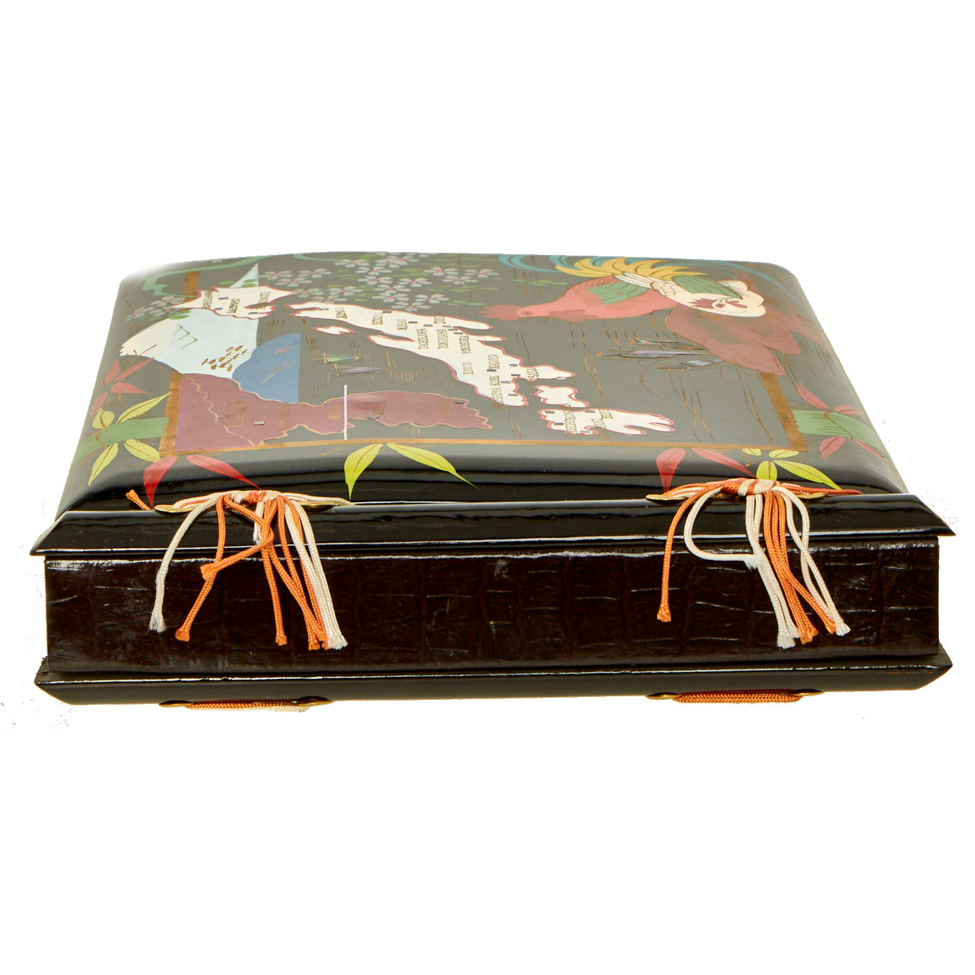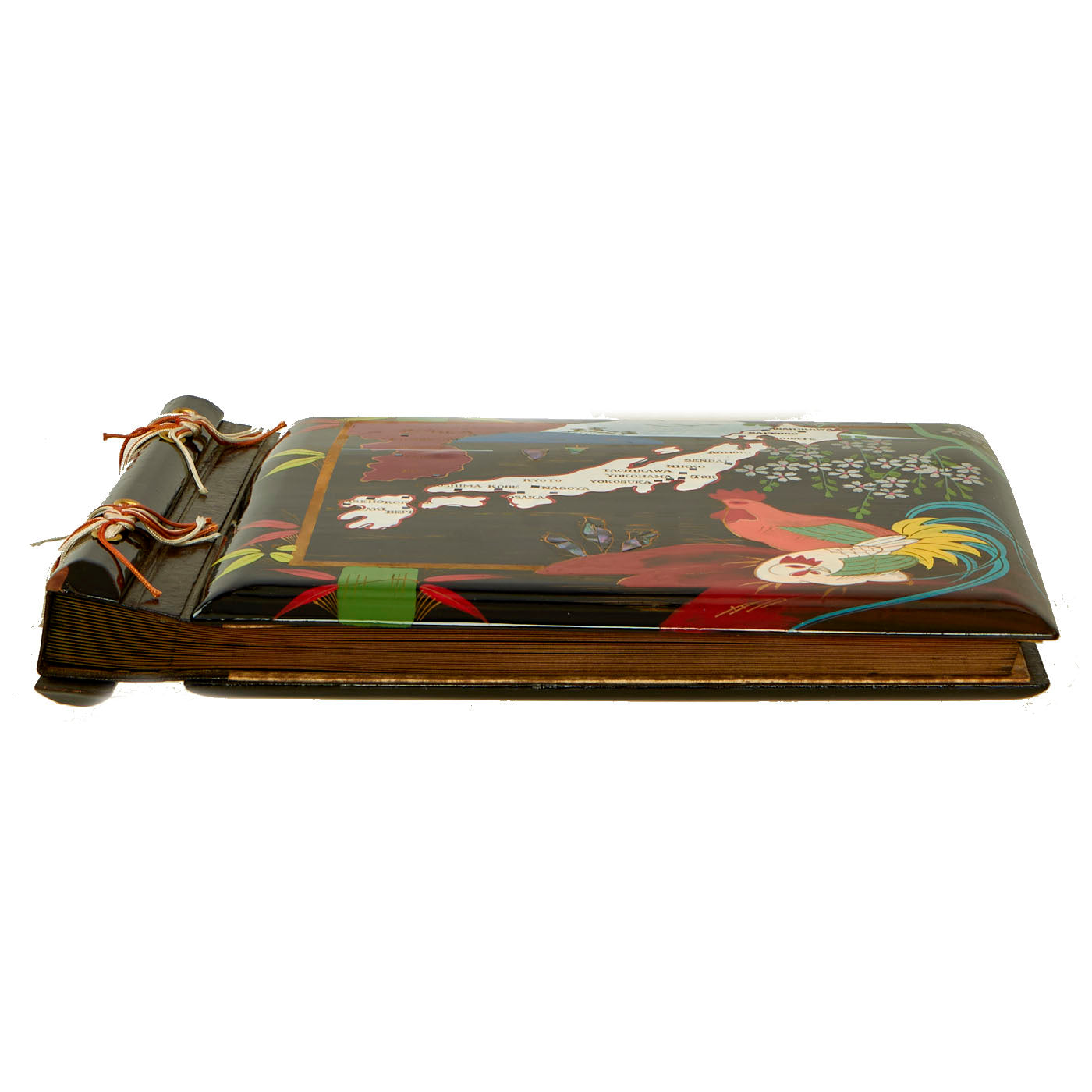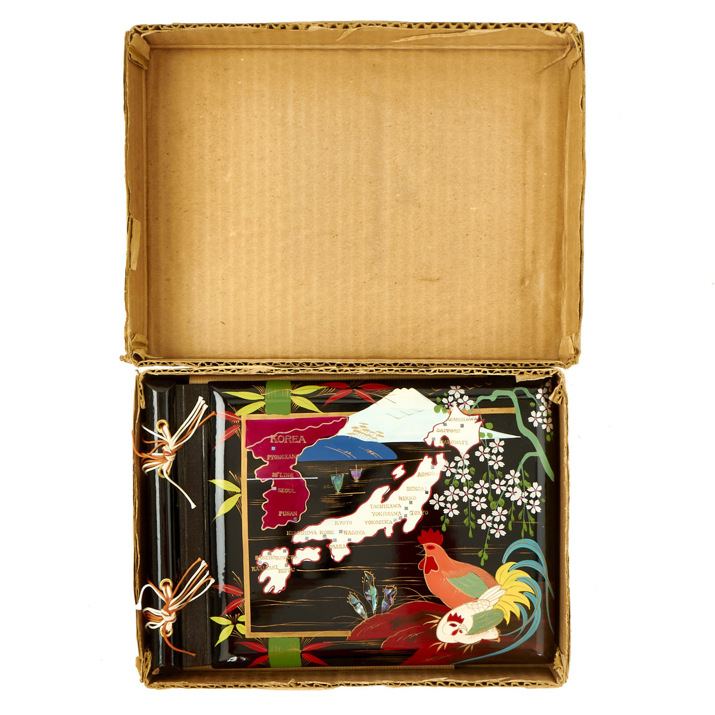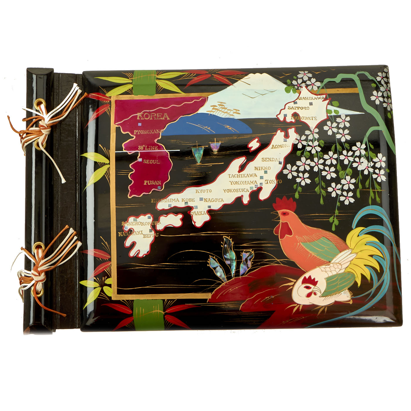 The boxed photo album is in lovely, unused condition. The wood painted album features an incredible map of Korea and Japan with key cities inlaid with what appears to be mother of pearl. This album dates to at least 1945 due to the 38th Parallel being marked on Korea, which was established in 1945 by the USA and the USSR. The album is in near perfect condition but does have minor denting in the wood present. All colors are still vibrant and intact.