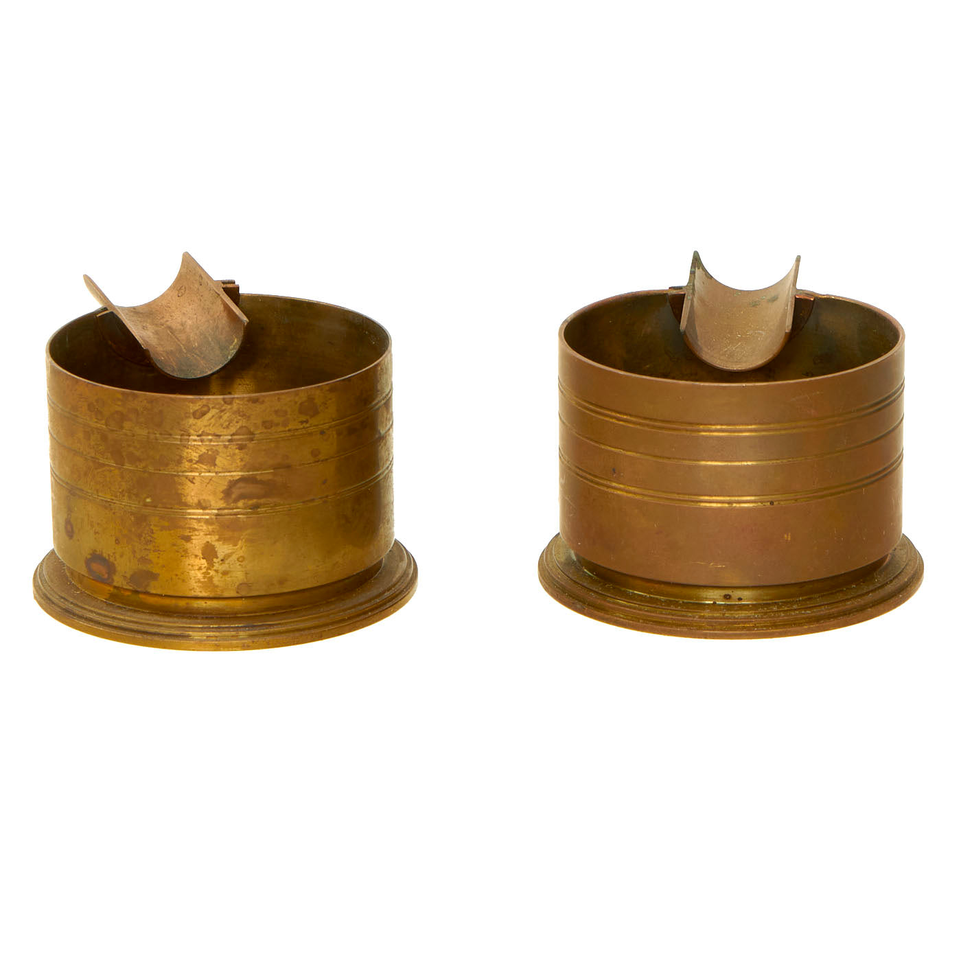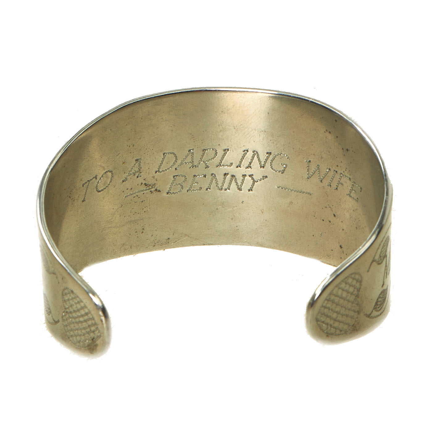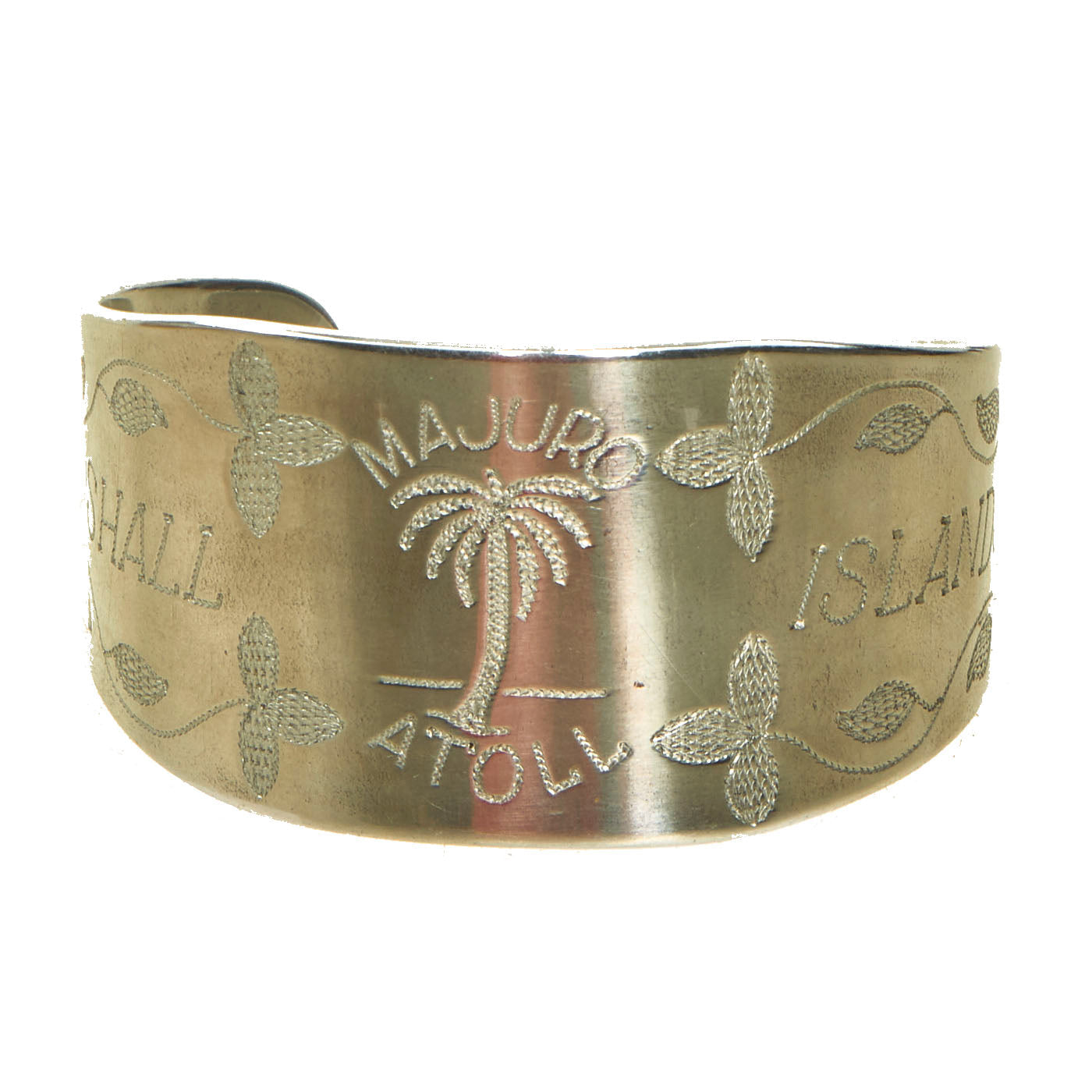 The items in the lot are actually quite lovely and unique. There are two brass ashtrays that appear to be constructed from shell casings, but no markings are present. The ashtrays both measure 2 ⅛” in diameter and stand at 1 ½” tall. The aluminum cuff band was well taken care of and was unfortunately polished at some point, removing any patina that may have been present. The cuff is undamaged and features lovely tropical motif engravings on the front a long with the words MARSHALL ISLANDS with MAJURO / ATOLL engraved above and below the central palm tree. The inside of the band is another engraving which states TO A DARLING WIFE / BENNY. The other 3 metal bands are constructed of thin sheet steel and appear to be 3 watch bands, 2 complete and one unfinished.