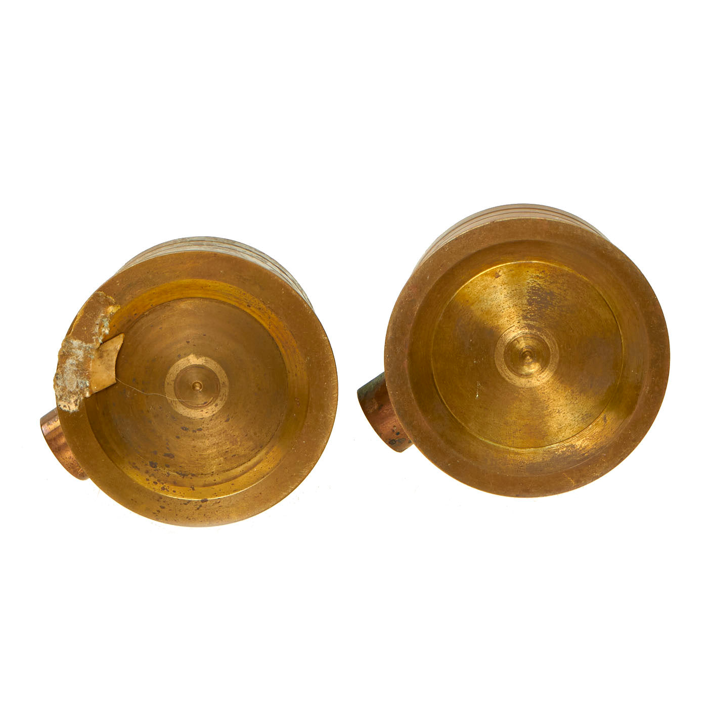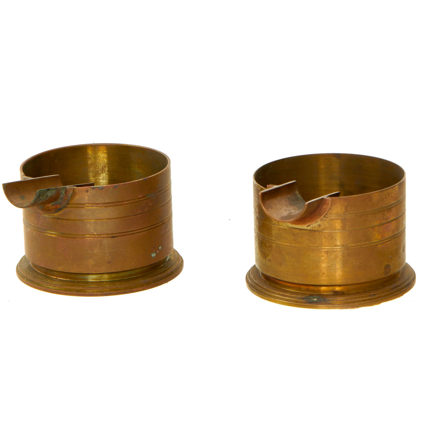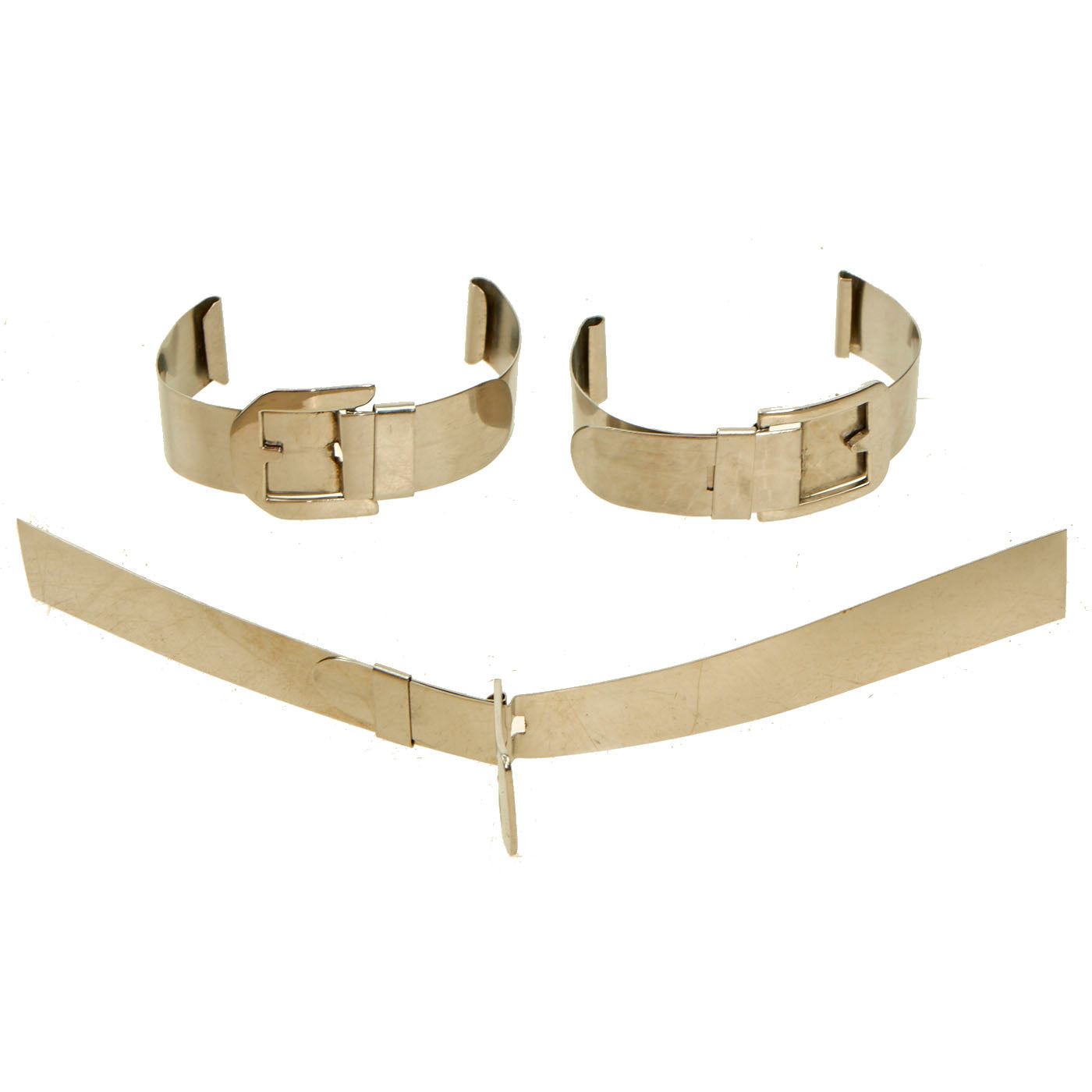 The items in the lot are actually quite lovely and unique. There are two brass ashtrays that appear to be constructed from shell casings, but no markings are present. The ashtrays both measure 2 ⅛” in diameter and stand at 1 ½” tall. The aluminum cuff band was well taken care of and was unfortunately polished at some point, removing any patina that may have been present. The cuff is undamaged and features lovely tropical motif engravings on the front a long with the words MARSHALL ISLANDS with MAJURO / ATOLL engraved above and below the central palm tree. The inside of the band is another engraving which states TO A DARLING WIFE / BENNY. The other 3 metal bands are constructed of thin sheet steel and appear to be 3 watch bands, 2 complete and one unfinished.