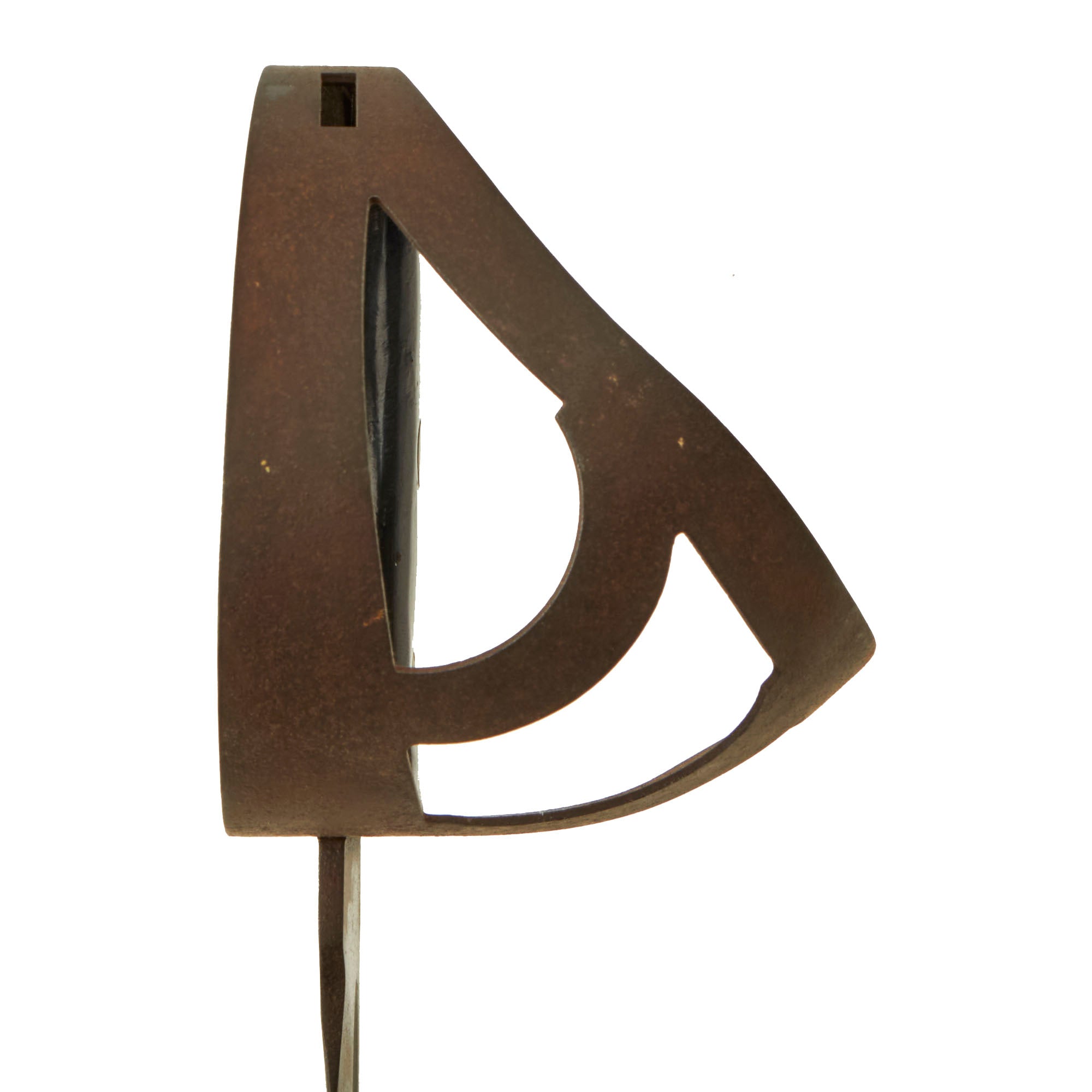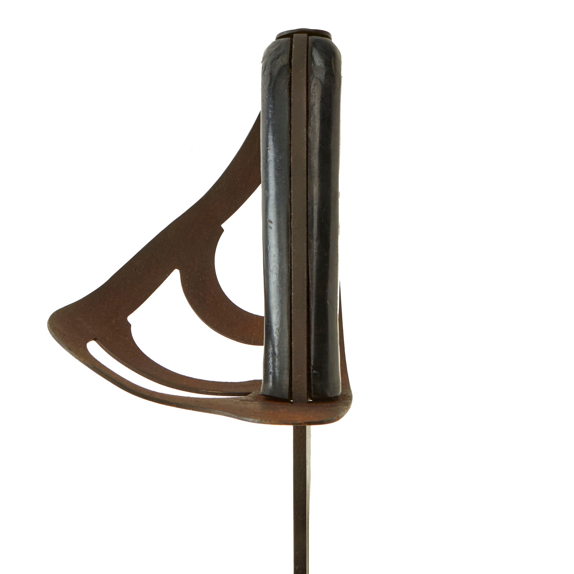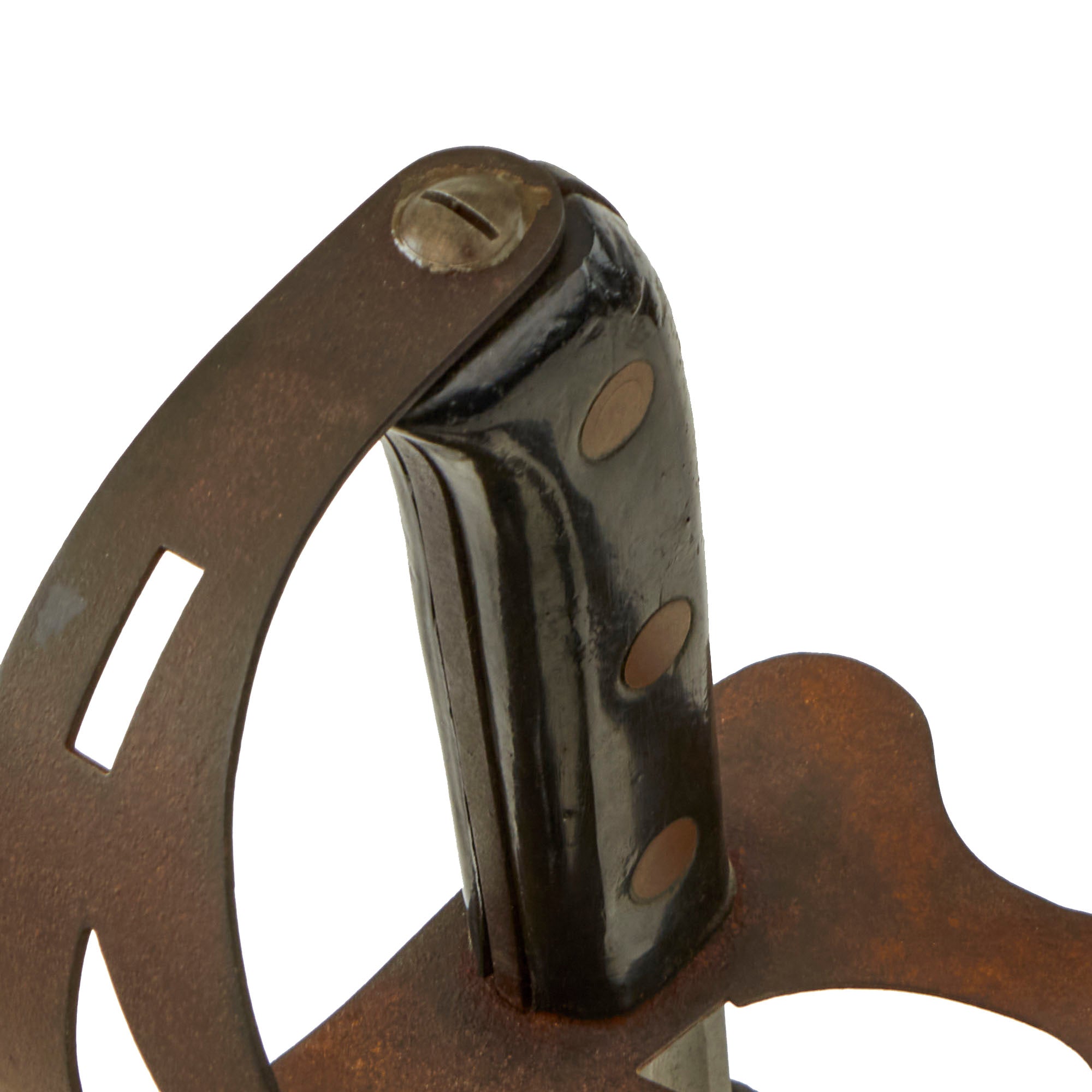 This example has an unmarked blade with an open basket (with notches) and is offered in good service-used condition. There is heavy oxidation pitting towards the tip. The M1941 has black bakelite grips which are unfortunately chipped and cracked with an unmarked ricasso. It is very hard to distinguish the differences between both the American made examples and the European examples, but we do believe this one to be the unmarked M1941 American example by Milsco.