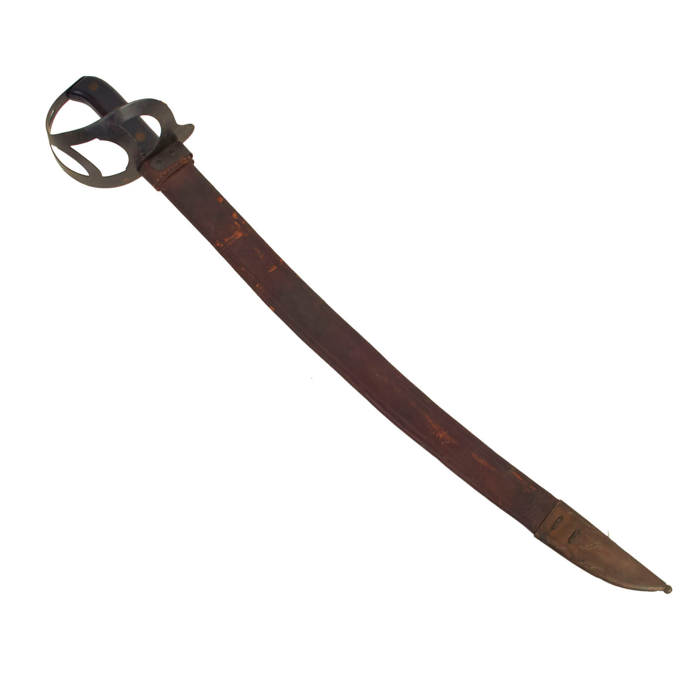 The scabbard is in excellent condition as well. There are minor scuff marks and scratching on the brown leather exterior, but they are consistent with storage wear. There is no significant damage present.