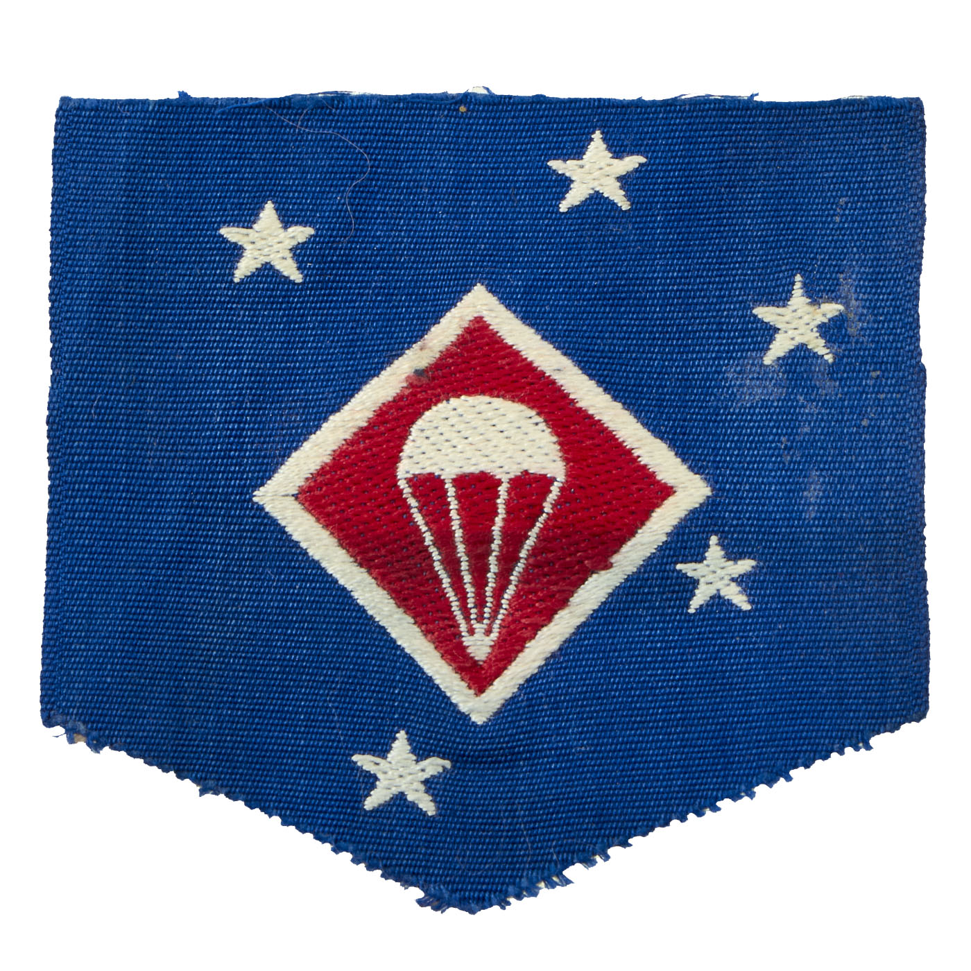 Original Item: Only One Available. This is a fantastic, unused example of the illusive Paramarines shoulder sleeve insignia, as worn by US Marine Paratroopers during WWII. These did not appear until early 1943 and were worn only on shirts, field jackets and forest green service uniforms (wools). They were rarely, if ever, worn on P41 or P42 utility uniforms during WWII.