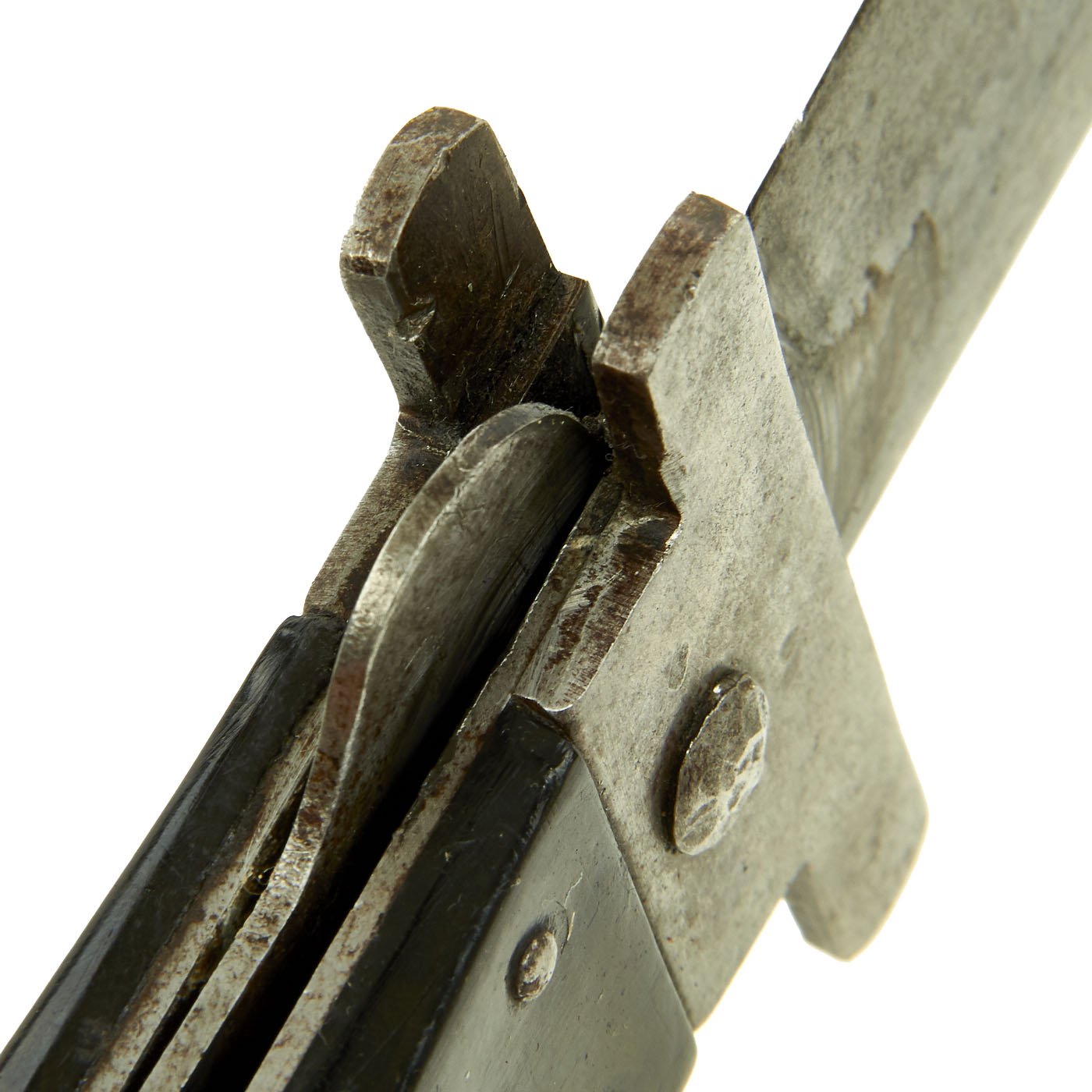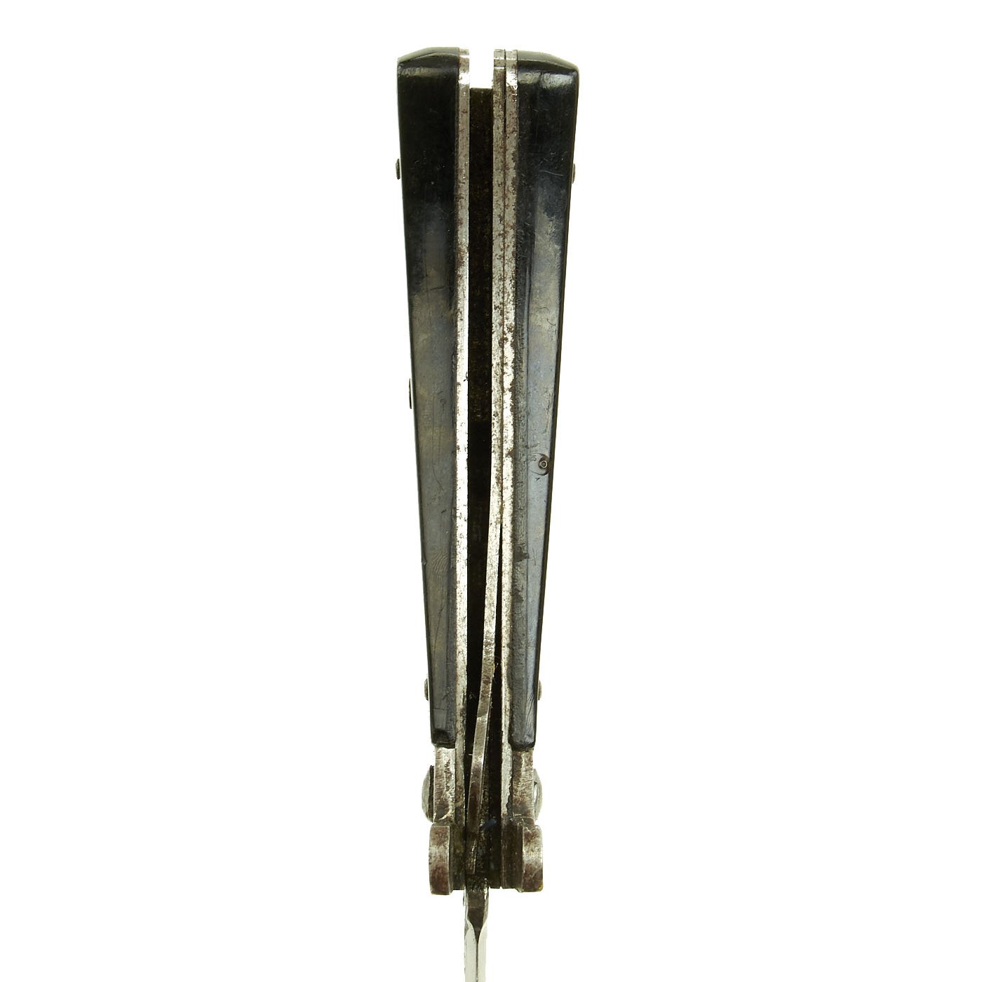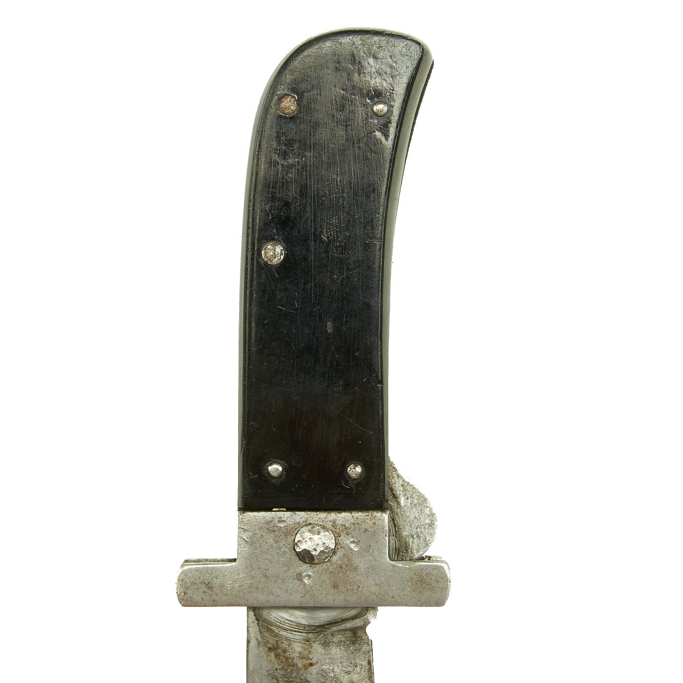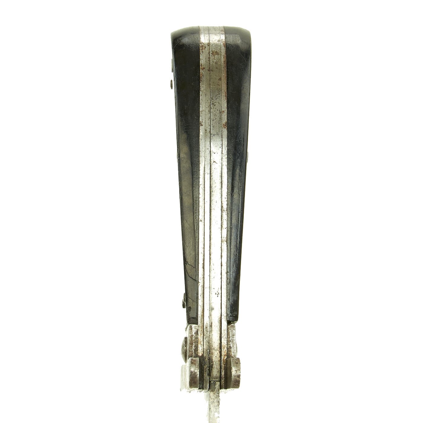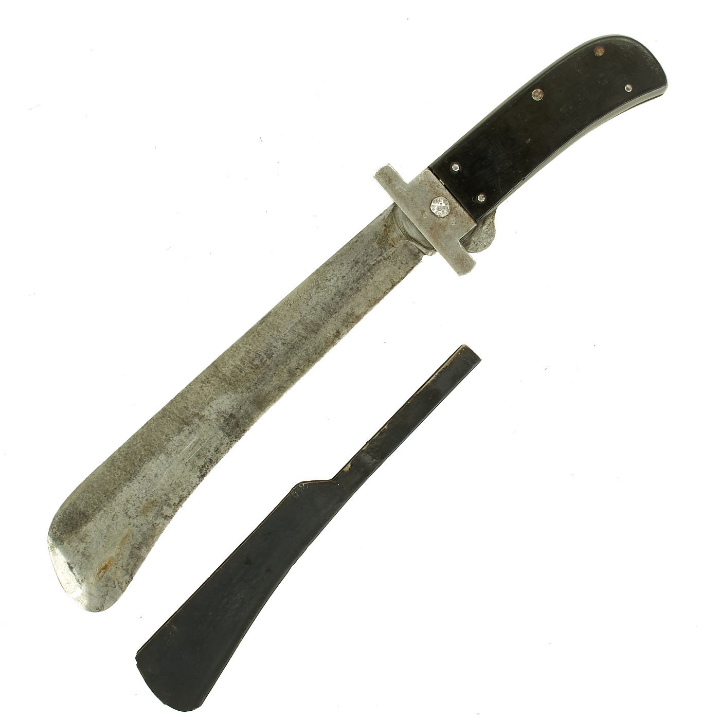 This example is in very good used condition, and still retains the blade cover, which was often lost. The blade and handle show light staining, with a bit of peppering, showing light to moderate wear. The grip is in fine condition, and has not been altered in shape. The locking mechanism works correctly, and the machete folds up as designed. The blade still retains the original shape, but does show use and some edge chipping, some of which was sharpened off in the past.