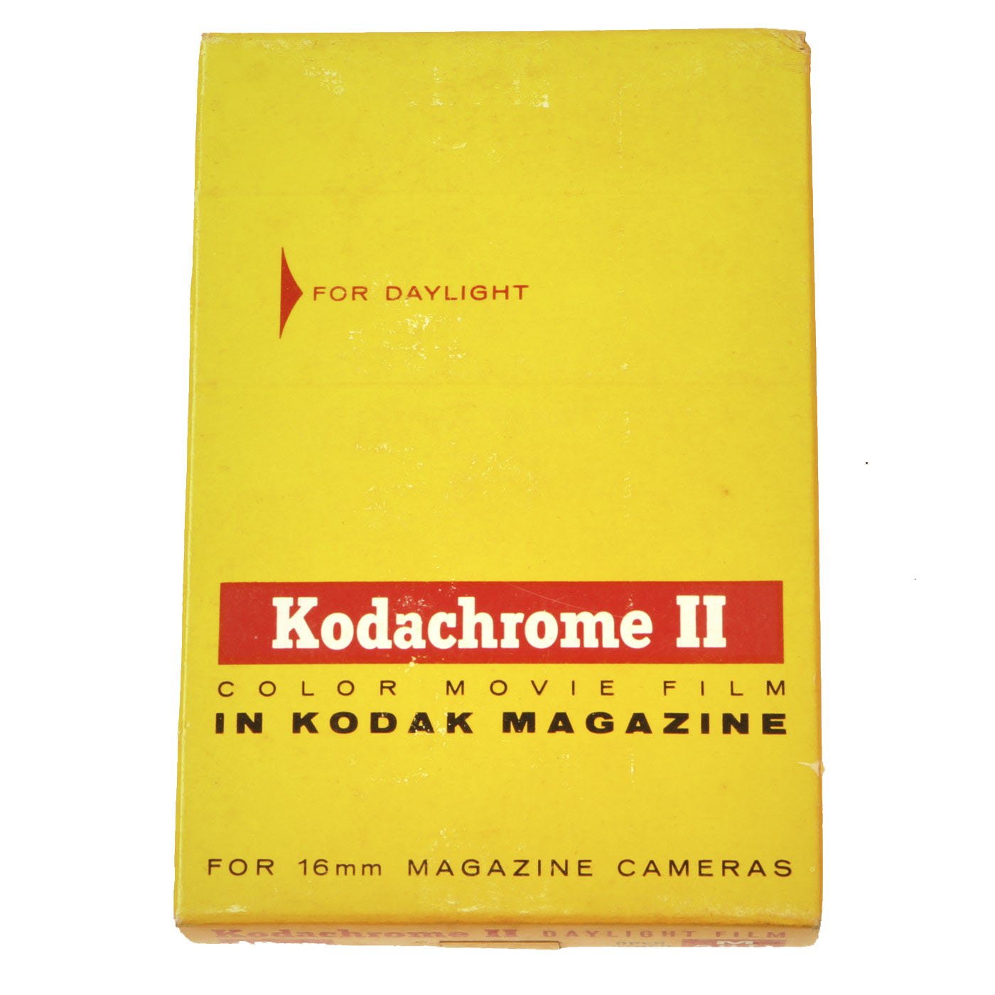 Camera shows use and age but overall good but we do not guarantee functionality. Also included are three rolls of 1960s dated 16mm Kodachrome II Film still in the original boxes.