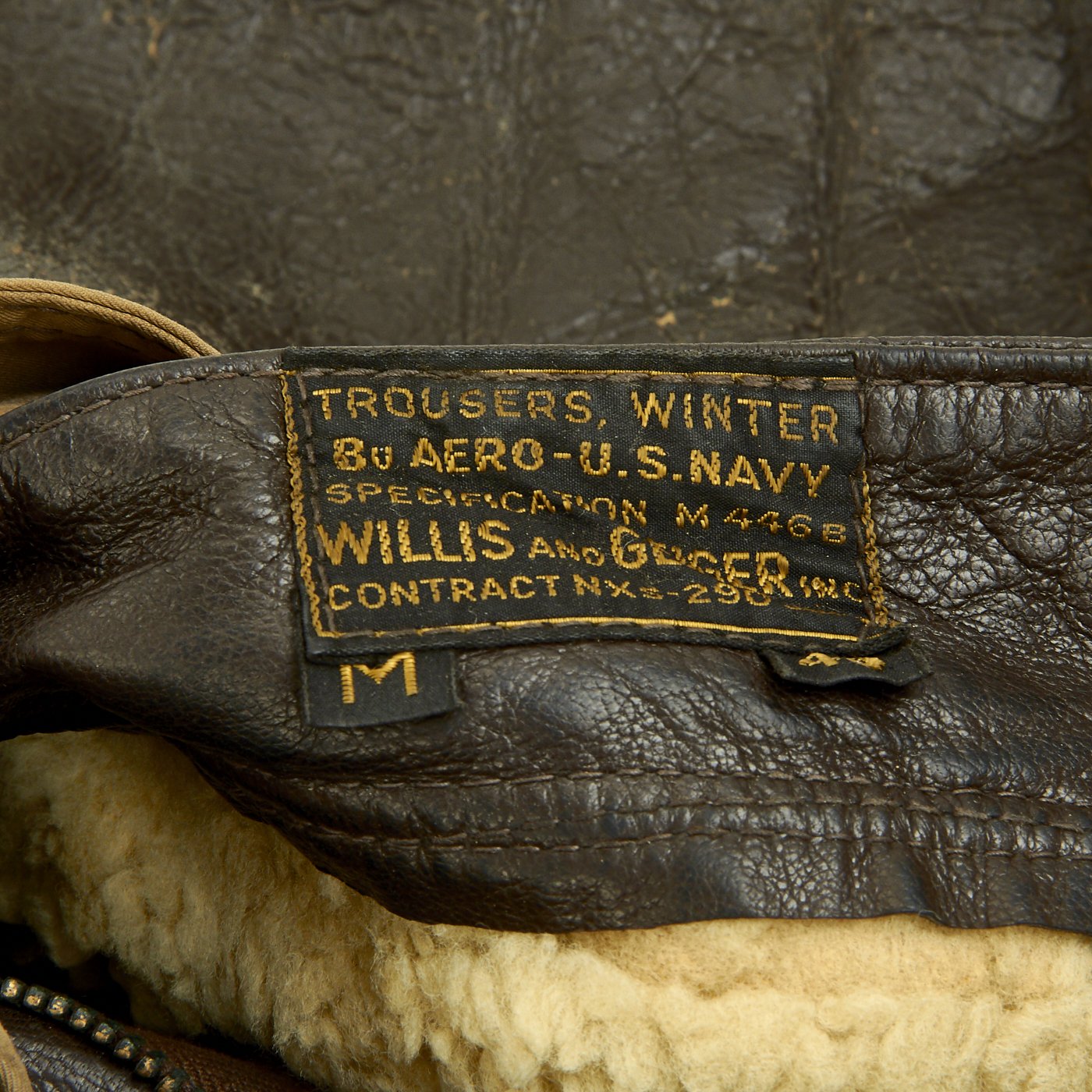 - Pants are classic type B-1 size large with suspenders and maker label by WILLIS and GEIGER. They size M 40 and are offered in excellent condition.