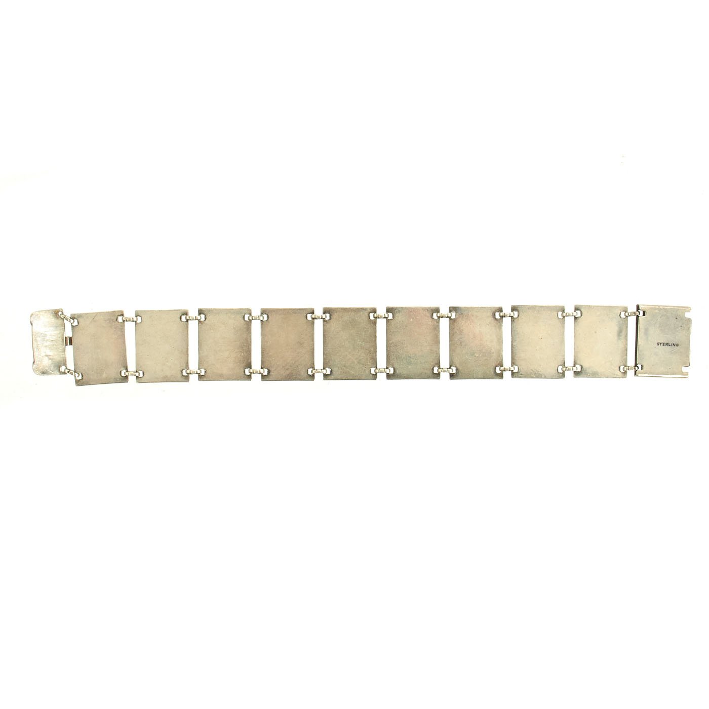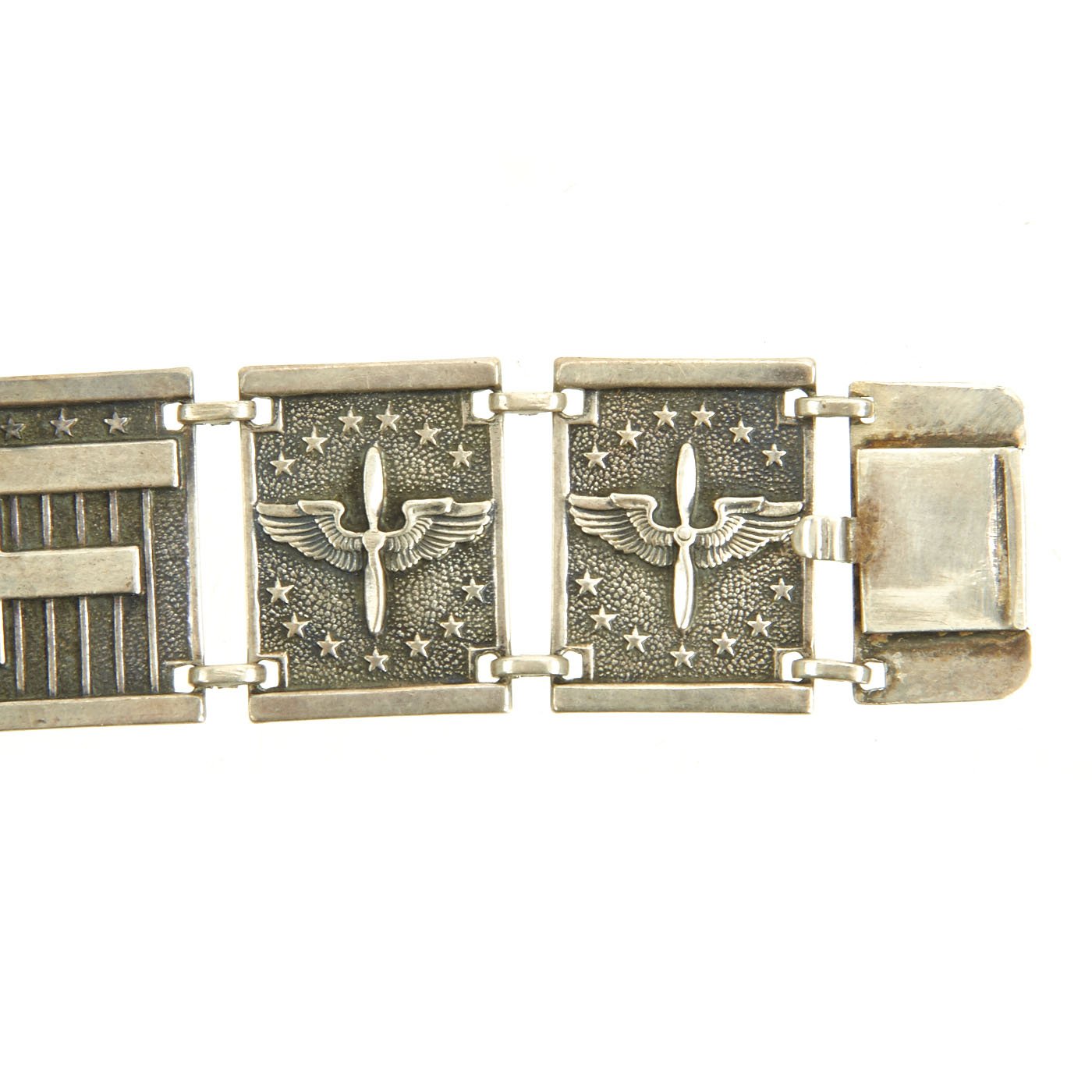 This is a very nice U.S. Army Air Forces bracelet, composed of 10 linked sections, with an end clasp that locks into the other end, securing the bracelet. The sections of this bracelet are marked with the U S A A F initials of the Army Air Forces, as well as the superimposed propeller over wings insignia of the unit, surrounded by 13 stars. The "locking" section is marked with the Torch of Liberty. The bracelet measures 7 inches over all not including the clasp section, and is marked STERLING on the back.