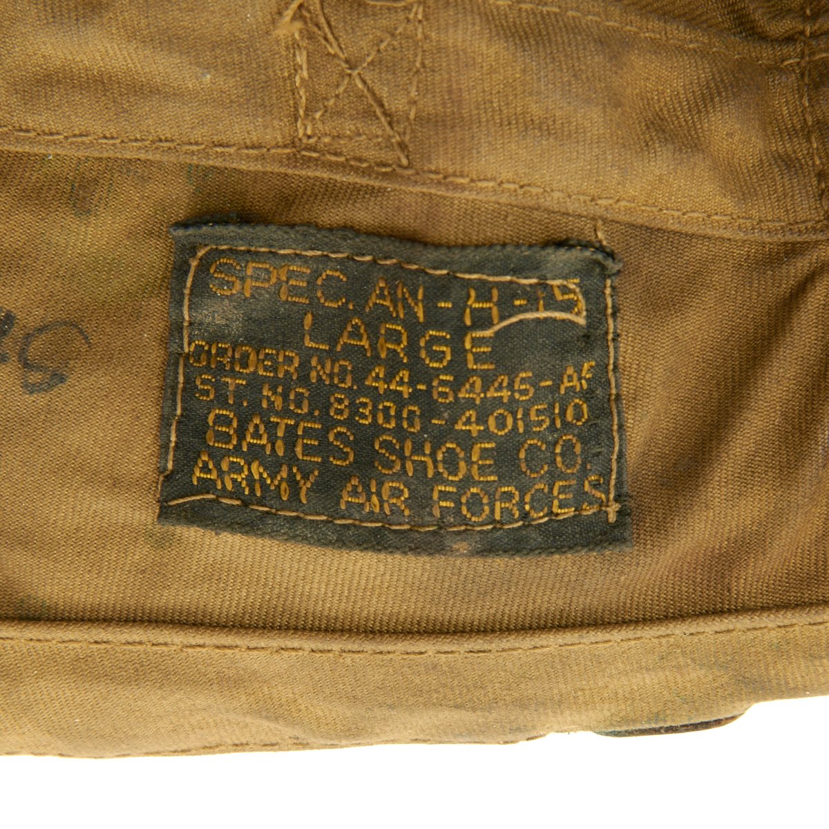 - WWII USAAF Brown Summer weight flight helmet type AN-H-15 made by BATES SHOE CO. Size LARGE offered in good used condition. The chin strap is missing, and it definitely shows wear, but it has the name SHIRPSER written inside, so this is a helmet that definitely saw use in service.